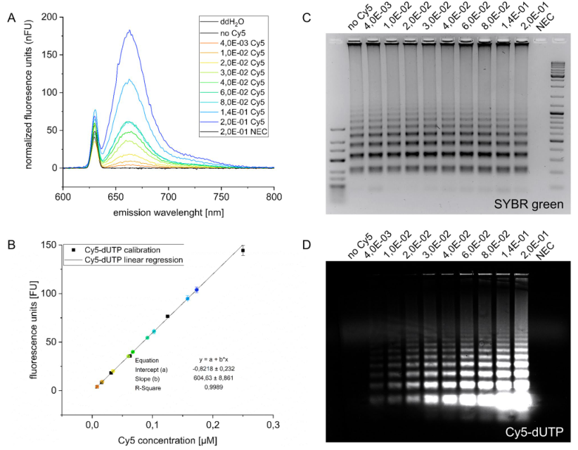 环介导等温扩增(LAMP)是最著名和最流行的等温扩增方法之一。它的简单性和速度使该方法特别适合于护理点诊断。然而,假阳性结果仍然是一个主要缺点。许多(下游)应用用于检测LAMP扩增子,如比色分析、原位LAMP或CRISPR Cas系统。通常,对于不同的检测应用,如横向流动分析,需要对LAMP产品进行修改。这通常是通过事先修饰引物实现的。 近日,来自德国的研究团队在Scientific reports上发表了一篇题为“Investigation and validation of labelling loop mediated isothermal amplification (LAMP) products with different nucleotide modifications for various downstream analysis”的文章,研究的目的是评估不同修饰核苷酸(如Cy5-dUTP、生物素-dUTP和aminoallyl-dUTP)的扩增子标记作为预标记引物的替代方案。研究团队研究了分子大小、核苷酸量以及靶浓度对扩增和标记效率的影响。这项研究表明,在LAMP过程中,使用不同的修饰核苷酸可以实现LAMP扩增子的不同标记,并且这些样品可以通过荧光光谱、凝胶电泳、微阵列和横向流动系统等广泛的下游应用进行分析。此外,研究团队还证明了基于微阵列的检测以及识别和区分假阳性的能力。 图片来源:Scientific reports LAMP背景及优劣势 2000年,Notomi等人开发了一种新的等温扩增技术,名为环介导等温扩增(LAMP)。二十多年后,LAMP属于最流行的等温放大技术。该方法基于一组多达6个引物和一个链置换聚合酶,能够高度敏感和特异地扩增少量目标DNA。结合逆转录酶,它也适用于RNA扩增(RT-LAMP)。到目前为止,在RT-LAMP、RIME-LAMP或DARQ-LAMP等多个变体版本中,可以找到超过千份使用该技术的出版物。自2019冠状病毒疾病大流行开始以来,已经发表了800多篇关于SARS-CoV-2检测的出版物。其中,大约有100个是用LAMP作为检测方法的。这不仅强调了LAMP对一般研究的重要性,也强调了它对当前全球重要问题的重要性。 与基于PCR的非等温方法相比,使用LAMP进行核酸扩增和检测具有许多优势。首先是放大速度。通过使用合适的引物组和最佳扩增条件,可以在不到30分钟的时间内检测到少量目标核酸,而PCR过程的扩增时间最多为3小时。此外,由于对能源和技术设备的需求减少,护理点设备中集成和使用LAMP是非常方便的。尽管LAMP有许多优点,但由于污染、序列相似性和引物二聚体引起的扩增假阳性是众所周知的LAMP缺点。 LAMP扩增产物的检测方法 LAMP与下游分析系统结合检测扩增产物的方法很广泛。包括标准凝胶电泳和定量扩增LAMP(qLAMP),通过不同的比色试剂(酚红、无色结晶紫、SYBR绿、孔雀石绿)进行横向流动分析(LFA)或与CRISPR-Cas系统的组合。最常用的是LFA和比色分析,但上述技术的主要局限性在于,它们不适合区分假阳性结果。基于微阵列的检测方法有助于克服这一障碍。 长度约为20–30 nt的特异性单链DNA探针固定在修饰表面上。扩增后,产物可以在这些探针上进行高度特异性杂交。通过选择合适的探针,不仅可以将扩增子与假阳性区分开来,甚至可以将其与单核苷酸多态性(SNPs)区分开来。 使用(半)定量分析系统(如qLAMP)和基于横向流动的方法需要标记用于目标检测的扩增子。到目前为止,使用预先标记的引物或探针一直是首选方法。这也导至了低灵活性和高成本、信号强度或放大效率调整不灵活性。或者,可以在扩增过程中使用预先标记的核苷酸进行靶向标记。这些类型的核苷酸具有不同的修饰,例如荧光团、生物素或氨基功能化,用于随后的定制标记。 灵活的LAMP标记方法 本研究旨在分析和评估所述基于直接和灵活的LAMP标记方法。此外,还证明了用3-Cy5-dUTP、生物素-dUTP和AA-dUTP标记LAMP扩增子的优缺点,代表了小、中、大尺寸的核苷酸修饰。 上述核苷酸修饰不仅具有不同的分子大小,而且在不同的分析和检测系统中也有用。Cy5-dUTP可用于用荧光团直接标记扩增子,用于多种荧光检测方法,结合生物素dUTP可在常用LFA中的链霉亲和素修饰表面上实现非共价固定。AA dUTP被认为允许加入一个功能基团,这可能有助于后续NHS分子的标记。 LAMP-dUTP标签策略及应用。 图片来源:Scientific reports x-dUTP掺入对LAMP效率的影响 为了确定在LAMP期间使用标记核苷酸对扩增效率的影响,使用不同量的SARS-CoV-2 cDNA和Cy5-dUTP以及生物素-dUTP和AA-dUTP稀释系列进行了基于SYBR绿色的定量环介导等温扩增(qLAMP)。每个反应的cDNA量为4.2E+00ng,Cy5-dUTP浓度范围为4.0E-03mM到2.0E-01mM,在不到5分钟的时间内检测到目标DNA。使用该量的靶DNA的反应效率只有轻微差异。然而,当使用较低数量的靶DNA时,已观察到扩增效率降低。 标记核苷酸对扩增效率的影响。 图片来源:Scientific reports 与未标记的核苷酸相比,Cy5-dUTP是一个相对较大的分子,因此研究团队研究了使用不同分子大小的各种dUTP标签对扩增效率的影响。对于AA-dUTP(589.2 g/mol)、生物素-dUTP(862.7 g/mol)和Cy5-dUTP(1387.3 g/mol),在以分子量表示的分子大小和所需的扩增时间之间发现了明显的相关性。未标记的参考样品的Ct值为15.6分钟。使用生物素dUTP和AA dUTP标记也会导至Ct值小于16.5分钟。使用Cy5 dUTP对扩增时间的影响最大,Ct值偏移为3.5分钟。 分子大小和浓度的影响。图片来源:Scientific reports Cy5-dUTP掺入和分析 通过Cy5-dUTP直接标记和AA-dUTP间接标记以及随后的NHS-Cy5标记,计算Cy5掺入LAMP扩增子的速率。LAMP扩增产物通过荧光光谱分析,记录在630nm激发下600 nm至800 nm范围内的发射光谱(图4A)。所有样品(Cy5稀释系