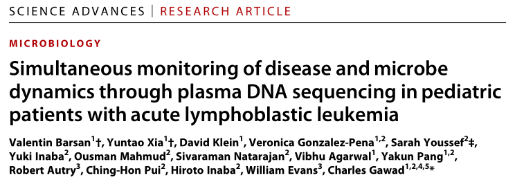 无细胞DNA(cfDNA)测序有望成为一种非侵入性诊断工具,用于评估母婴健康、早期检测癌症和监测治疗反应,以及以识别感染性微生物。急性淋巴母细胞白血病(ALL)是最常见的儿童癌症,尽管在过去50年中预后有显著改善,但仍然是儿童癌症相关发病率和死亡率的主要原因之一。此外,由于当前细胞毒性疗法的免疫抑制和骨髓抑制后果,感染性并发症仍然是治疗相关死亡率的主要原因。 几十年来,血浆中cfDNA的存在已为人们所知。根据DNA测序技术的进展,循环肿瘤DNA(ctDNA)目前正在被评估为恶性肿瘤症状前检测的生物标记物,以及监测反应和指导治疗的工具。迄今为止,大多数研究都是在实体瘤上进行的,其中ctDNA监测越来越显示出诊断和预后价值,有可能改善癌症患者的预后。无细胞RNA测序和核小体印迹显示,造血细胞是健康个体循环核酸库的最大来源,这表明与实体肿瘤相比,ctDNA监测在检测造血源性肿瘤方面可能更为敏感。 血浆中非人类DNA的鉴定和定量也显示出作为诊断传染病和监测人类病毒组的策略的前景。研究表明,微生物cfDNA(mcfDNA)测序能够更快速地检测稀有物种以及通过常规细胞培养方法难以检测的病原体。例如,最近发现,鸟枪式mcfDNA测序可以预测患有癌症的儿童患者即将发生的感染。mcfDNA测序敏感性的提高可以进一步确立微生物测序在诊断和预测感染性并发症方面的临床实用性。提高mcfDNA检测灵敏度的一种策略是丰富微生物特异性序列。 近日,一个以斯坦福为主的团队在 Science advances 杂志上发表了一篇题为“Simultaneous monitoring of disease and microbe dynamics through plasma DNA sequencing in pediatric patients with acute lymphoblastic leukemia”的文章。在本研究中,研究团队试图开发一种方法,同时监测ALL患儿的两个主要死亡原因:(i)疾病持续或复发;(ii)免疫抑制环境中的感染性微生物。为了实现这一点,研究团队开发并评估了一种新的基于捕获的超深测序策略,该策略在接受诱导化疗的ALL患者的血浆中富集了白血病特异性突变和潜在微生物。结果显示,这种方法可以检测和监测大多数患者的白血病,并确定在患者接受治疗时特定的ctDNA动态模式。此外,通过比较细胞与ctDNA变异等位基因组分(VAF),研究团队发现在诊断时进行侵入性骨髓检查以分离恶性细胞对于分析小的基因组变异可能是不必要的,因为在两种样本类型中检测到相似的变异频率相当。 图片来源:Science Advances 研究概述 在临床试验中,共有168份样本接受了测序,这些样本是从20名新诊断ALL患者中前瞻性收集的,他们接受了为期6周的诱导治疗。从外周血(PB)和骨髓中收集细胞和血浆(无细胞)组分,以便比较白血病相关突变和感染性微生物DNA的不同潜在储存库(图A)。panel覆盖率(图B)在目标序列上是均匀的,在12884次读取的平均深度上覆盖了100%的目标区域。 诊断时,平均血浆cfDNA产量与非细胞骨髓(NCBM)cfDNA产量相似(平均值分别为85 ng和75 ng)。在诱导化疗的前几天,血浆cfDNA产量增加,可能是由于开始治疗后白血病细胞迅速死亡所致。NCBM cfDNA产量在第15天达到峰值,这表明骨髓中的细胞仍然以比PB中的白血病细胞更高的速度和更晚的时间点死亡。此后,在整个诱导治疗过程中,cfDNA浓度保持在10 ng/ml左右,而在诱导治疗后期,NCBM cfDNA产量增加(图C),这可能反映了诱导治疗后再生造血细胞的更新。 工作流程、质量控制指标和cfDNA产量。 图片来源:Science Advances 诱导治疗期间VAF突变清除的患者动力学 在20名患者中,有17名患者(85%)在诊断时,ctDNA NGS识别出一种或多种变体(图A)。诱导化疗过程中的突变清除几乎是普遍观察到的。每个患者平均有2.3个可检测的突变(范围为0到5;标准差为1.3)。检测到39个独特突变,只有一个共享突变实例(病例3和16中的KRAS p.G13D)。当患者接受诱导化疗治疗时,观察到不同的变异等位基因清除模式。一般来说,在整个诱导治疗过程中,VAF都会先增加后减少(图B),这与化疗药物的药代动力学和细胞快速死亡一致。在这段时间内,这些基因座的覆盖率保持不变。16例患者中有8例(71%)发现的躯干突变(truncal mutations;定义为NCBM和PB中等位基因频率均大于0.25),包括NOTCH1、NRAS、KRAS、JAK2、NF1和ADGRL2基因。 患者队列中纵向清除率的变异。 图片来源:Science Advances 诱导期间观察到的微生物入侵 研究团队建立了同时检测细胞和cfDNA中病毒、细菌和真菌微生物物种的技术可行性。五名健康对照组和五名诊断为急性髓细胞白血病(AML)的患者的mcfDNA作为对照组。 结果显示,研究团队发现mcfDNA的变化是动态的(图B)。与健康对照样品相比,ALL患者中检测到的主要微生物种类发生了变化。例如,在所有健康样本中都检测到了Ralstonia菌属,但在126份ALL样本中仅一例检测到此菌属。相反,在大多数样本中均检测到Cutibacterium,但在健康对照组中均未检测到表皮细菌,这可能代表共生皮肤细菌入侵人类宿主的能力。在一部分患者中检测到已知的导至ALL患儿死亡的芽孢杆菌Bacillus。对于真菌DNA,60%的健康对照组和17个诊断性所有样本中的13个(82%)检测到Malassezia,但AML样本均未检测到。 诱导期内细胞骨髓、NCBM和PB中的微生物(病毒、细菌和真菌)丰度。图片来源:Science Advances ALL患者诱导治疗期间的动态病毒组 PB诱导治疗期间病毒种类检测的趋势表明,每个病例检测到的病毒种类具有可重复性(图A),并与健康对照组和五个年龄匹配的AML病例进行比较。所有