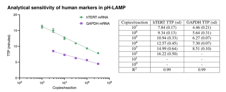 在高收入国家,有效的宫颈癌筛查降低了其发病率和死亡率,但在全球范围内,2020年估计有600000例宫颈癌病例,342000例死亡。其中90%以上发生在中低收入国家(LMICS)。宫颈癌发病的唯一最重要的致病因素是HPV感染。病毒基因组整合到宿主染色体中,使得病毒癌基因HPV E6和E7能够通过干扰有丝分裂期间的着丝粒复制来促进基因组不稳定性。这导至了染色体重排和拷贝数变异。因此,通过Hybrid Capture-2或G5+/6+分析进行HPV DNA初步筛查,需要使用聚合酶链反应(PCR)和昂贵的热循环设备进行信号扩增或靶向扩增,被认为是宫颈癌检测的有效方法。 用Lugols碘或醋酸目视检查宫颈是一种潜在的低成本替代筛查策略,但对患者来说很不舒服,并且存在与目视检查相关的偏差。利用HPV以及肿瘤特异性标记物进行核酸扩增,进行一项可靠、易于实施的护理点检测,将是全世界宫颈癌检测的重要分诊工具。对于宫颈癌检测,选择最佳的HPV和肿瘤标记物至关重要。据报道,HPV-16和HPV-18导至高达70%的宫颈癌病例,分别约有60%和10%的病例出现;其他流行的HPV类型的发生率因地区而异。此外,癌细胞的增殖能力部分是通过端粒维持实现的,而端粒酶在HPV阳性癌症中普遍表达。hTERT(人类端粒酶逆转录酶)是一种端粒酶成分,在宫颈病变中显著过度表达,至少在90%的宫颈癌中可检测到,但在正常组织中呈低至零表达。因此,它是一种潜在有用的肿瘤特异性标记物。 环介导等温扩增(LAMP)方法已用于DNA和RNA的护理点检测,包括SARS-CoV-2和乳腺癌标记物。LAMP最初由Notomi等人开发,用于在单一温度下(通常在63到65度之间)快速扩增核酸无需PCR仪,从而使该技术成为护理点检测的理想技术。LAMP最初设计有四个引物,但Nagamine等人将其扩展到六个,会显著加速反应从1小时至10-15分钟。 近日,来自英国的研究团队在杂志Scientific reports上发表了一篇题为“Lab-on-chip assay of tumour markers and human papilloma virus for cervical cancer detection at the point-of-care”的文章,研究团队使用针对HPV DNA和hTERT mRNA的优化设计引物,将LAMP技术转化为LoC设备,并测试其检测宫颈癌的能力。LoC上的LAMP技术已被应用于乳腺癌生物标记物的检测和包括2019冠状病毒疾病在内的传染病诊断。LoC设备基于CMOS技术和离子敏感场效应晶体管(ISFET)传感器,与环介导等温扩增(LAMP)分析相结合,用于扩增HPV DNA和人类端粒酶逆转录酶(hTERT)mRNA。分子靶点的分析灵敏度达到每个反应一个拷贝的mRNA标志物,实现了hTERT的100的检测限。在组织样本中,4/5的恶性组织和2/5的良性组织中存在HPV-16 DNA,1/5的恶性组织和1/5的良性组织中存在HPV-18 DNA。在所有恶性组织和非良性组织中均检测到hTERT mRNA,已证实的试点数据表明,在资源有限的情况下,大规模使用LoC进行宫颈癌筛查的潜力。 图片来源:Scientific reports 主要内容 检测限和TTP 对hTERT和GAPDH mRNA的LAMP分析采用10倍的连续稀释的合成RNA进行测试,每个反应范围为10 7到10 0拷贝。标准曲线如图1所示,具有良好的线性关系(R 2=0.99),检测限分别为100和1000份/反应,最大TTP(阳性时间)分别小于20和10分钟。 合成RNA中测试检测限和TTP。 图片来源:Scientific reports pH-LAMP中人类标记物的分析灵敏度。 使用LOC对45份来自当地组织采集的可用样本中的10份进行了HPV DNA和hTERT mRNA验证,其中DNA和RNA的数量和质量表明由于细胞数量多,提取效果良好。根据病理学分类,在这10个宫颈活检标本中,有5个良性,4个鳞状细胞癌(SCC)和1个腺癌(ADC)。 使用LC96设备,在样品H5、H7、H17和H27中检测到HPV-16 DNA,而在样品H11和H45中检测到HPV-18 DNA。LoC平台成功确认了检测结果,所有结果总结在表1中。两例(H2和H12)在使用pH-LAMP的LC96设备上HPV-16 DNA呈阴性,但在LoC平台上测量时呈阳性。使用PCR引物证实这些样本中存在HPV-16 DNA。为了解释这种差异,可能是这两种样本中的HPV-16 DNA拷贝数都处于检测极限,LoC上的较大样本检测体积能够检测到检测极限边缘的较低拷贝数。在5/5的癌症样本和0/5的良性样本中检测到hTERT mRNA的存在,完美地区分了肿瘤样本中的良性样本,使用LoC平台证实了结果。系统之间近乎完美的一致性表明了该平台用于进一步检测的潜力。LoC平台上所有测试的阳性时间(TTP)均少于25分钟,这证明了该系统在便携式平台上提供快速、准确结果的真正护理点潜力。 LC96系统和LoC平台上pH-LAMP或PCR测试结果汇总表。图片来源:Scientific reports 总结与讨论 这项初步可行性研究表明,LoC设备能够使用LAMP从宫颈组织活检中准确检测宫颈癌的存在。HPV DNA和hTERT mRNA共同作为标志物使得灵敏度和特异性都很高,避免了单独检测HPV DNA的测试问题,如果不与其他筛查测试一起进行,可能会有很高的假阳性率。此外,HPV DNA筛查方法依赖于昂贵的设备,尤其是受宫颈癌影响最大的LMIC。其他筛查方法,如HPV“自检”试剂盒,基于对HPV菌株抗体的检测,并主要检测高危菌株,取决于宿主对HPV存在的免疫反应,可能呈假阴性,尤其是在感染的急性期。基于芯片的生物传感器电化学系统也被报道用于检测HPV DNA。 相比之下,本文描述的系统使用了一种LoC系统,它可以执行芯片实时DNA扩增,并且能够通过LAMP检测病毒DNA。这简化了DNA/RNA扩增的读出,并且可能适用于筛选应用所需的高通量。对HPV进行DNA验证,对hTERT进行类似的RNA验证。选择hTERT是因为以前的文献表明,由于hTERT在正常组织中不表达,因此它在宫颈癌中是一种很有前景的肿瘤标
