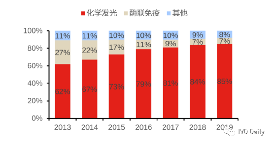 为什么说红蓝海?红这是客观存在的事实,中国14亿人口,是个人口大国,什么挣钱就往哪扎堆(2019-2021年感觉尤为明显)。蓝海,这是相对于头上的四大家来说,罗雅贝西深耕中国市场几十年,深知本土化作战的重要性,近两年都纷纷宣布各自的中国本土化建设目标,圈地建厂,合纵连横等等。这些是国产优秀企业的发展给他们带来的压力,当然上面还有政策倾斜的鞭策,但这正是化学发光的蓝海所在(正文逐一分析),作为主流方法学,项目百余种,临床收费还不错,没有哪一家能够通吃这个市场。百家争鸣,欣欣向荣才是这个市场的主旋律! 化学发光技术是目前免疫诊断技术不断更新迭代后的主流方向。化学发光产品具有灵敏性高、线性动力学范围较宽、定量检测精确、结果稳定误差小、操作简便等优势,从在临床应用中脱颖而出,成为了免疫定量分析领域的主流产品。根据Kalorama数据,预计2022年我国化学发光在免疫诊断细分市场占比将达88%。同时,免疫检测作为不可或缺的检测方法,被广泛应用于各级医院、检测机构、实验室等机构。其中肿瘤标志物、甲状腺功能、激素和传染病检测份额合计占比超70%,几乎覆盖医院的所有科室。因此,化学发光检测市场呈现出强劲的增长势头,近五年复合增长率高达24%。国内化学发光市场已超300亿RMB。随着新冠相关检测试剂的全国集中带量采购带来的前所未有的执行力和落地能力,曾经以封闭系统为优势,认为集采离发光还遥远的想法已然梦碎,安徽集采大刀一落,其威力大家有目共睹,最大的赢家据此迅速抢占市场份额,并据此机会高开高走,加大市场和研发投入,这是正循环;而错失机会的企业应当也看明白了相关部门的执行力和决心,千万不要抱有任何侥幸心理。前面提到的化学发光蓝海,这是一方面。另外,医疗新基建这个大工程是另外一个蓝海,根据迈瑞医疗投资者互动平台表示:随着医疗新基建的深入开展,相关项目开始从北上广深等大城市向 其他城市渗透、从三级医院向二级医院推进。今年以来部分地区严峻的疫情 局势不仅没有对整体新基建的推进速度造成影响,反而更加坚定了医疗新基 建的投入决心。剔除一季度已执行的商机,截至一季度末,系统中的医疗新基建待执行商机仍有 240 亿元,预计将在未来两年时间左右逐步落地。迈瑞2022年一季度推出高端全自动化学发光免疫分析仪 CL-8000i。一季度实现了几十台的新增装机,更重要的是, 70%以上的装机都在三级医院。近日,迈瑞在投资者互动平台表示立志三年内成为具有全球竞争力的IVD品牌,,发光力争所有核心项目具有全球竞争力且部分项目具有领导力。