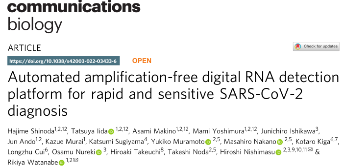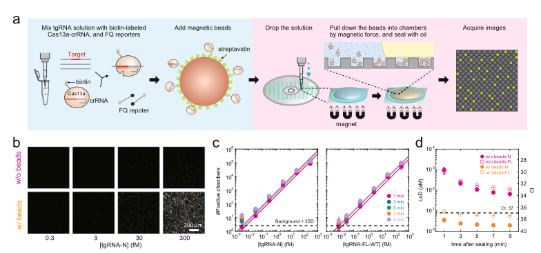自2019年12月新型冠状病毒SARS-CoV-2传播以来,已经过去了两年多,但感染的发生率并未减少。从公共卫生的角度来看,对感染者进行早期诊断和隔离可有效防止感染的传播。快速、敏感和频繁的检测对于早期诊断很重要。对于SARS-CoV-2感染的诊断,逆转录定量聚合酶链反应(RT-qPCR)由于其高灵敏度(~ 2–20am,(1-10 copies/ul))已被用作“金标准”平台。此外,基于CRISPR的核酸检测方法,如SHERLOCK和DETECTR,由于其高灵敏度(~ 2–20am,(1-10 copies/ul)),相对较短的分析时间(几十分钟),并与紧凑的检测平台兼容亦引起关注。大多数基于CRISPR的方法涉及目标核酸的等温扩增,以及使用Cas12a或Cas13a对扩增的核酸进行荧光或比色读出。扩增步骤对于提高检测灵敏度是必不可少的,但它会延长检测时间(至少几十分钟)。 不久之前,研究团队将基于CRISPR的核酸检测和微反应室技术相结合,开发了一个称为SATORI(基于CRISPR的无扩增数字RNA检测)的无扩增RNA检测平台。SATORI可在5min内检测到单链RNA(ssRNA),如SARS-CoV-2 RNA,分析检测限(LoD)约为5fm(3X103 copies/ul),能够在大多数患者临床标本中快速诊断SARS-CoV-2 RNA感染。然而,当用于高效筛查时,LoD应<10 2copies/ul。此外,SATORI还包含几个手动处理步骤,这些步骤可能会导至人为错误并降低分析精度。 近日,为了解决这些问题,同一个研究团队在杂志Communications Biology 上发表了一篇题为“Automated amplification-free digital RNA detection platform for rapid and sensitive SARS-CoV-2 diagnosis”的文章,在文章中,研究团队开发了SATORI的全自动版本,称为SATORI自动化平台(opn-SATORI)。实验结果证明,opn-SATORI可以在临床标本中检测SARS-CoV-2 RNA,其灵敏度与RT-qPCR相当,并且可以在约9min内区分SARS-CoV-2变体,准确率为98%。 图片来源:Communications Biology 主要内容 “ 自动化平台的开发。 为了自动化SATORI检测流程,研究团队开发了一个RNA检测平台,该平台由三个主要组件组成:compact disk(CD)设备、荧光显微镜和机器人(图a)。基于CD的设备包含约10 8个圆柱形飞升级微反应室。与其他数字检测方法不同,opn-SATORI的CD设备不需要微流控通道中复杂的溶液交换过程,可以以全自动方式完成从样品混合到图像分析(图b)。开发的平台自动启用以下检测过程:(i)通过在试管中将含有预装Cas13a crRNA复合物和荧光猝灭基团标记的ssRNA reporters(FQ reporter)的酶溶液与含有crRNA互补ssRNA靶标(tgRNA)的样品溶液混合,制备反应溶液,(ii)将反应溶液滴入CD装置上的小室,(iii)用一滴油密封小室,(iv)积累来自Cas13a介导的FQ reporter裂解(反式裂解),(v)使用荧光显微镜从约500000个微反应室获取图像,以及(vi)计数荧光(阳性)小室的数量,以量化样本中的tgRNA拷贝数(图c)。整个过程可以自动重复,并且可以使用单个反应分析48个样本。 无扩增数字RNA检测的自动化平台。 图片来源:Communications Biology “ Cas13a的筛选。 为了提高检测灵敏度,研究团队筛选了Cas13a同源序列并优化了缓冲条件。LwaCas13a和LbuCas13a因其强大的反式切割活性而被用于基于CRISPR的核酸检测。此外,LtrCas13a与LwaCas13a和LbuCas13a高度同源,并与LwaCas13a具有类似的抑制细菌生长的作用。结果表明,使用LtrCas13a及Ltr缓冲液时,阳性小室数量最多,且随着tgRNA浓度(300aM–300fM)增高,Ltr缓冲液中阳性小室的数量呈线性增加。在试验开始后约7分钟(油封后3分钟),LtrCas13a检测到SARS-CoV-2的N基因RNA和全基因组RNA,LoD值分别为220和280 aM(1.3×102和1.7×102copies/ul)。鉴于所获得的快速、灵敏和稳健的反式切割活性,LTRCA13A和Ltr缓冲液的组合最适合用于此RNA检测平台。 “ 提高病毒RNA检测灵敏度。 由于平台检测总体积约为15 nL(500000×~30fL)的微室阵列中随机捕获的tgRNA分子,超过99%的tgRNA分子在油封过程中被丢弃,从而导至灵敏度降低。为了克服这一缺点并进一步提高灵敏度,研究团队使用生物素-链霉亲和素磁珠技术在微腔内富集tgRNA分子。将包被链霉亲和素的磁珠添加到含有生物素标记的LtrCas13a crRNA复合物、tgRNAs和FQ reporter的反应溶液中,以捕获磁珠上的LtrCas13a-crRNA -tgRNA复合物,随后将混合物滴到CD设备上,通过磁力将复合物浓缩到腔室中,并用油密封腔室(图a)。该程序在5min内自动完成,与未经磁珠处理的程序相比,阳性小室的数量增加了约50倍(图b),表明LtrCas13a-crRNA-tgRNA复合物在微室中成功富集。在试验开始后约9分钟(油封后3分钟),平台检测到SARS-CoV-2的N基因RNA和全基因组RNA,LoD值分别为2.4和6.5aM(1.4和3.9 copies/ul)(图d)。 Opn-SATORI平台。 图片来源:Communications Biology “ SARS-CoV-2变异毒株的鉴别。 研究团队试图使用opn-SATORI来区分SARS-CoV-2变体。针对相应的变异毒株,即B.1.1.7(α)、B.1.351(β)和B.1.617(δ)中的N501Y、E484K和L452Rspike突变,各设计了20个crRNA,并进行比较筛选。结果显示,在试验开始后约9分钟内(油封后3分钟),WT SARS-CoV-2与每个变体之间的比率存在显著差异,从而能够快速准确地识别SARS-CoV-2变体。不仅如此,B.1.1.529(ο)变体也可以准确区分。总之,这些结果表明,使用opn SATORI和针对特定突变的适当crRNA对可以检测新出现的SARS-CoV-2变体。 SARS-CoV-2变异株的鉴别。 图片来源:Communications Biology “ 临床验证。 研究团队验证了opn-SATORI是否可用于诊断SARS-CoV-2感染。使用靶向N基因RNA的crRNA,研究团队评估了来自Ct值为15–30(10 WT、10 alpha、10 Japan、10 delta和10 omicron变体)患者的50份人类鼻咽拭子衍生RNA样本和来自健康人的10份RNA样本。样品的阳性室数与RT-qPC