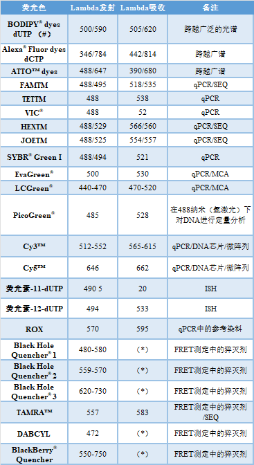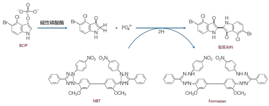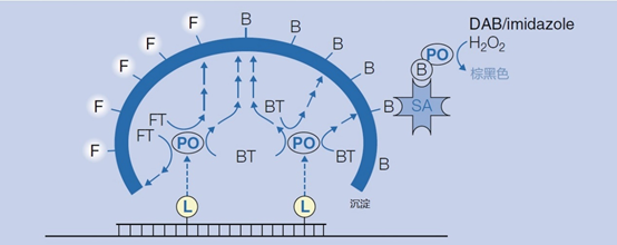3、标签的检测 荧光色素(其中包括FITC、TRITC、AMCA、Cy3、Cy5、JOE™、FAM™、HEX™、TAMRA™和VIC™)被广泛作为标签使用(见表1)。这些标签可以直接使用荧光显微镜或PCR设备或测序仪中敏感的CCD照相机进行检测。 表1 | 常用的氟色素。荧光色素可以连接到核苷酸三磷酸酯的寡核苷酸上,如UTP、ATP、CTP,或用于qPCR、测序(SEQ)、核酸的定量和熔解曲线分析(MCA),或用作猝灭剂 FRET:福斯特共振能量转移 ISH:原位杂交 (*)当猝灭是结果时,发射波长不相关 (#) U(尿嘧啶)也可以被其他氮基取代,例如 「A」 FITC、TRITC和AMCA主要用于荧光原位杂交(FISH),特别是用于细胞或组织样品(组织学样品、细胞孢子、或细胞涂片、拭子)或临床样品微生物培养后的样品,以检测病原体。 在病理学和遗传学中,染色体异常可以用染色体特异性探针进行诊断。正确的抗褪色剂可以防止荧光信号的褪色。探针的性质强烈地决定了识别基因片段和完整染色体的分辨率(图9)。 图9 | 染色体的杂交 用四种不同类型的荧光探针对染色体进行杂交;每一种探针都有不同的分辨率,应用于蜕膜期(左栏)和界面期(右栏)的细胞中。探针越大,图像越发扩散。 来源 不可追踪。 a 带有「染色体绘画」的总探针:探针来源于一个完整的染色体库,在完整的染色体上杂交。探针被分割成碎片以促进扩散。这将在缺口翻译或随机引物中自动发生。 b 中心粒探针:一个合成的寡核探针可以识别中心粒上的重复序列((ACAAACT/ACAAATT)n)。中心粒探针可用于识别染色体数量的差异。 c 基因特异性探针是由特定的寡核苷酸或PCR或质粒探针(通常是随机引物或缺口翻译)组成的混合物。值得注意的是,这种探针只识别特定基因的独特序列。 d 某些染色体的三体化可以通过使用特异性探针进行观察 Cy3和Cy5主要用于微阵列和DNA芯片,Cy5也作为水解探针的标签。JOE™、FAM™、HEX™、™ VIC™和许多其他标签在实时PCR中以不同的组合使用。 4、触变剂 触变剂经常被用作引物和探针的标签。知名的触变剂是氟色素(FITC)、地高辛、溴脱氧尿苷和生物素。除了氟染色剂,标签不提供可检测的信号。为了使其可视化,需要有报告基团(见图2)。酶(过氧化物酶、碱性磷酸酶、ß-半乳糖苷酶)、胶体金颗粒和氟色素都是报告基团的例子。每种报告基团类型都可以通过适当的技术进行可视化。 中间试剂如合子特异性抗体将报告基团与合子现场耦合/结合在一起(图4(3a))。由于抗体的特异性只基于分子的抗原结合部分(Fab;Fragment抗原结合),而不是分子的其他区域,这允许后续的检测反应,基于共同的分子。这主要是在分子的Fc部分(Fragment crystallizable)(见图4(3))。这可以是Fc特异性的,报道标记的第二抗体或Fc-检测蛋白A或G(图4(3))。通常使用一个合子/标签系统。 链霉亲和素-生物素介导的检测:生物素标签可以被检测,不仅可以用生物素引导的抗体,还可以有效地用微生物肽;链霉亲和素(图4(3b,4)和图3)。报告基团如酶或荧光色素可以与链霉亲和素偶联。链霉蛋白-生物素检测被广泛使用,既可用于直接杂交,也可与几种PCR策略相结合,如PCR-ELISA(见图10)。 图10 | PCR-ELISA 用生物素化引物和生物素-dUTP进行常规PCR后,样品被稀释1/20,并在涂有链霉亲和素的96或384孔ELISA板中孵化。扩增物通过链霉亲和素-生物素的相互作用被捕获,之后进行几个洗涤步骤。通过经典的TMB/H2O2-酶反应,使用带有过氧化物酶报道的特异性抗体来检测荧光铬标记的扩增物。 一种更便宜的替代检测,只需要一个生物素标记的引物,通过链霉菌素建立检测。链霉亲和素被固定在平板上,然后进行变性,只有一个氟铬标记的扩增物特异性探针与(生物素化的)单链扩增物杂交。 一个链霉菌素分子有四个生物素的结合点。其中一个需要与生物素化的扩增物或杂交的生物素化的探针进行高亲和力反应。三个生物素结合位点用于与生物素/报道复合物结合。这样,许多生物素化的酶分子或其他报告基团可以通过链霉菌素叠加到一个生物素标签上。荧光染色体与生物素以严格的比例耦合到可以通过生物素与链霉菌素结合的载体(例如BSA)上。使用提拉米特放大法可以进一步增加信号(见图11)。 图11 | 碱性磷酸酶检测(不溶性产物) 碱性磷酸酶催化NBT/BCIP的磷酸化。自发的氧化还原反应后形成不溶性沉淀物。NBT(硝基蓝色氯化四氮唑)是一个质子受体,将在红色的福马赞中转移,而BCIP(5-溴-4-氯-3′-吲哚磷酸对甲苯胺盐)将被解磷化,并在蓝色的不溶性物质(5,5′-二溴-4,4′-二氯化靛)中还原。两种参与的结果都是紫色的参与。这种技术经常用于膜上或原位杂交。 5、报告基团 报告基团直接(荧光色素)或间接(酶、胶体金)提供荧光或吸光信号,用于识别杂交探针(见图2)。当应用荧光色素作为报告基团时,可以通过荧光显微镜或CCD荧光测量仪同时检测(直接检测)。PCR广泛使用荧光色素,尽管有些平台使用间接检测。 当报告基团本身不产生信号而需要额外的步骤进行可视化时,就需要间接检测。目前,酶是最广泛使用的。结合与固相(尼龙膜、细胞、组织)的杂交,它们会产生一个沉淀物。在某些情况下,需要一个可溶性的产品,如ELISA格式。酶总是需要一个可溶性底物来转化为可检测的产物。 过氧化物酶使用过氧化物(H2O2)作为底物,与非特异性质子供体结合(图12)。 TMB = 溶剂的质子供体(黄色)。 DAB = 细胞、组织和膜中反应的质子供体