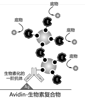 1 包被抗原 包被抗原在两种主要技术中有所不同。 在传统的(直接涂布)ELISA中,抗原通过被动吸附直接附着在板上,通常使用pH > 9的碳酸盐/碳酸氢盐缓冲液。在碱性条件下,大多数但不是所有的蛋白质都能与微孔板的聚苯乙烯表面紧密结合。 然而,如果抗原的含量很低或不能很好地粘附在塑料上,那么可以使用另一种夹层或捕获ELISA。 在捕获(间接包被)ELISA中,抗原特异性抗体被吸附在塑料上,在与抗原样品孵化时,它又与抗原结合并包被下来。抗体的附着通常使用pH值大于9的碳酸/碳酸氢盐缓冲液来实现,或者在极少数情况下使用预激活板来实现更直接的附着方法。 当使用复杂的蛋白质样品时,ELISAs夹心法已经变得非常流行,因为只有特定的抗原被包被,而不是整个蛋白质样品被包被。包被的抗原越多,检测的潜在灵敏度就越高。 ELISAs夹心法需要两种不同的抗体与抗原特异性结合(每种抗体与不同的表位反应)。一阶抗体(结合在平板上)被称为捕获抗体或包被抗体,而二阶抗体检测包被的抗原,被称为检测抗体。 这样的抗体被称为「匹配对」;它们必须经过验证才能结合使用,因为它们必须不与抗原竞争结合才能获得准确的结果。可以使用单克隆和多克隆抗体的组合;更常见的是使用单克隆作为包被抗体,多克隆作为检测抗体。 ELISAs夹心法有时比传统ELISAs需要更多的优化,但通常信噪比(S:N)更高。 1 抗原检测直接法与间接法 直接法包括用酶或替代信号分子(如荧光体)标记检测抗体。间接法包括一个额外的探针步骤,使用另一个标记有可检测标签的抗体或链霉菌素。这个额外的探针被称为二阶抗体,因为它的唯一目的是通过与检测(一阶)抗体结合来传递可测量的信号标签。 直接法通常比间接法更快,而且也消除了二阶抗体与包被抗体交叉反应的潜在背景信号。然而,即使在最好的情况下,直接法也不能提供从使用二阶抗体或Avidin/生物素系统获得的信号放大。 因此,直接法通常不如间接法灵敏,最好只在目标物相对丰富时使用。 3 生物素信号放大 生物素是一种小的(MW 244)维生素分子,很容易被修饰,因此它可以被化学地连接到蛋白质、抗体和其他感兴趣的生物分子探针上。 Avidin和Streptavidin是源于不同来源的蛋白质,但在与生物素分子非常强烈和特异地结合方面具有几乎相同的功能。此后在本文中,「Avidin」和「链霉菌素」将互换使用,指这些生物素结合蛋白中的任何一种。Avidin-生物素亲和系统经常被用于设计ELISA的标记和检测系统。 间接法的一个常见的适应性是使用Avidin-生物素化学方法放大信号,有两种方法: ➤ 第一种方法是使用生物素化的检测抗体,使用与辣根过氧化物酶(HRP)或碱性磷酸酶(AP)共轭的Avidin或链霉菌素蛋白进行探测。 ➤ 第二种方法也采用了生物素化的检测抗体,但它是用预先孵化的Avidin和生物素化的酶的混合物进行检测,这一过程被称为 「Avidin-生物素复合物」(ABC)信号放大。 这些方法的信号放大通过两种机制发生: 首先,生物素化(生物素标记)通常会使每个抗体分子产生多个生物素标签,从而使一个以上的链霉蛋白分子与每个抗体结合。由于Avidin型蛋白是四聚体,每个分子有四个生物素结合位点,这有助于结合。 其次,用酶标记链霉菌素分子或使用链霉菌素和生物素化酶的预孵化混合物的过程导至结合物具有一个以上的酶。这种多重标记的综合效果是增加最终免疫复合物中酶分子的数量。这增加了适当底物的催化作用,与传统的酶标记的二阶抗体相比,给出了更强的信号。 图2 | ABC系统可实现的信号放大示意图 4 荧光 相对而言,最近在可见光和红外线范围内稳定的荧光基团数量的扩大,使荧光信号检测成为ELISA应用中一个有吸引力的选择。这种方法在进行多重阵列时很常见,因为可以用连接到不同荧光基团的抗体同时检测一种以上的抗原。 在荧光检测中,检测抗体被直接标记,或者二阶抗体(或偶尔是Avidin)被标记用于间接法。 当使用标记的二阶抗体进行复用时,必须使用来自不同物种的检测抗体,以便区分不同的信号。检测极限通常在100 pg/孔左右,其灵敏度低于比色法或化学发光法。 图3 | 多重阵列ELISA的示意图,通过使用荧光使之成为可能 在这种情况下,12种不同的捕获抗体以印刷点阵列的形式涂在玻璃片上。每个抗体捕获不同的分析物,并由其匹配的检测抗体检测,该抗体是生物素化的。最后,所有的斑点都通过荧光标记的链霉菌素结合物(本例中是Thermo Scientific DyLight™ 649荧光基团)。 5 酶 在ELISA应用中通常使用两种酶。 碱性磷酸酶(AP)是一种大型的酶,用于少数的检测。它的大小(140 KDa)使它很难将超过一到两个分子的酶连接到每个分子的抗体或阿维丁上,这就限制了可以产生的信号量。除非正确储存和处理,否则AP也容易出现稳定性问题。 辣根过氧化物酶(HRP)是一种更常用的酶。它的小尺寸(40KDa)允许更多的分子与抗体或Avidin偶联,这可以促进信号的产生。HRP是大多数研究人员进行ELISAs的首选酶,可与各种底物一起使用(见下文),其中大多数底物比AP等价物更灵敏。 6 底物 酶信号的产生需要底物的催化作用,产生有色或荧光化合物或化学发光(可见光)。信号的测量是使用分光光度板阅读器、带有适当过滤器的荧光仪或设置为读取总光输出的发光仪。 下面将讨论每种类型的底物: 比色底物形成一种可溶性的彩色产品,相对于每个孔