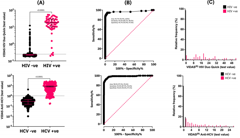 人类免疫缺陷病毒(HIV)和丙型肝炎病毒(HCV)感染仍然是全球重要的公共卫生问题。根据联合国艾滋病毒/艾滋病联合规划署(UNAIDS)和世界卫生组织(WHO)的估计,2020年约有150万人新感染艾滋病毒和丙型肝炎病毒。重点人群,尤其是在注射药物的人群中HIV和HCV合并感染的流行率也令人担忧。在高效抗逆转录病毒疗法(ART)和直接作用抗病毒药物(DAA)的帮助下,已制定了2030年消除艾滋病毒和丙型肝炎病毒(HIV和HCV)作为公共卫生威胁的宏伟目标。UNAIDS 95-95-95目标规定,95%的艾滋病毒感染者(PLWH)应了解其艾滋病毒状况,95%了解其状况的人应接受治疗,95%接受艾滋病毒治疗的人应受到病毒抑制。同样,世界卫生组织建议,目标是在符合条件的人群中治疗80%的丙型肝炎病毒感染,将丙型肝炎病毒感染的新发病率降低90%,并将肝脏相关死亡率降低65%。这些消除目标的进展可以通过行为和生物血清学监测系统进行监测,但它们需要准确的血清学检测来检测艾滋病毒和丙型肝炎病毒抗体。血清学检测还应与干血点(DBS)样本兼容,以减少生物样本采集的结构和地理障碍,促进监测的实施。 VIDAS HIV Duo-Quick是第四代酶联荧光分析(ELFA),能够检测p24抗原和HIV抗体。VIDAS anti-HCV是第三代ELFA,利用NS3、NS4A和NS4B抗原检测抗HCV抗体。这两种分析均作为包含所有必要试剂的ready-to-use试纸出售,VIDAS台式免疫分析仪自动执行方案(即清洗、培养和检测),从而最大限度地减少操作员错误。与手动96孔板血清学分析相比,VIDAS系统操作更简单,成本显著低于其他商业免疫分析仪,如Abbott Alinity或Bio-Rad BioPlex 2200。VIDAS HIV Duo Quick和anti-HCV在血清和血浆中表现出色,但目前缺乏DBS的表现数据,尤其是在血清监测方面。 近日,来自加拿大的研究团队在杂志Scientific reports上发表了一篇题为“Evaluation of the bioMérieux VIDAS HIV Duo Quick and Anti-HCV assays for dried blood spot based serosurveillance”的文章。在文章中,研究团队评估了VIDAS-HIV Duo Quick和anti-HCV检测在DBS中分别检测HIV和HCV抗体的性能,以进行血清监测。分析是根据在乌克兰收集的DBS样本(n=725)子集进行评估。使用Avioq HIV-1 Microelisa System或Ortho HCV v3.0 ELISA Test System作为参考试验,评估敏感性、特异性、阳性预测值和阴性预测值。 图片来源:Scientific reports 主要内容 1. VIDAS HIV Duo Quick 检测DBS样本中HIV抗体的性能统计 选择DBS样本的随机子集(n=725),用VIDAS HIV Duo Quick和anti-HCV分析进行回顾性测试,以评估其性能。 使用Avioq HIV-1 Microelisa System或Ortho HCV v3.0 ELISA Test System作为参考试验,评估敏感性、特异性、阳性预测值和阴性预测值。这两种参考测试都是加拿大公共卫生局行为和生物监测系统的核心,该系统使用DBS样本监测加拿大关键人群中的艾滋病毒和丙型肝炎流行率。 在该子集中,Avioq HIV-1 Microelisa System和Ortho v3.0 ELISA Test System在DBS样本中分别为7.6%(55/725)和27.4%(199/725)。在HIV阳性和HIV阴性的DBS样本中,VIDAS HIV Duo Quick阳性率为96.4%(53/55),阴性率为82.7%(554/670),敏感性为96.4%(95% CI 87.7%,99.4%),特异性为82.7%(95% CI 79.6%,85.4%),PPV为31.4%(95% CI 24.8%,38.7%),NPV为99.6%(95% CI 98.7%,99.9%)。VIDAS HIV Duo Quick与基于kappa系数的Avioq HIV-1 Microelisa System的一致性为moderate (kappa=0.405 [95% CI 0.326,0.485])。 VIDAS HIV Duo Quick和Anti-HCV检测DBS样本中HIV和HCV抗体的性能统计图片来源:Scientific reports 2. Anti-HCV检测DBS样本中HCV抗体的性能统计 在HCV阳性和HCV阴性的DBS样本中,VIDAS抗HCV阳性率为87.9%(175/199),阴性率为98.5%(518/526),其敏感性分别为95.6%(95% CI 91.6%,97.8%),特异性为95.6%(95% CI 93.5%,97.0%),PPV为95.6%(95% CI 91.6%,97.8%),NPV为95.6%(95% CI 93.5%,97.0%)。VIDAS anti-HCV与 Ortho HCV v3.0 ELISA Test System检测结果几乎完全一致(kappa=0.886 [95% CI 0.848,0.925])。 3. VIDAS HIV Duo Quick和 anti-HCV可以充分区分阳性和阴性DBS VIDAS HIV Duo Quick可以充分区分HIV阳性和HIV阴性DBS。此外,ROC曲线分析表明,可以通过调整制造商提供的cutoff值来提高性能。调整测试值显著提高了特异性(95.7% [95% CI 93.9%,97.0%] VS. 82.7%[95% CI 79.6%,85.4%]),并与Avioq HIV-1 Microelisa System一致性提高(0.741[95% CI 0.656,0.826] VS. 0.405[95% CI 0.326,0.485])。 VIDAS anti-HCV也可以充分区分HCV阳性和HCV阴性的DBS,然而,调整测试值cutoff对性能没有显著影响。 DBS样本的VIDAS HIV Duo Quick和anti-HCV性能。 图片来源:Scientific reports 4. 总结与讨论 血清监测将在当地和国际上发挥核心作用,监测在2030年消除艾滋病毒和丙型肝炎目标方面取得的进展。虽然血清和血浆通常是血清学监测的首选生物样本,但由于缺乏基础设施、缺乏训练有素的医务人员以及不方便进入采集点,采集血液并不总是方便或可能的。血清学检测也应可以使用DBS样本,这可能导至更具代表性的抽样和疾病流行率的准确估计。 虽然研究结果表明,由于PPV为64.2%(95% CI 53.3%,73.8%),VIDAS Duo-Quick在低发病率环境中的使用可能有限,但优化DBS样本的洗脱方案可能有助于更好的分析性能。未来的工作将包括使用由高度特征化的参考血清/血浆样本设计的DBS样本改进洗脱方案。 相比之下,VIDAS anti-HCV在实验室的表现更好。尽管如此,但改进DBS洗脱方案对于提高性能和在低发病率环境下使用VIDAS anti-HCV可能是必要的。 |
