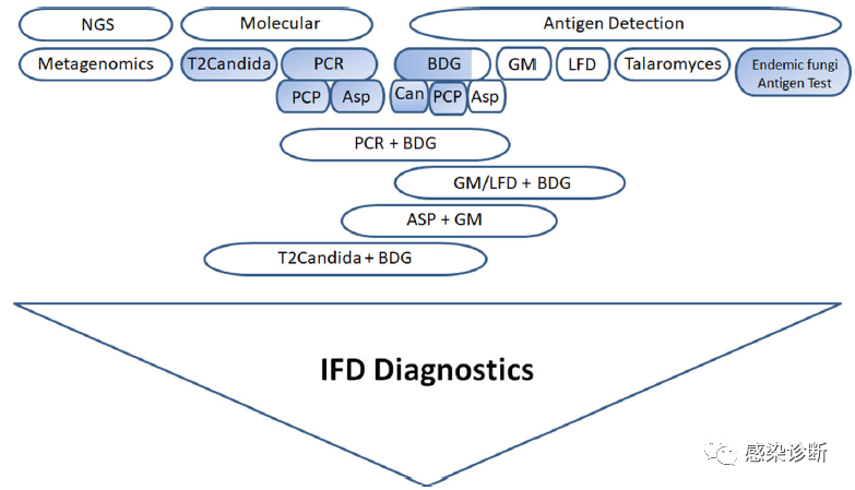 Mycopathologia (2021) 186:575–582 https://doi.org/10.1007/s11046-021-00549-x 前 言 侵袭性真菌病(Invasive Fungal D isease,IFD)通常发生在免疫改变的宿主身上,包括血液病恶性肿瘤患者、获得性免疫缺陷患者、干细胞或器官移植患者和接受长期免疫抑制治疗的患者。IFD的临床表现多样、复杂,通常没有特异表现。加之病原生长缓慢,难以获取及时、准备的病原学依据。 针对IFD现有的诊断手段及其效率都比较低。由于真菌生长缓慢,非培养法的抗原检测和分子学方法成为重要的辅助诊断技术。例如,通过1,3-β-D-葡聚糖和半乳甘露聚糖检测,能够较好辅助IFD的诊断。分子诊断领域也提出了标准化聚合酶链反应(PCR)方法用以检测真菌和抗真菌耐药性的可行技术方案。 抗原检测 一、1,3-β-D-葡聚糖(BDG) 是除隐球菌、芽生菌和毛霉菌外的许多致病真菌的主要细胞壁成分。目前它被用于各种IFD的诊断,特别是侵袭性念珠菌病、曲霉病和肺孢子菌肺炎。血清BDG对诊断肺孢子菌肺炎的敏感性为96%,特异性为84%;对诊断IFD的敏感性为80%,特异性为82%。 BDG检测已经常规应用在血清标本中,而支气管肺泡灌洗液(BALF)和脑脊液(CSF)中测定BDG的方法也在探索中。可能是因为它在一系列致病真菌和环境上的多样性,最新发表的综述中发现BDG检测在BALF和CSF中作为临界或非特异性的真菌标记物,需要额外的生物特异性检测,如分子诊断,以协助IFD的特异性诊断。血清BDG除具有诊断价值外,还可作为预后指标。与BDG检测阳性的患者相比,念珠菌病患者血清BDG持续阴性的患者具有更好的临床转归和预后。值得注意的是,抗真菌治疗期间血清BDG水平的降低可以预测侵袭性念珠菌病和曲霉病治疗是否成功。 二、曲霉菌半乳甘露聚糖 半乳甘露聚糖(Galactomannan,GM)存在于多种真菌的细胞壁中,主要用于诊断侵袭性曲霉病(Invasive Aspergillosis,IA)。但是,一些非曲霉类真菌感染,如:镰刀菌病、组织胞浆菌病、蓝状菌病和芽生菌病,可以产生较高的GM水平。 GM可对血清和BALF样本进行检测。血清GM检测可以对高危患者进行间隔监测。与BALF相比,超过70%的中性粒细胞减少患者的血清GM敏感性一般较低。而在非中性粒细胞减少患者中,血清GM的敏感性进一步降低到40%以下。血清和BALF检测的特异性均接近90%。连续的监测GM可用于预测侵袭性曲霉病治疗结果。 三、蓝状菌的免疫检测 一种用于检测马尔尼菲蓝状菌细胞壁半乳蛋白(Mp1p抗原)的新型酶免疫分析法在一项回顾性研究中的结果显示,与血液培养相比,该方法提高了敏感性(86.3%vs. 72.8%)和诊断时间(6小时vs. 6.6天)。 四、新型检测平台 最近,两种侧流检测方法(Lateral Flow Assays,LFA)被用于IA诊断——AspLFD和LFA-IMMY。前者检测曲霉活跃生长期间分泌的胞外甘露蛋白抗原,后者检测半乳甘露聚糖。这种LFA平台的优势在于,与传统的基于实验室的ELISA和分子诊断相比,它们可以作为即时检验在现场部署。 BALF标本的AspLFD诊断IA的敏感性和特异性分别为71-82%和86-96%,而LFA-IMMY的敏感性和特异性分别为92%和91%。血清样本检测时,LFA-IMMY的敏感性和特异性分别为96.9%和98%。在比较中,发现LFA-IMMY的敏感性略高于AspLFD(83-87% vs 69-73%),具有相同的特异性,但具有更好的阴性预测值(89-91% vs 81-82%)。 还有一种更新的方法,是利用尿液检测肺IA的基于半乳糖转移酶的无创单克隆抗体LFA,敏感性为80%,特异性为92%。 隐球菌抗原检测一直是使用乳胶凝集方法。采用LFA技术检测隐球菌抗原具有较高的敏感性、易于使用、需要最小的设置、快速的周转时间和较低的成本等优势。灵敏度和特异性分别为99.3%和99.1%。高血抗原滴度也可预测隐球菌性脑膜炎和死亡率,但是在HIV患者中,滴度与临床疗效没有相关性,因此抗原滴度监测提供的预后价值有限。 分子方法 一、曲霉菌 在最新的EORTC/MSGERC共识定义中,将曲霉PCR检测作为真菌学证据的组成部分。EAPCRI试图通过标准化曲霉PCR方法对标本(全血、血清/血浆、支气管肺泡灌洗液)进行优化,包括确定样本量、提取和洗脱条件以及扩增过程。商品化的曲霉PCR检测具有不同的敏感性,但其特异性通常很高,大约在80%以上。在一项研究中,报告了单一PCR阳性检测的敏感性和特异性分别为76.8- 88%和75-94.5%;两项阳性检测显著提高了特异性,从76提高到95%。 二、隐球菌 最近,FilmArray推出一种直接对脑脊液样本进行的多重PCR检测。其中隐球菌是一个检测目标,已被用于诊断隐球菌脑膜炎。在系统综述中,PCR检测对隐球菌病的检测具有较高的阳性预测价值,如果患者已经接受了治疗则会出现较高比例的假阴性结果。在临床高度怀疑的情况下,即使PCR结果为阴性,仍应进行隐球菌抗原检测。 三、毛霉菌 毛霉病通常很难诊断,并与高发病率和死亡率相关。 MucorGenius®是一个新开发的多重实时PCR产品,可用于检测BALF、组织和血清样本中根霉菌、毛霉属、恒梗霉属、小克银汉霉属和根毛霉属。 在一项10例肺毛霉病确诊患者的小型回顾性研究中,MucorGenius®对肺标本进行检测,灵敏度和特异性分别为90%和97.9%。在另一项回顾性研究中,该方法也能够检测侵袭性毛霉病患者血液中的循环毛霉DNA,总体灵敏度为75%。更重要的是,在第一次培养结果阳性前81天(中位数8天,IQR 1.75-16.25),在放射学证据显示有侵袭性疾病前24天(中位数3天,IQR - 0.25-8.5),患者可检测到阳性结果。 四、假丝酵母 念珠菌核酸检测试验,T2Candida(T2 Biosystems, L