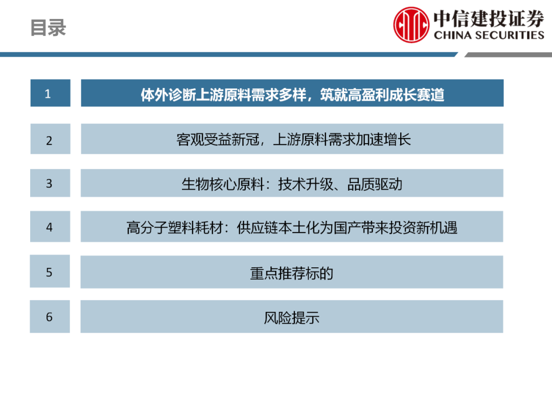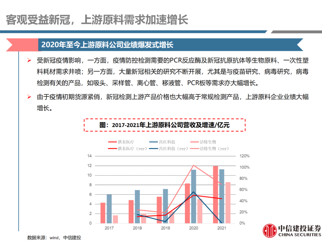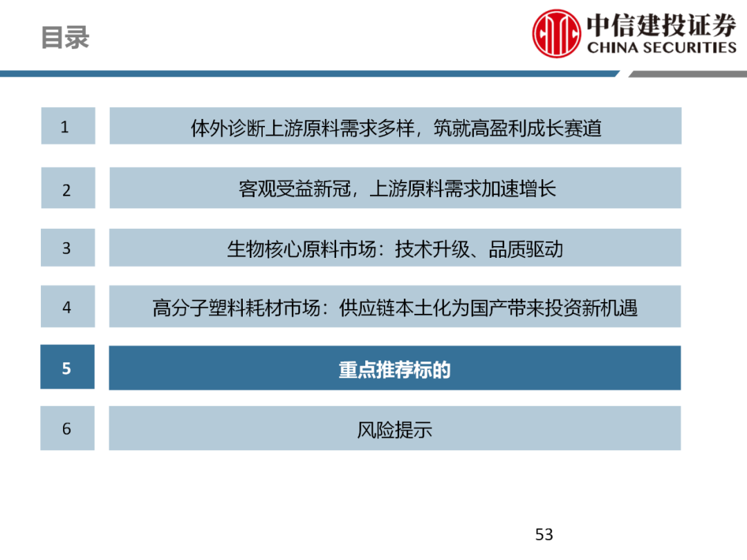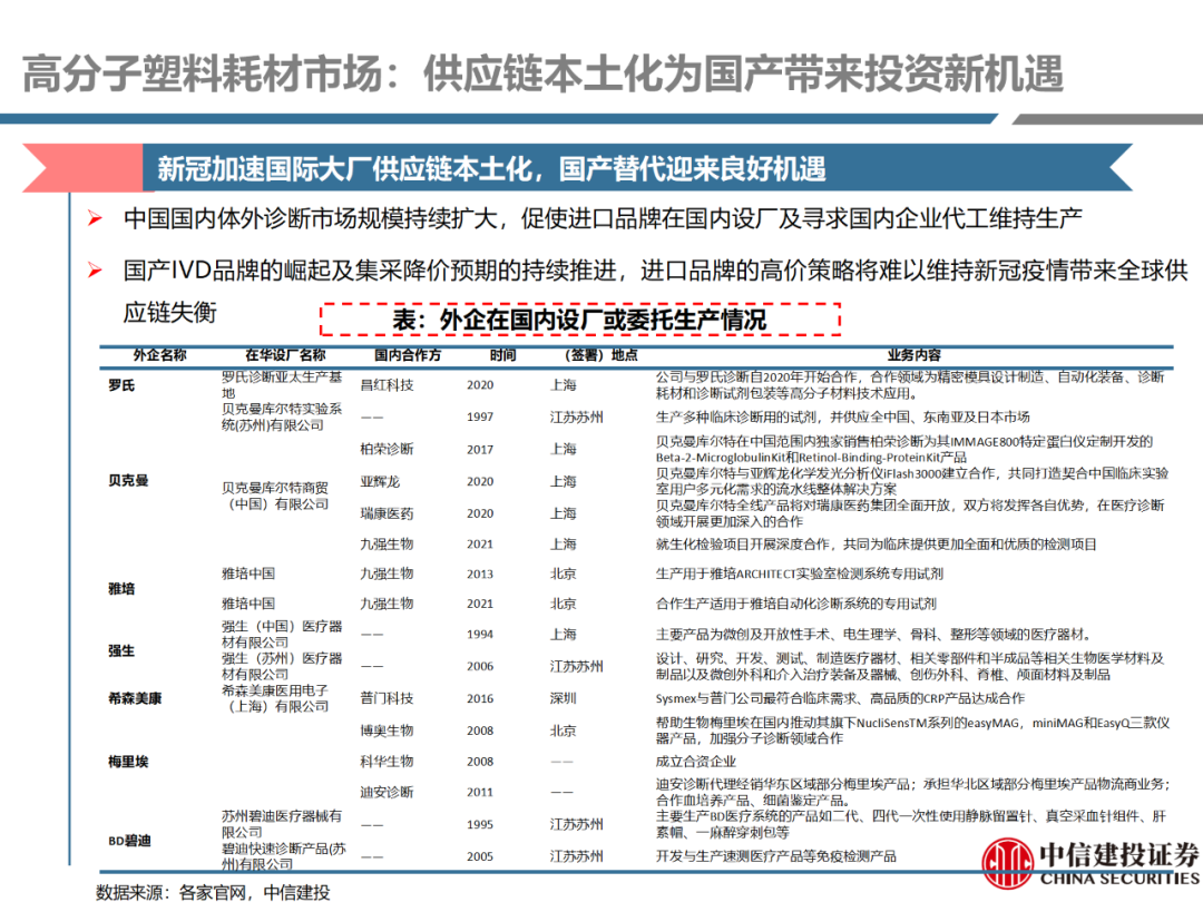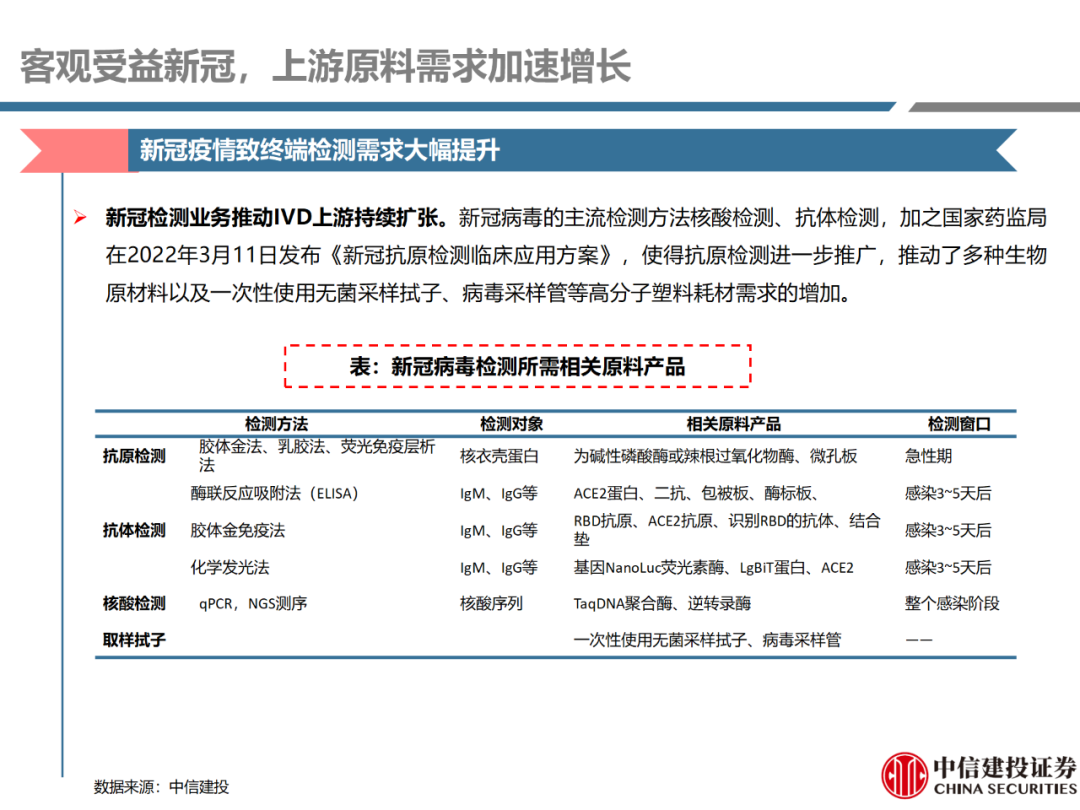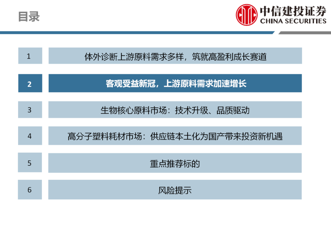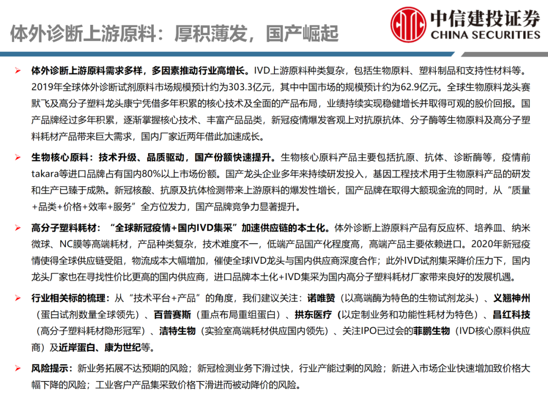 | 体外诊断上游原料需求多样,多因素推动行业高增长。IVD上游原料种类复杂,包括生物原料、塑料制品和支持性材料等。2019年全球体外诊断试剂原料市场规模预计约为303.3亿元,其中中国市场的规模预计约为62.9亿元。全球生物原料龙头赛默飞及高分子塑料龙头康宁凭借多年积累的核心技术及全面的产品布局,业绩持续实现稳健增长并取得可观的股价回报。国产品牌经过多年积累,逐渐掌握核心技术、丰富产品品类,新冠疫情爆发客观上对抗原抗体、分子酶等生物原料及高分子塑料耗材产品带来巨大需求,国内厂家近两年借此加速成长。生物核心原料:技术升级、品质驱动,国产份额快速提升。生物核心原料产品主要包括抗原、抗体、诊断酶等,疫情前takara等进口品牌占有国内80%以上市场份额。国产龙头企业多年来持续研发投入,基因工程技术用于生物原料产品的研发和生产已臻于成熟。新冠核酸、抗原及抗体检测带来上游原料的爆发性增长,国产品牌在取得大额现金流的同时,从“质量+品类+价格+效率+服务”全方位发力,国产品牌竞争力显著提升。高分子塑料耗材:“全球新冠疫情+国内IVD集采”加速供应链的本土化。体外诊断上游原料产品有反应杯、培养皿、纳米微球、NC膜等高端耗材,产品种类复杂,技术难度不一,低端产品国产化程度高,高端产品主要依赖进口。2020年新冠疫情使得全球供应链受阻,物流成本大幅增加,催使全球IVD龙头与国内供应商深度合作;此外IVD试剂集采降价压力下,国内龙头厂家也在寻找性价比更高的国内供应商,进口品牌本土化+IVD集采为国内高分子塑料耗材厂家带来良好的发展机遇。行业相关标的梳理:从“技术平台+产品”的角度,我们建议关注:诺唯赞(以高端酶为特色的生物试剂龙头)、义翘神州(蛋白试剂数量全球领先)、百普赛斯(重点布局重组蛋白)、拱东医疗(以定制业务和功能性耗材为特色)、昌红科技(高分子塑料耗材隐形冠军)、洁特生物(实验室高端耗材供应国内领先)、关注IPO已过会的菲鹏生物(IVD核心原料供应商)及近岸蛋白、康为世纪等。风险提示:新业务拓展不达预期的风险;新冠检测业务下滑过快,行业产能过剩的风险;新进入市场企业快速增加致价格大幅下降的风险;工业客户产品集采致价格下滑进而被动降价的风险。