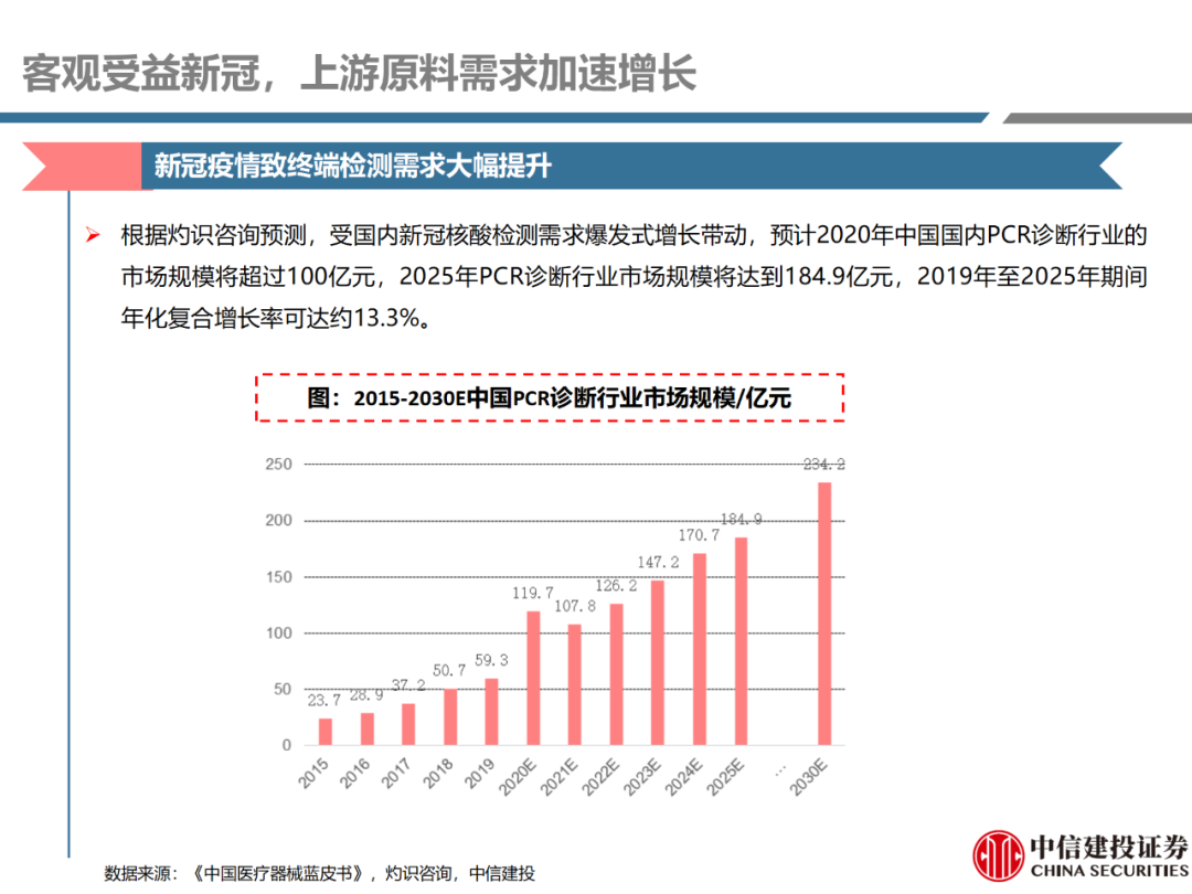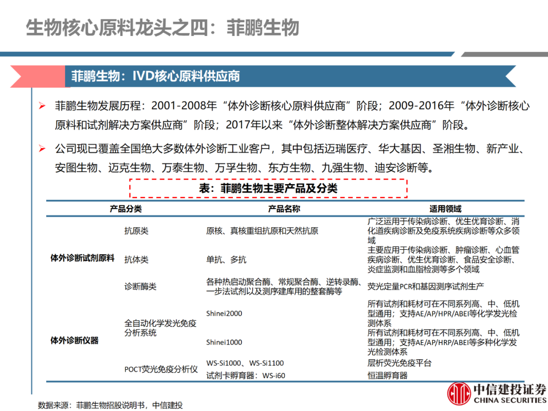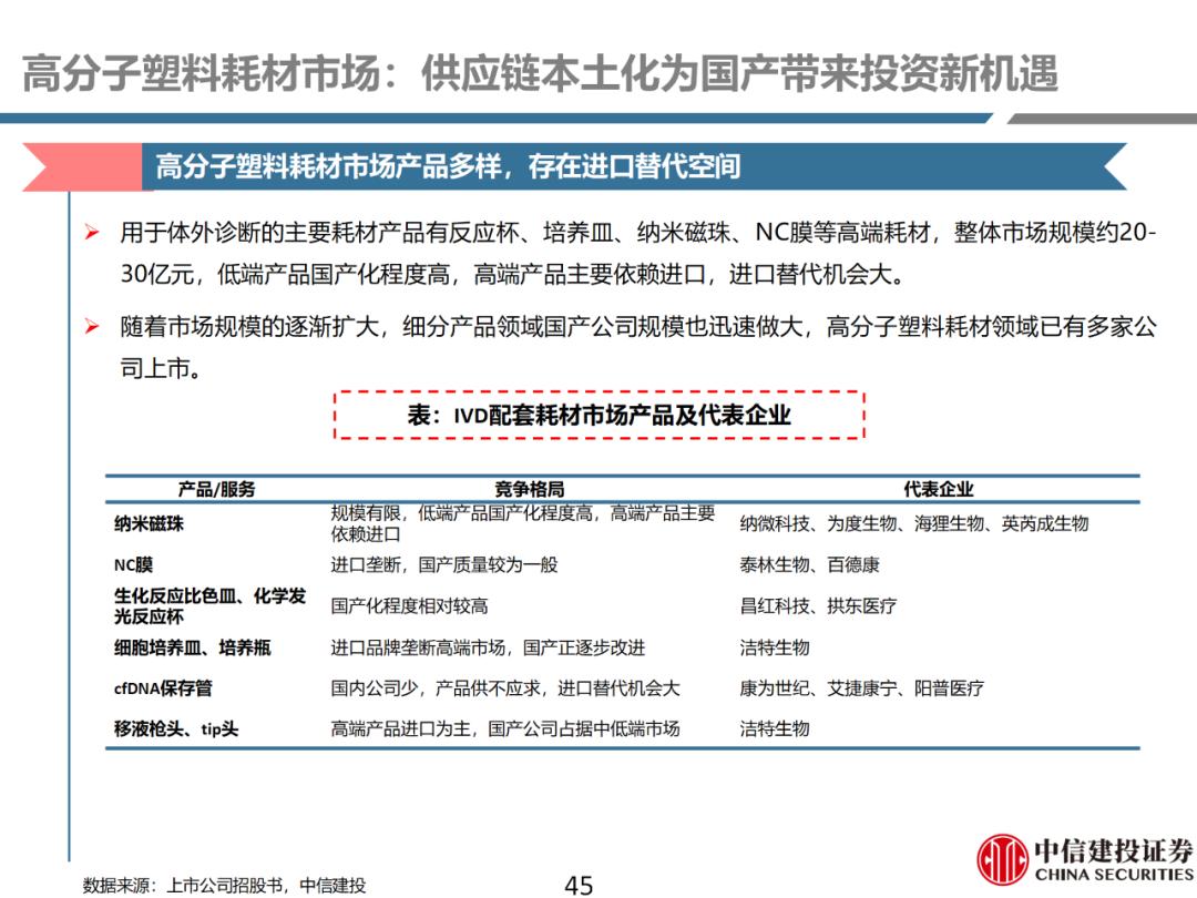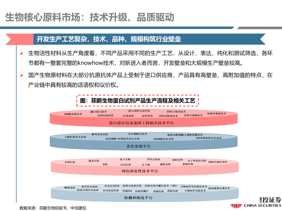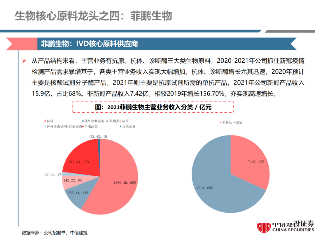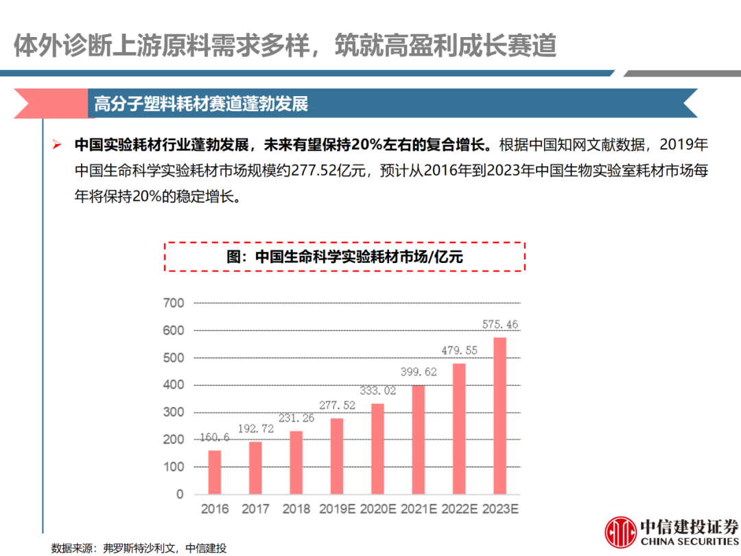 | 体外诊断上游原料需求多样,多因素推动行业高增长。IVD上游原料种类复杂,包括生物原料、塑料制品和支持性材料等。2019年全球体外诊断试剂原料市场规模预计约为303.3亿元,其中中国市场的规模预计约为62.9亿元。全球生物原料龙头赛默飞及高分子塑料龙头康宁凭借多年积累的核心技术及全面的产品布局,业绩持续实现稳健增长并取得可观的股价回报。国产品牌经过多年积累,逐渐掌握核心技术、丰富产品品类,新冠疫情爆发客观上对抗原抗体、分子酶等生物原料及高分子塑料耗材产品带来巨大需求,国内厂家近两年借此加速成长。生物核心原料:技术升级、品质驱动,国产份额快速提升。生物核心原料产品主要包括抗原、抗体、诊断酶等,疫情前takara等进口品牌占有国内80%以上市场份额。国产龙头企业多年来持续研发投入,基因工程技术用于生物原料产品的研发和生产已臻于成熟。新冠核酸、抗原及抗体检测带来上游原料的爆发性增长,国产品牌在取得大额现金流的同时,从“质量+品类+价格+效率+服务”全方位发力,国产品牌竞争力显著提升。高分子塑料耗材:“全球新冠疫情+国内IVD集采”加速供应链的本土化。体外诊断上游原料产品有反应杯、培养皿、纳米微球、NC膜等高端耗材,产品种类复杂,技术难度不一,低端产品国产化程度高,高端产品主要依赖进口。2020年新冠疫情使得全球供应链受阻,物流成本大幅增加,催使全球IVD龙头与国内供应商深度合作;此外IVD试剂集采降价压力下,国内龙头厂家也在寻找性价比更高的国内供应商,进口品牌本土化+IVD集采为国内高分子塑料耗材厂家带来良好的发展机遇。行业相关标的梳理:从“技术平台+产品”的角度,我们建议关注:诺唯赞(以高端酶为特色的生物试剂龙头)、义翘神州(蛋白试剂数量全球领先)、百普赛斯(重点布局重组蛋白)、拱东医疗(以定制业务和功能性耗材为特色)、昌红科技(高分子塑料耗材隐形冠军)、洁特生物(实验室高端耗材供应国内领先)、关注IPO已过会的菲鹏生物(IVD核心原料供应商)及近岸蛋白、康为世纪等。风险提示:新业务拓展不达预期的风险;新冠检测业务下滑过快,行业产能过剩的风险;新进入市场企业快速增加致价格大幅下降的风险;工业客户产品集采致价格下滑进而被动降价的风险。