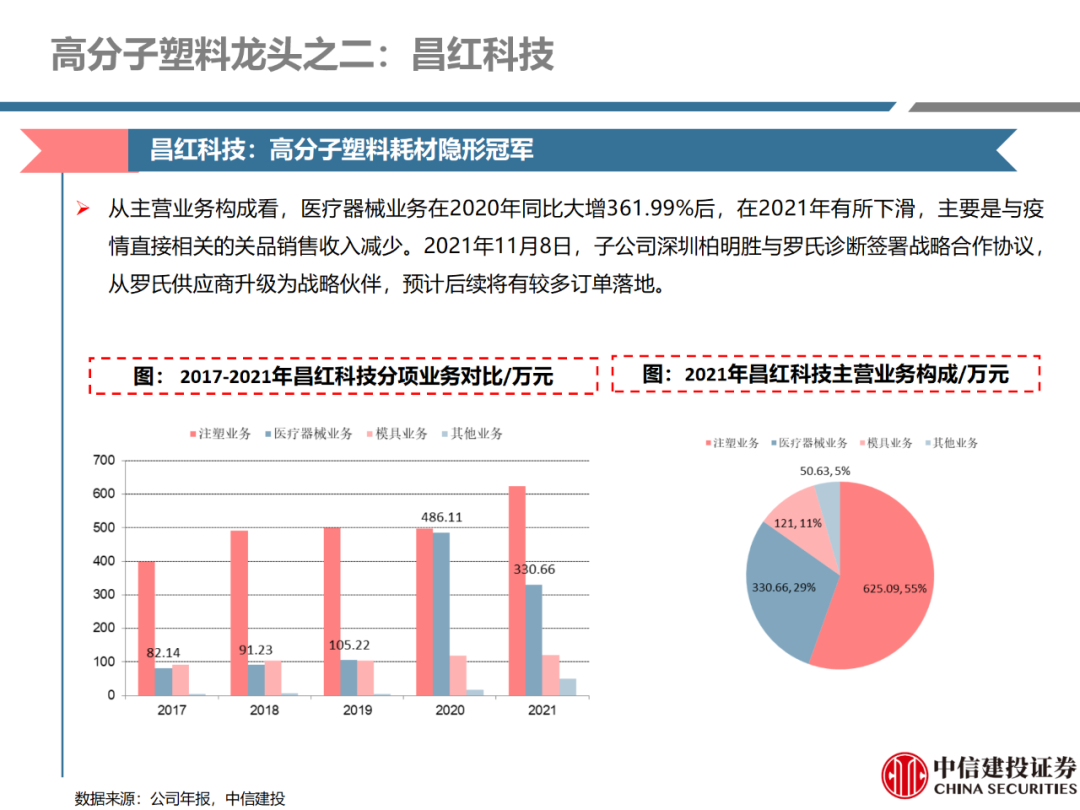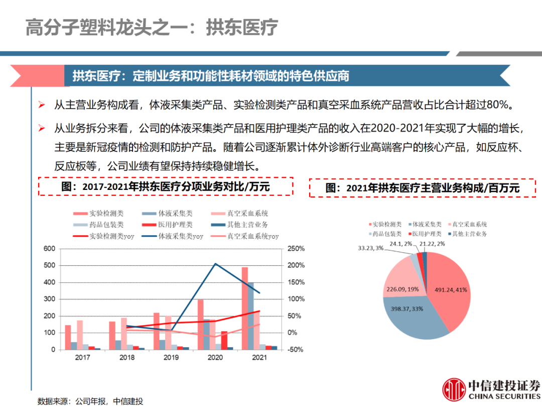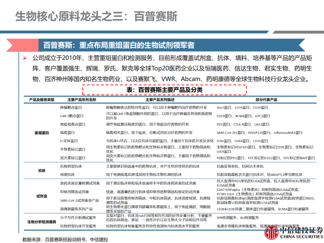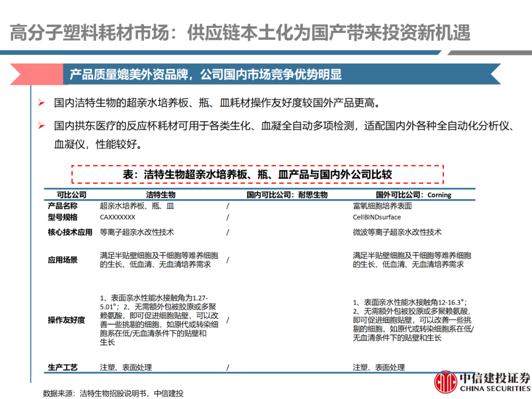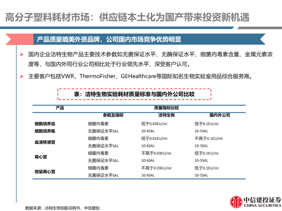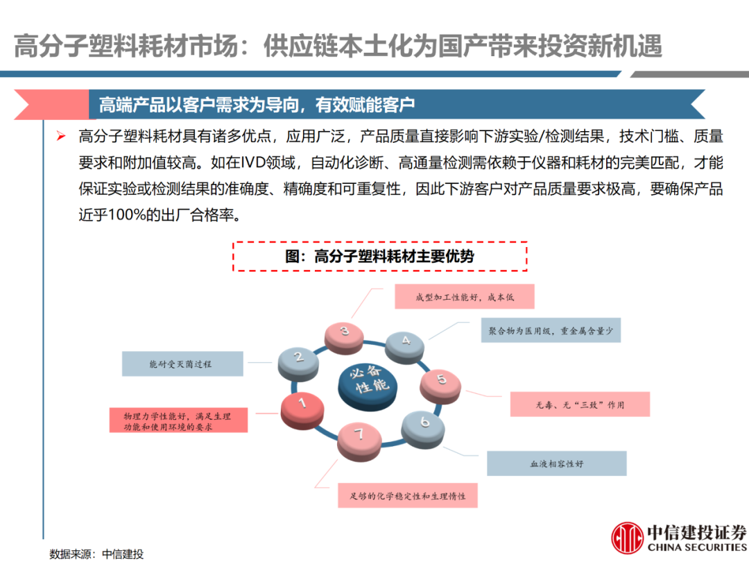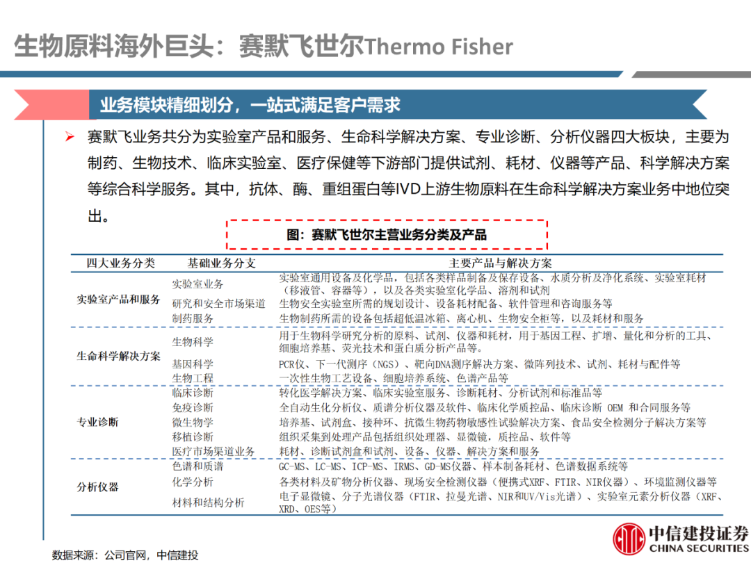 | 体外诊断上游原料需求多样,多因素推动行业高增长。IVD上游原料种类复杂,包括生物原料、塑料制品和支持性材料等。2019年全球体外诊断试剂原料市场规模预计约为303.3亿元,其中中国市场的规模预计约为62.9亿元。全球生物原料龙头赛默飞及高分子塑料龙头康宁凭借多年积累的核心技术及全面的产品布局,业绩持续实现稳健增长并取得可观的股价回报。国产品牌经过多年积累,逐渐掌握核心技术、丰富产品品类,新冠疫情爆发客观上对抗原抗体、分子酶等生物原料及高分子塑料耗材产品带来巨大需求,国内厂家近两年借此加速成长。生物核心原料:技术升级、品质驱动,国产份额快速提升。生物核心原料产品主要包括抗原、抗体、诊断酶等,疫情前takara等进口品牌占有国内80%以上市场份额。国产龙头企业多年来持续研发投入,基因工程技术用于生物原料产品的研发和生产已臻于成熟。新冠核酸、抗原及抗体检测带来上游原料的爆发性增长,国产品牌在取得大额现金流的同时,从“质量+品类+价格+效率+服务”全方位发力,国产品牌竞争力显著提升。高分子塑料耗材:“全球新冠疫情+国内IVD集采”加速供应链的本土化。体外诊断上游原料产品有反应杯、培养皿、纳米微球、NC膜等高端耗材,产品种类复杂,技术难度不一,低端产品国产化程度高,高端产品主要依赖进口。2020年新冠疫情使得全球供应链受阻,物流成本大幅增加,催使全球IVD龙头与国内供应商深度合作;此外IVD试剂集采降价压力下,国内龙头厂家也在寻找性价比更高的国内供应商,进口品牌本土化+IVD集采为国内高分子塑料耗材厂家带来良好的发展机遇。行业相关标的梳理:从“技术平台+产品”的角度,我们建议关注:诺唯赞(以高端酶为特色的生物试剂龙头)、义翘神州(蛋白试剂数量全球领先)、百普赛斯(重点布局重组蛋白)、拱东医疗(以定制业务和功能性耗材为特色)、昌红科技(高分子塑料耗材隐形冠军)、洁特生物(实验室高端耗材供应国内领先)、关注IPO已过会的菲鹏生物(IVD核心原料供应商)及近岸蛋白、康为世纪等。风险提示:新业务拓展不达预期的风险;新冠检测业务下滑过快,行业产能过剩的风险;新进入市场企业快速增加致价格大幅下降的风险;工业客户产品集采致价格下滑进而被动降价的风险。