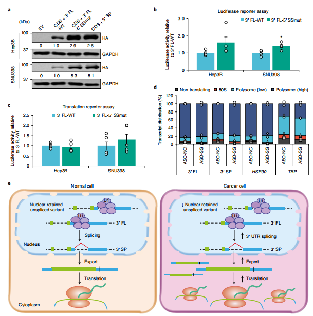 信使RNA(mRNA)包括蛋白质编码区,两侧为5′和3′非翻译区(UTR),在转录后调节中起重要作用。UTR包含许多调控序列和结构,例如AU富含元件、G富含元件和microRNA响应元件,RNA结合蛋白(RBP)和microRNAs通过这些元件调节mRNA代谢。这包括mRNA定位、稳定性和输出等过程,这些过程受到严格控制,以确保在生理条件下正确的基因表达和功能。 大多数哺乳动物基因通过各种机制产生可变3′UTR,包括可变多聚腺苷酸化(APA)和可变剪接。除了关键的生理功能外,对各种疾病状态下3′UTR突变和其他结构变异的频繁观察表明,3′UTR可能在发病机制中发挥关键作用。例如,破坏PD-L1的3′UTR的结构导至其过度表达和抗肿瘤免疫逃避。在癌症中,对可变3′UTR的研究几乎完全集中于APA衍生的较短3′UTR。重要的是,研究表明,APA导至的3′UTR缩短破坏了microRNA结合和相关的竞争性内源性RNA网络,其中转录物竞争共享的microRNA,导至癌症中关键癌基因和肿瘤抑制因子的异常表达。此外,这些缩短的3′UTR可以差异调节蛋白质功能、定位和蛋白质-蛋白质相互作用,从而赋予癌细胞致癌优势。 超过95%的人类基因经历可变剪接以显著增加转录组和蛋白质组的多样性。最近的大规模转录组学分析显示癌症中存在高频率的异常剪接。尽管数据库中对3′UTR剪接事件(3USPs)进行了注释,但迄今为止,只有少数剪接事件被表征,因为绝大多数剪接研究集中在mRNA的蛋白质编码区。 近日,来自世界各地包括新加坡、沙特阿拉伯、马来西亚、泰国、美国、加拿大等地的研究团队在杂志Nature cell biology上发表了一篇题为“Pan-cancer pervasive upregulation of 3′ UTR splicing drives tumourigenesis”的学术文章。在文章中,发现3′UTR剪接广泛存在,在癌症中上调,与不良预后相关,在癌基因中更为普遍。同时还证明了关键癌基因CTNNB1的剪接3′UTR的生理、功能和临床相关性。研究团队验证了其在肝细胞癌和结肠癌中的上调,并表明剪接的3′UTR变体是其致癌功能的主要贡献者。总之,这项研究强调了3′UTR剪接在癌症中的重要性,并可能为基于RNA的抗癌治疗开辟新途径。 图片来源:Nature cell biology 主要 内容 一 3′UTR剪接广泛存在 使用特异性位于3′UTR内的剪接连接点,研究团队从癌症基因组图谱(TCGA)的十种癌症类型和的相应组织(GTEx)中鉴定并量化了7917个RNA测序(RNA-seq)样本中的3USP。总的来说,从TCGA肿瘤及其邻近的正常样本(TCGA肿瘤和TCGA正常)中鉴定出45815和18253个3USP,而在GTEx的健康组织中鉴定出68668个事件。 对于每种癌症和组织类型,研究团队将常见的3USPs(c3USPs)定义为在超过一半的样本中检测到的事件。与3USP相比,不同数据集、癌症和组织类型中确定的c3USP总数更加一致。此外,C3USP在TCGA和GTEx数据之间具有高度可重复性,大多数在不同癌症和组织中普遍检测到。经分析,对比GENCODE注释和已发布的TCGASpliceSeq,其中约20%的C3USP是未注释的,且它们可能具有生物学功能。 转录组分析揭示了广泛的3′UTR剪接。图片来源:Nature cell biology 二 3′UTR剪接在癌症中上调。 为了确定在癌症中失调的3′UTR剪接,研究团队比较了肿瘤中每个c3USP的剪接水平(SPL)与每个TCGA癌症相邻正常样本和相应GTEx正常组织中的值。总共,1490例c3USP中有671例在至少一种癌症类型中显示出显著差异。所分析的十种癌症类型中有八种的c3USP上调比下调更显著。 接下来,研究了每种c3USP的SPL与每种实体瘤类型的总患者生存率(OS)之间的相关性。根据临床结果定义了两种与预后相关的c3USP:不利事件和有利事件,分别为SPL越高,OS越差和越好。不利事件和有利事件的比率在不同癌症类型中有所不同。研究团队将它们与不同癌症中显著失调的c3USP重叠,发现上调的c3USP明显更不利, 其中90个被确定为不利的预后标志物。总之,这些结果表明3′UTR剪接在癌症中优先上调,并可能与癌症结局相关。 3′UTR剪接在癌症中上调。图片来源:Nature cell biology 三 靶向抑制3′UTR剪接可阻止肝癌发生。 在所研究的十种癌症类型中,TCGA-LIHC (TCGA-liver HCC) 样本的3USP数量显著高于其相邻的正常样本。大量3USP与较差的OS显著相关。在31个显著上调事件中,研究团队选择了未注释为NMD靶标的前5名候选靶标(CTNNB1、CHEK1、MAPK1、THUMPD1和WDR55)用于进一步的实验验证。 研究团队设计了反义寡核苷酸(ASOs)来阻断3′UTR剪接位点。这些ASO显著降低了各自的3′SP表达,同时增加了CHEK1、CTNNB1和THUMPD1的未切片全长转录本(3′FL)。这些效应伴随着相应蛋白表达的降低和肿瘤生长的抑制,可能是由于细胞周期抑制,如细胞周期基因(包括CCNE1、CDK2、CDK4和CDK6)表达下调所示。因此,这些ASO可以特异性地抑制3′UTR剪接,这可能在调节癌基因的蛋白表达和致瘤功能中起重要作用。 靶向抑制3′UTR剪接可阻止肝癌的发生。图片来源:Nature cell biology 四 四、CTNNB1的3′UTR剪接促进肿瘤发生。 研究团队进一步检查了HCC中最普遍失调的c3USP,CTNNB1 3′SP,发现cTNNB3′UTR的过度剪接与较差的OS显著相关。与其在患者体内的表达一致,在HCC细胞系Hep3B和SNU398中,CTNNB1 3′SP上调。 为了研究CTNNB1 3′UTR剪接的功能效应,研究团队使用siRNA,专门针对CDS、3′FL的内含子和3′SP的独特剪接连接点。结果显示,与3′FL敲低相比,3′SP缺失显著降低了CTNNB1 CDS转录本和蛋白表达,表明CTNNB1蛋白主要由3′SP转录本表达。也同样观察到si-CDS和si-3′SP介导的细胞生长和迁移减少,以及小鼠异种