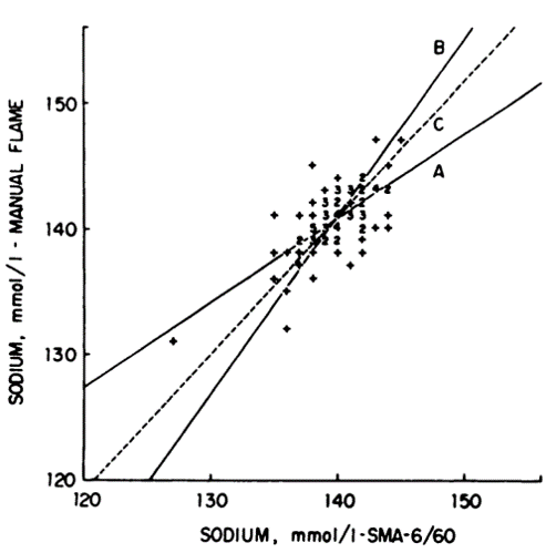 三种回归处理 - 冯仁丰 - 罗氏介绍Deming回归 在罗氏的资料中,看到了实验室诊断基础的“质量保证”小册子。该小册子概要地介绍了Deming回归统计。还有计算示例。为此,我将这个示例列在这里,供大家参考。 在回归章节中,该小册子提出: 3.6.2 回归:模式Ⅰ和Ⅱ 回归用于确定关系的类型(斜率、截距、线性)。回归在临床化学中起着关键的作用,即:校准曲线的形式和方法学比较。从统计上,涉及两个很不一样的问题。第一个涉及独立(自)变量(如:浓度)的给定值,用于推断检测因变量(如:吸光度)。这个推断是单侧的。这是回归的模式Ⅰ。 注:我认为,Bablok的回归模式I,应该是x为自变量,y为因变量的关系。 另一个例子是甘油三酯浓度对年龄的依赖关系。很明显,年龄对甘油三酯的推断是没有意义的。独立变量(年龄)实际上是无误差的,而因变量受机会变异的影响。将独立变量为x(横轴),因变量为y纵轴)。毫无疑问,因为会影响回归的计算。 相反,模式Ⅱ没有区分自变量和因变量。例如,要说明血浆甘油三酯和葡萄糖浓度的关系。统计不能用于确定甘油三酯会影响葡萄糖,或反之;最好的解释是第三变量对这两个分析物的浓度有着等同的影响。若需要将新的实验方法和已建立的方法进行比较,以确定它们是否能得到相同的结果,这个问题将有模式Ⅱ处理。 在回归模式I,即最小二乘做法。这里不再介绍。模式Ⅱ回归程序并没有包括在常见的统计中。这些回归可分为两个回归(“y对于x”和“x对于y”)。可以得到两条回归线。然后计算回归系数的几何均值予以替代(标准化的主成分分析〔Standardized principal component analysis〕,Averdunk 1970,Leonhardt 1983)。 这个回归线叙述了在均值点处的截距。这个点也被其他的回归线截取(模式Ⅱ,Deming程序)。它们的斜率为: 这个是两条回归线斜率的几何均值斜率。这就是前面说到的以两条最小二乘回归线斜率的几何均值表示的做法。 从前述的内容中,可知: 这个几何回归斜率,只有在x和y,完全相等的情况下,方可使几何回归值为1。 最小二乘与Deming回归 有文章图示说明,最小二乘回归与Deming的差异。 图中的C虚线为Deming回归线。A和B为最小二乘回归线。A线以x为准,B线以Y为准 Deming解决了模式II中的回归分析问题,通过在x和y方向上同时使残差(数据点和回归线间的距离)平和为最小(主成分分析,Cornbleet 1979,Wakkers 1975)。按照Deming的回归系数bD计算如下: 注:式中Sex和Sey分别为x方法和y方法的重复检测标准差。Sx和Sy分别为x和y方法的样品浓度分布标准差。 罗氏资料中的计算示例 现对10例样品,进行了方法1和方法2的比对,原始数据如上。 两个方法各自进行了6次重复检测,得到重复标准差分别为Sex=0.179,Sey=0.089。 三个基础的统计量: 一般直线回归中,以x为准的直线回归的斜率为: 以y为准的直线回归斜率为: x和y的相关系数为: 上述的第二个以y准的直线回归斜率,是以y轴为准。需要转换为: 可以将让两条回归线,绘制在同一个图上;在标准化主成分分析中,需要求两个斜率的几何均值斜率: ˉ 在该两个方法均值处,求截距:a=0.352 现有:Sx=1.882,Sy=1.783,Sex=0.179,Sey=0.089,有公式: 最后Deming回归的斜率与截距为: 需要注意的是,进行Deming回归还必须具有每个方法自身的重复精密度!这是其他回归处理没有的。 从上述的Deming回归计算中,用到了两个比对方法自身的重复SD比值。在Deming回归做法上,期望二者的SD非常相似;即λ比值近于1。但是在实际实验中,不一定是这样。两个常规方法比较,它们的随机误差在大小上为相同等级(即1~10、或0.1~1),则λ可以被设定为1。Deming程序一般对错误设定λ值相对地不敏感。 TO BE CONTINUED |