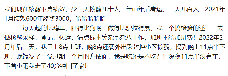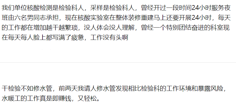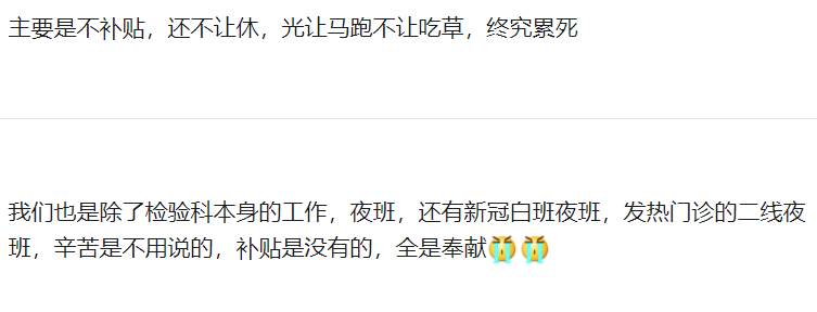以上几张图片都是小编在各个媒体收集到的最真实的检验人的留言,大家可以看出,大部分医院的在职检验人在核酸检测岗位是没有补贴和绩效的!原因是什么呢?新冠流行近三年的时间,随着需求的不断扩大,核酸检测价格越来越“亲民”,从最初的260元每次,降到单采不到40元、混采不到10元,再到现在的很多地方核酸检测免费。费用下调是利国利民的好事,核酸检测价格的不断下调,大大减轻了民众的经济负担。但事情总有两面性,利的另一面就是弊。多名业内人士告诉我们,按照当前的核酸检测价格,这一业务在医院是“亏本的”,一线医务人员拿着为数不多的补贴,在超常的工作状态下付出。