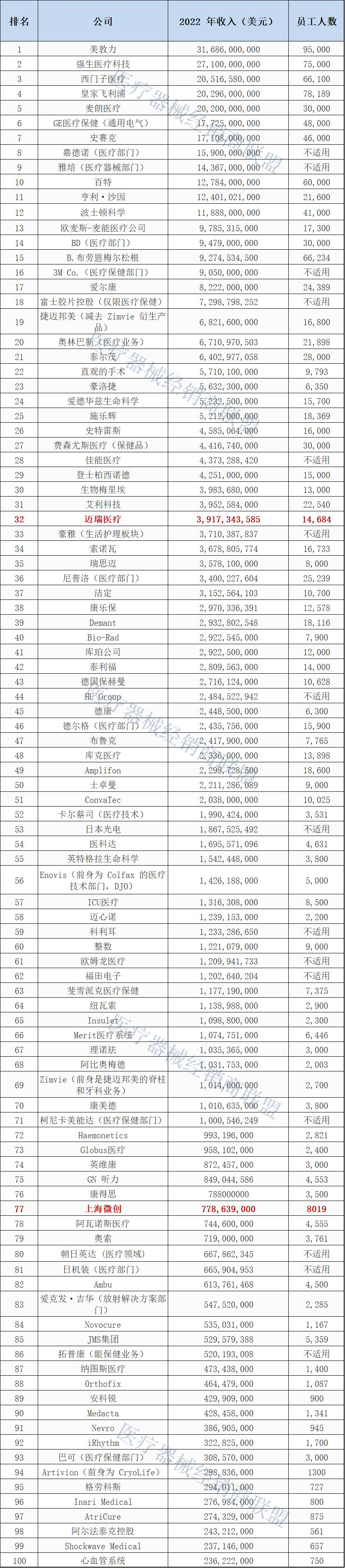 2022 年收入(美元):12,784,000,000 美元2022 年研发支出:534,000,000 美元在 2021 年底完成对 Hillrom 的 125 亿美元收购后,Baxter 在今年最大的医疗器械公司 100 强报告中上升了两位至第 10 位。该公司预计该交易的协同效应将有助于推动未来三年的销售增长势头。百特在 5 月份表示,它将这些好处归因于更广泛的投资组合中市场扩张的影响,以及公司通过收购获得的扩展能力所推动的新创新。与 Hillrom 合并的主要部分涉及加速公司向数字和互联护理产品的扩张,使患者能够在家中或其他护理环境中获得医院级护理。例如,Baxter 现在是 BardyDx 及其 Carnation Ambulatory Monitor 的母公司,这是一种轻量级、可长时间佩戴的心脏 ECG 贴片。2022 年收入(美元):14,367,000,000 美元雅培在 2022 年发表了有史以来的第一个医疗保健主题演讲。福特在他的主题演讲中透露,雅培正在为运动员开发一种名为“Lingo”的新型生物可穿戴设备。该公司今年还发布了医疗技术公告:雅培在一月份宣布 FDA 批准该公司的 Proclaim 脊髓刺激系统的新 MRI 兼容性。2022 年收入(美元):15,900,000,000 美元继去年以 10 亿美元出售 Cordis 后,Cardinal Health 继续努力重新聚焦其医疗业务。根据 Cardinal Health 8 月份的第四季度报告,医疗器械业务面临的挑战包括通货膨胀、供应链限制以及对个人防护设备的需求减少。在其他新闻中,Cardinal Health 一直在尝试用无人机运送医疗用品。Zipline 及其 Zip 交付无人机机队现在正在飞往 Cardinal Health、 Novant Health 和 Magellan Rx Management 来自北卡罗来纳州的一个中心。2022 年收入(美元):17,108,000,000 美元2022 年研发支出:1,235,000,000 美元Stryker 表示,他们已经从以 31 亿美元收购数字护理协调和通信产品提供商 Vocera Communications 中获得了协同效应。Vocera Communications 的产品包括免提 Vocera Smartbadge。7 月初,这家全球最大的骨科器械公司提高了对 2022 年的收入预测,预计有机销售额将增长 8% 至 9%。然而,在收入增长方面,强势美元和供应链中断带来了挑战。尽管强生公司的 DePuy Synthes、Zimmer Biomet 和 Smith+Nephew 在机器人骨科手术领域的竞争加剧,但 Stryker 的 Mako 销售额仍在增长。2022 年第二季度 Mako 销售额同比增长 19%。2022 年收入(美元):17,725,000,000 美元2022 年研发支出:847,000,000 美元通用电气医疗集团(GE HealthCare)正准备在明年初剥离成为自己的独立公司,并保留原有名称。为了更好地竞争,该公司一直在转向大型合伙交易,而非并购交易。通用电气医疗集团1月份表示,它正在与波士顿科技公司合作,在东南亚开展心脏护理业务。今年4月,有消息称,该公司与 Elekta 在放射肿瘤领域达成了一项全球商业合作协议,此举可能有助于该公司更好地与西门子(Siemens Healthineers)竞争。在与美敦力公司建立伙伴关系后不久,该公司宣布将为日益壮大的门诊手术中心(ASC)和办公室实验室(OBL)部门提供各种产品和服务。在其他方面,该公司发布了下一代Definium 656 HD X 射线系统。2022 年收入(美元):20,200,000,000 美元私人控股的 Medline Industries 在今年最大的医疗器械公司 100 强报告中名列前茅。去年销售额增长近 15%,达到 202 亿美元。这家医疗技术制造商和分销商在其主要供应商合作伙伴关系中增加了 230 多家医疗保健供应商。与此同时,Blackstone、Carlyle 和 Hellman & Friedman 对 Medline 进行了数十亿美元的投资,而 Mills 家族仍然是最大的单一股东。Medline 将花费 15 亿美元用于新的配送中心、制造能力和 IT 升级。2022 年收入(美元):20,296,000,000 美元2022 年收入(外币):17,200,000,000 欧元2022 年研发支出:2,131,080,000 美元飞利浦在过去一年中最引人注目的故事是其大规模召回涉及超过 100 万台 CPAP、呼吸机和其他呼吸设备。此次召回已将这家荷兰医疗技术巨头从呼吸设备市场中撤出,有关问题的报道越来越多。8 月份有消息称,与召回有关的死亡人数增加了 44 人。FDA 的更新使死亡总数达到 168 人,提交了 69,000 份医疗器械报告 (MDR)。在新的 FDA 报告发布的同时,飞利浦宣布计划让 Roy Jakobs 接替 Frans van Houten 担任总裁兼首席执行官,自 10 月 15 日起生效。Jakobs 一直是该公司的 Connected Care 首席业务负责人。他于 2021 年 6 月接管了飞利浦伟康的召回工作。呼吸设备问题源于可能分解的聚酯基聚氨酯消音泡沫。泡沫颗粒可能会进入设备的空气通道,对用户造成一系列潜在的健康问题和有毒、致癌的影响。FDA 和联邦检察官越来越多地审查飞利浦如何处理召回事件。5月 2 日,FDA 提出命令,要求飞利浦提交召回设备的维修、更换或退还购买价格的计划。2022 年收入(美元):20,516,580,000 美元2022 年收入(外币):17,997,000,000 欧元2022 年研发支出:1,762,440,000 美元这家德国医疗技术巨头在 2022 年最大的 100 家医疗设备公司中排名第三。它的创新根源可以追溯到 1890 年代后期,当时它在威廉·康拉德·伦琴 (Wilhelm Conrad Roentgen) 发现 X 一年后创造了第一台医用 X 射线设备-射线。2018 年从西门子剥离出来成为自己的上市公司,西门子医疗在 2021 年完成了对瓦里安医疗系统的 164 亿美元收购后变得更大。西门子医疗表示,与瓦里安的合并创造了业内最全面的癌症护理产品组合。该公司的尖端技术涵盖成像、诊断和癌症治疗。最近的胜利包括FDA 批准将公司的 Cios Spin 移动锥形束 CT 成像技术与 Intuitive 的 Ion 机器人辅助支气管镜检查系统相结合。Siemens Healthineers坚持其截至 202