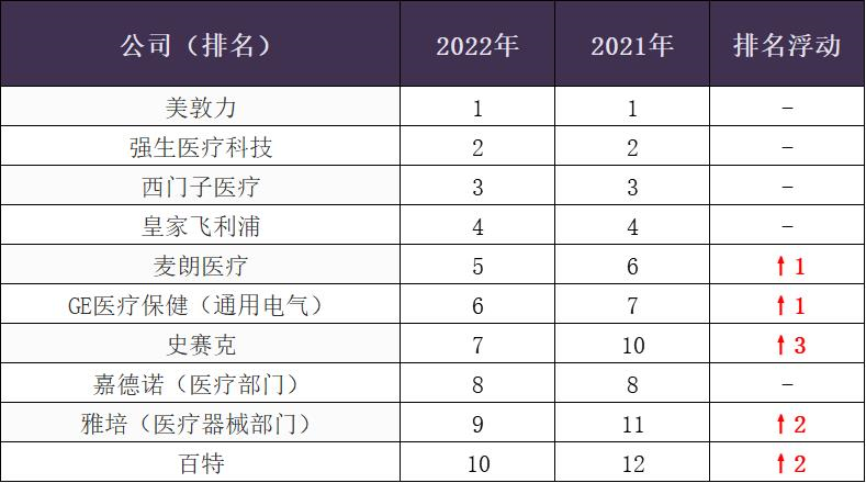 | 9月9日,医疗器械行业网站 Medical Design & Outsourcing 发布了最新的2022年全球医疗器械公司百强榜。根据这份榜单,我们看到了一些最新的发展趋势,包括:包括大型企业集团将医疗器械公司分拆成独立的业务。为了保持竞争力,包括通用电气医疗(GE HealthCare)在内的一些大公司也转向了实质性的合作,而不是彻底的并购。此外,医疗技术公司不得不应对宏观经济方面的不利因素,其中包括美元走强导至美国企业更难出口、通胀、供应链中断等等。但同时,我们也看到了国内企业与顶级械企之间的巨大差距,但从发展潜力上来看,中国的医疗器械企业也在不断显露出越来越迅猛的势头,在国产化替代与全球化的双重浪潮下,中国的医疗器械龙头,正在往更高的山峰进发。据统计,本次入选百强的所有械企总年营收达到了4407亿美元。排名前10的医疗器械企业为:美敦力、强生、西门子医疗、麦德林工业、GE医疗、史赛克、嘉德诺、雅培、百特。其中,美敦力、强生、西门子继续蝉联前三,总收入(美元)分别达到了:316.86亿、271亿、205.17亿。排名波动最大的是史赛克,从2021年排名第十跃升至第七。此外,相比2021年榜单,2022年TOP100强中,有两家国产知名械企上榜,分别是迈瑞医疗、上海微创,位列32位、77位,总收入(美元)分别为:39.17亿、7.78亿。
