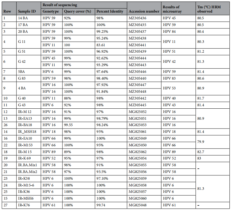 // 人类乳头状瘤病毒(HPV)是女性第二大癌症宫颈癌的主要致病因素。由于其高度多样性,人类乳头状肿瘤病毒的基因分型具有挑战性。确定这种病毒的基因型在打破感染传播周期、治疗管理和疫苗开发方面起着至关重要的作用,导至避免癌症的发生。当通过PCR和深度测序分析宫颈癌时,HPV在宫颈癌样本中的检出率>92%。 HPV对女性的严重危险及其与不同癌症的关系必然需要通过敏感和快速的方法进行基因分型。在各种研究中,已尝试通过核苷酸测序、DNA芯片、杂交、反向线点(RLB)分析、通用或特异性探针、liquid bead microarray assay(LBM)等对HPV进行基因分型。DNA测序是准确病毒分型的金标准测定方法;microarray提供了基因型特异性信息,可以检测混合型HPV感染的存在,但这两种技术都很昂贵,而且检测点也非随处可见。与上述两种方法相比,杂交DNA-RNA方法可检测13种高危人乳头瘤病毒,但没有其类型特异性。RLB测定法的重复性有限,除了高费用外,建立起来也很困难。 还有其他快速和准确的方法,如基于探针的方法,但由于价格很昂贵,不能用作常规筛选方法。由于为基因型特异性PCR设计多个兼容引物集具有挑战性,因此在单个检测中可检测到的人乳头瘤病毒的最大种类相对有限。因此,qPCR和高分辨率熔解(HRM)两种技术的组合可用于基因分型。qPCR的一个优点是,用于进行PCR后高分辨率熔解曲线分析提供了关于特异性的额外信息。特别是对于具有高度同源性的靶,如HPV,熔解温度的额外细节,对于减少假阳性是有价值的。HRM是研究基因组中SNP、插入和/或缺失等遗传变异的最有力方法之一。该方法的基本原理是核酸序列的微小变化导至熔解曲线的可检测改变,以及扩增PCR序列的差异。这一特征在基因分型和其他应用中具有重要作用,包括发现基因变异、突变筛查、甲基化分析等。 近日,来自伊朗阿富汗的一组研究团队在杂志Scientific reports上发表了一篇题为“Discrimination of human papillomavirus genotypes using innovative technique nested-high resolution melting”的文章,在文章中,研究团队设计了一种nested HRM技术,并使用通过microarray以及诊断标准鉴定出的HPV阳性样本对qPCR-HRM进行评估,并对不一致的结果进行测序。研究团队的目标是设计一种快速、敏感、特异和成本效益高的宫颈癌样本HPV基因型诊断新方法。 图片来源:Scientific reports 主要内容 一、DNA分析和引物设计。 成功提取了宫颈组织DNA,基因组DNA浓度范围为50至387 ng/μl。此外,所有DNA样本平均A260/A280比率约为1.82,这表明DNA纯度高。在所有样品中观察到β-actin基因,作为大小为120 bp的内部提取对照。 使用简并引物FRG5和MY09对HPV L1区进行PCR扩增,可检测出100个HPV阳性样本。另一对引物FRG5/FRG2扩增了215–221 bp的HPV L1区域,相应的扩增子产生了多达七种不同的HPV基因型(6、16、18、52、59、66和89)。 二、semi-nested qPCR-HRM可区分HPV6、16、18、52、59、66和89 FRG5/2引物的semi-nested qPCR-HRM显示Tm可区分HPV16、52、59、66和89。HPV16,52、59和66被分类为高风险,HPV89被分类为低/无风险。然而,HPV 18和HPV 6显示出非常相似的熔解曲线,尽管在所选的FRG2/5区域中显示了61个碱基差异和72.4%的核苷酸相似性。 为了区分HPV 18和6,将未标记的prob18添加到反应混合物中,并作为第二种方法重复测试。在HPV6质粒中观察到两个峰,从而能够区分HPV18。 在第三种方法中,反应混合物中添加GP5+引物,以观察该单一引物对HPV基因型的识别效果。令人惊讶的是,FRG2/FRG5和GP5+引物区分了HPV 6和HPV18。该方法用于通过microarray鉴定的HPV阳性样本,观察结果表明结果是可重复的。 semi-nested qPCR-HRM区分HPV6、16、18、52、59、66和89。图片来源:Scientific reports 三、nested HRM与microarray的不一致 使用microarray和诊断标准对HPV阳性样本进行基因分型的结果与nested HRM分型结果有不一致的地方。为了澄清创新技术nested HRM和microarray产生的矛盾,将PCR产物发送测序。 4 BA 分离物4 BA的序列(microarray分型为HPV 53;nested qPCR HRM分型为HPV 16)显示了在进行blast时与HPV 16型的最高相似性。来自HPV16和HPV53的218bp和215bp FRG5/2扩增子的生物信息学分析显示30.28%的核苷酸差异,其显著性足以不被认为是测序错误。 G45 microarray将分离物G45基因分型为HPV45,但具有与HPV 59相似的温度模式,在NCBI数据库(MZ305436)中对测序结果进行分析后,确定为HPV 59。 G83和20BA microarray将G83和20BA基因分型为HPV 83和HPV 84,但是桑格测序结果确认为HPV 59。而在生物信息学上,HPV83和HPV84中使用FRG2/FRG5引物的扩增区与HPV 59的相似性分别为69.68%和75.11%。 G11 分离物G11的HPV DNA被测序确认为HPV 11和59的混合物,其在方法1和2中具有相似的熔解曲线。两种基因型在65个碱基上存在差异,在诊断区域具有70.72%的相似性,生物信息学预测,它们可以通过0.6°C的熔融温度差异进行区分。 G42 microarray方法将G42分离物基因分型为HPV42,但测序结果认为是HPV 11和45型的混合。基因型11和45分别与基因型42具有72.09%和71.88%的同一性。 G40 此外,microarray方法将G40分离物基因分型为HPV40,通过测序确认为HPV 11。两种基因型的熔解温度在生物信息学方面相差约1.5度,其在扩增区的序列具有71个碱基差异和68.30%的同一性。 5BA和G43 microarray方法将5BA和G43分型为HPV 59和43。测序后,两个分离株均被确认为HPV 6。检测这两个样品的第一种方法显示相同的熔解曲线。 三种方法(微阵列、测序和HRM)对阳性样本中的HPV进行基因