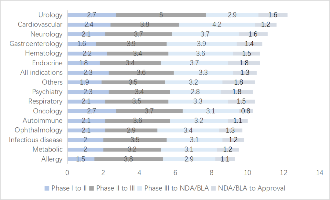 药物从1期临床到最后获得监管批准平均需要10.5年。其中,1期临床到2期临床平均需要2.3年,2期临床到3期临床平均需要3.6年,3期临床到递交上市申请平均需要3.3年,递交上市申请到获得批准平均需要1.3年。