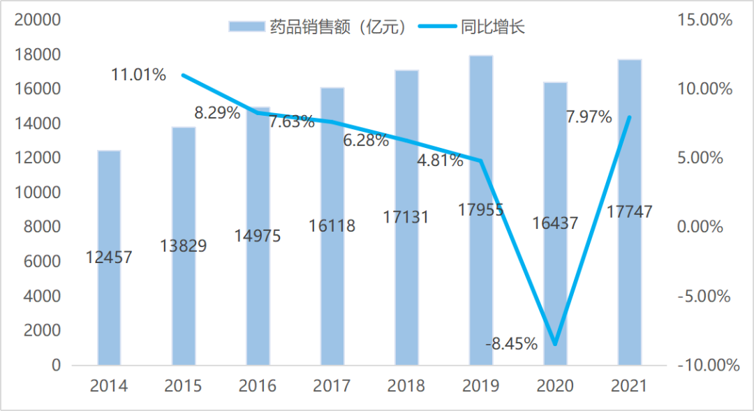 2021年中国三大终端药品销售额达17747亿元,较2020年增加了1310亿元,同比增长7.97%。