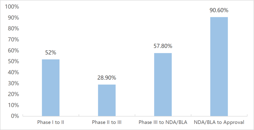 1期临床到2期临床的成功率为52.0%(n=4414),相对较高,原因之一是该阶段主要测试药物的安全性,不依赖于候选药物的有效性。与以往药物开发阶段转化成功率的研究一致,2期临床到3期临床的成功率在四个阶段中最低,为28.9%(n=4933),这是因为2期临床不仅是首次在人体中进行概念性验证试验,也是决定临床试验是否继续的关键节点。3期临床到提交新药上市申请(NDA)/生物制品许可申请(BLA)的成功率为57.8%(n=1928)。在四个开发阶段中,转化成功率最高的是从递交NDA/BLA到获得FDA批准的阶段,为90.6%(n=1453)。
