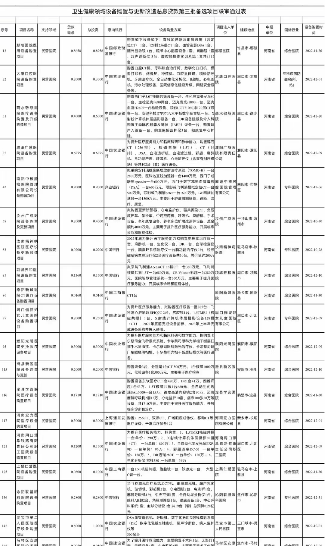 这段时间,贴息贷款政策下发后,整个行业都在抢生意。全国各地,各大公立、民营医院都在报贷款申请额度、采购清单! 落地超预期,大批医院积极响应 据了解,浙江、江苏、安徽、福建比较积极,四个省已经上报了 300 亿,福建省要求一个县医院必须报1亿元。市场预计全国千亿级医疗设备更新改造需求即将释放。 此外,截至目前,北京市设备更新改造贷款合同金额124亿元,已进入贷款审批程序或已签订贷款意向协议的金额近170亿元,;湖北省紧随其后,签订贷款合同34笔,合同签订金额约72亿元;重庆市共有64个重点领域设备更新改造项目签订贷款合同,金额合计61亿元。贷款合同金额超50亿的省份还有四川省、辽宁省和贵州省。 下图为社群分享的广东地区医院上报贷款金额明细,最高超过5个亿,第一批累计超过100亿,据业内人士透露说其他省份还有医院申请了10个亿。 在2010年前后,卫生行业有文件规定医疗机构不允许贷款购买设备。在中央和地方财政投入不足的情况下,医疗系统的基建和设备购买面临巨大的资金缺口。这次贴息贷款政策一方面是促进消费,另一方面医疗行业疫情之后在方舱及新冠储备医院、急救能力建设、千县工程和区域医疗中心等方面有建设需求,原本有些项目有财政预算, 但由于疫情后财政预算吃紧迟迟没有落实。 而这笔钱填补医疗建设的资金缺口。 大部分医院,直接上报确定意向品牌 比如朋友圈下图关于《卫生健康设备购置与更新改造贴息贷款第三批备选项目联审通过表》,显示都已经是第三批了,而且很多医院都直接报哪些品牌,涉及各类医疗设备。 民营医院这次也被参与进来,现在民营医院数量规模比公立医院还大,可以预测2000亿估计都不够。 随着需求的不断上报,大批品牌将在年底前收获大量订单,2023年将出现大批装机潮。 各大企业,销售都在疯抢订单 这几年县级医院发展好,效益突飞猛进,京广铁路以东的很多县级医院年收入十个亿,2千万的申报门槛其实并不高;另一方面,千县工程中有升三甲医院的需求,需要64排以上的CT、3.0T MR、DSA、高端内镜、彩超、大型生化流水线和病理检测设备等。 很多医疗企业员工都在找医院,把每个省申请了贷款的医院清单拉出来,没有确定项目的,直接上门做工作。 当下疫情导至经济不好,大力扶持民族产业,尤其是医疗行业,重资产性质。疫情期间对医疗行业需求大,上下游行业多,现金流稳,贴息刺激的不仅是医院本身,医疗设备厂商运营情况也不太好,所以也创造了内需。 随着这波内需刺激之后,医疗设备行业会不会被提前“透支”,“大跃进”之后,很难说医疗大设备能否稳定持续增长。 |