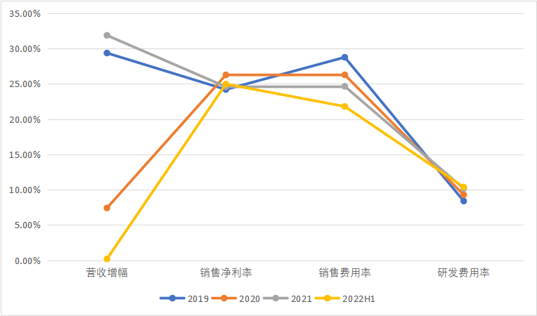 中国医疗设备上市企业近三年营收趋势 医疗设备通常来说技术壁垒较高,产品单价较贵,医疗机构采购周期较长,一般有“三年不开张,开张吃三年”的潜规则。此外,研发和销售投入较高,仅次于高值耗材,因此销售净利率在20%左右,低于高值耗材和IVD。2022上半年,随着中国疫情形势放缓,在疫情下高速增长的CT、呼吸机营收增速放缓。海泰新光、奕瑞科技主要为全球医疗影像设备企业提供关键零部件,因此,净利率高主要因为销售费用率分别以3.37%,4.98%位于医疗设备领域最低。2022上半年,- 海泰新光营收1.96亿元(+45%),净利润0.79亿元(+35.6%),海外营收占比75.67%;