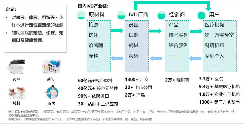 来源:36氪、体外诊断网 作者:杭实资管研究员 朱之颜 1.1体外诊断(IVD)概念和产业链广义上,体外诊断(IVD)是指对人体样本(血液、体液、组织)进行定性或定量的检测,用来辅助疾病的预防、诊疗、预后和健康管理。狭义上,指体外诊断产品和体外诊断服务,前者包括仪器、试剂和耗材。 国内IVD产业链由三部分构成。 上游是原材料,包括试剂中的抗原、抗体、诊断酶等,以及仪器相关元器件。由于原材料直接影响检测成果,对稳定性要求高,我国90%的原材料依赖进口。 中游是IVD厂商——本文主要研究对象,输出仪器、试剂、服务。在我国,海外五大巨头占据50%的市场,而国产厂家整体呈现小而散的竞争格局。1300多家IVD厂家中,大多是小型试剂企业,同时具备试剂和仪器研发能力的企业凤毛麟角。 下游是经销商和用户:行业内有2万多个经销商,不仅为终端用户提供产品,还输出技术支持;终端用户主要有医疗机构、第三方实验室、科研机构、家庭个人等。其中,医疗机构是主要用户。我国有3.3万家医院、9.4万所基层医疗机构、1.8万所专业公卫机构。 体外诊断(IVD)概念和产业链 1.2 行业发展简史 IVD行业在我国经历了六个阶段: