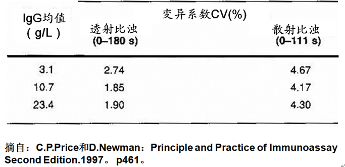 免疫散射比浊法与免疫透视比浊法 冯仁丰 二、散射和透射的关系 历史上,1938年开始出现了 “光反射仪(photon reflectometer)”和以后的“散射仪”。它们在某个固定角度检测散射光强度,即检测液体的“浊度”。以后为临床实验室设计专用仪器,去检测常规程序需要的免疫沉淀结果。至今,还有两个公司的免疫散射比浊专用分析仪。一个是现在的美国DADE BEHRING MARBURG公司,该公司购买了德国的原Behringer公司所有产权,包括了著名的BN°II系统散射分析仪。BN°II分析仪为固定时间模式,但在固定时间下采用了多个检测模式,在约角度10°进行检测。另一个是美国Beckman公司。ARRAY散射比浊分析仪,强调采用速率检测,被称为“速率散射仪”,在角度约60°进行检测;这两个产品依然在使用。 散射比浊信号不能被表达为分子或摩尔消光系数,它们以毫伏(millivolt)或bit为仪器读数。自1954年起,免疫沉淀的散射光强度也间接地以透过光强度的减少进行检测。这个原理被称为“透射比浊法[turbidimetry]”。透射比浊或散射比浊检测设计中,它们的光检测器位置与入射光的光路中不同,可见图6。 图6、散射比浊和透射比浊仪器不同光检测器位置示意图。 在透射比浊检测中,检测了未散射的光量和直接向前光散射的总量。因散射使光在180°方的上的损失,造成犹如 “虚拟”的光吸收表现。所以,透射比浊信号被检测的是吸光度。 光度计的设计要求极度注意平行光,但是对光检测器和透镜的距离和位置不必很严密。可是在散射分析仪中,因散射光的射向四方,厂商在仪器设计和制造中,非常重视光检测器的位置、与入射光的角度,必须确保检测散射光结果的再现性。透射比浊检测在原理上与任何光度计一样,必须保持入射光和射出光始终呈一条直线,保持180°角度。 所以,在不同品牌的光度计间,吸光度检测结果是可比较的,但透射比浊读数在不同光度计间有显著变异(图7)。进行比色检测下,光检测器和比色杯间的距离不会对吸光度检测有影响,但在散射比浊上,光检测器与比色杯位置不同的仪器间,被检测的散射光表现的吸光度值的比浊读数有很大差异。 图7、光检测器位置对透射比浊信号的影响。 另外,由于进行散射比浊出现的光散射值,检测的是发生散射的光强度。而使用透射比浊的读数,是被免疫颗粒散射后余下的射出光与未经散射前入射光的比值。吸光度读数很大,实际上是被散射后余下射出光的强度很小。因此,在散射比浊仪上检测的散射光强度越高,得到的散射光读数更大。为了让散射仪器可以检出合适的散射光强度,散射比浊必须将检测样品进行很大的倍数稀释后再行检测。而这样的稀释,会需要进行多次。使得最后反应后检测读数的精密度受到很大的影响。散射比浊检测的灵敏度很高,但是检测的重复性有问题!有文章报告(图8),对样品中IgG检测,使用了散射比浊和透射比浊。得到的IgG的均值大致相同;但检测的不精密度还是散射要差得多。 图8、透射比浊和散射比浊的蛋白检测精密度 出现散射比浊结果精密度要差于透射比浊结果的原因,还是散射比浊检出的是被免疫复合物散射出来的光强。样品中某个蛋白质含量较高下,它与试剂中聚苯乙烯上的对应抗体反应产生的凝聚颗粒越多。在此情况下,要使散射比浊检测的光强在一定的范围内,必须对检测样品进行更大倍数的稀释。在BN°II的免疫散射比浊仪上,专门具有系列稀释样品的自动操作功能。以下为该产品说明书上的摘录: 7.3.6.5 样品稀释 需要时,病人样品的稀释由系统用N个稀释液,按多个稀释步骤自动完成(1:5、1:20、1:100、1:400、1:2000、1:8000、和1:40000)。在一些情况下,这样的处理是很必要的。 在BN II操作说明书中,有图示说明,在它们的散射比浊分析仪上,仪器自动进行样品稀释。如下图所示(图9)。 图9、BN II免疫散射比浊分析仪样品自动稀释示意图 由此,说明了在免疫散射比浊分析仪上,样品多次被成倍稀释后再检测,检测结果的精密度,随着样品内被分析物的浓度越高,它的重复性就越有问题。这就是散射比浊的一个严重问题!相比之下,使用一般自动分析仪,几乎不存在检测前对样品进行如此的预稀释。进行免疫透射比浊确实会得到全世界的临床实验室人员的喜爱!方便和实在。 从所有实际的目的上考虑,免疫散射比浊与免疫透射比浊间对蛋白进行免疫沉淀方法的检测,相互间差异很小。从工作量考虑透射比浊,越来越普遍在,因为它可应用到常规的临床化学分析仪上。酶和底物测定,与蛋白检测结合。特别有优势,对尿液白蛋白的浓度,无论是散射比浊或透射比浊,都必须被标准化到其他参数,如肌酐。 TO BE CONTINUED |