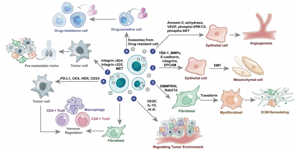 外泌体来自多囊泡体(MVB),在电子显微镜下呈杯状,直径为50至150 纳米。外泌体是由各种细胞自然分泌的,通常在体液中检测到,包括血液、尿液、腹水和唾液。外泌体“货物”包括核酸、蛋白质、脂类、酶和指示母细胞生理状况的代谢物。外泌体被认为通过与细胞膜直接融合、内吞途径和配体-受体相互作用在细胞-细胞通信中发挥作用。 肿瘤衍生(TD)外泌体由肿瘤细胞释放,并携带能反映亲代肿瘤细胞特征的物质。因此,外泌体可作为肿瘤诊断标记物。作为微环境中肿瘤细胞与非肿瘤细胞之间的重要通讯形式,外泌体在肿瘤发展的不同阶段发挥着重要作用,包括肿瘤相关免疫调节、微环境重建、血管生成、侵袭和远处转移。在不同类型和不同阶段的癌症中,外泌体蛋白的表达谱往往存在显著差异,这表明这些蛋白与癌症的发展和进展密切相关。此外,TD外泌体的其他功能也不容忽视,包括参与限制免疫调节和增强化疗耐药性,可能促进原发性肿瘤生长和转移。 近日,来自中国的研究团队在杂志Experimental & Molecular Medicine上发表了一篇题为“The updated role of exosomal proteins in the diagnosis, prognosis, and treatment of cancer”的综述文章。在这篇综述中,研究团队总结了外泌体蛋白对肿瘤发展的影响,强调了外泌体蛋白质在各种癌症中的诊断和预后作用,并说明了外泌体蛋白质在癌症治疗中的潜在应用。本综述旨在全面了解外泌体蛋白的生物学机制和临床价值,加深对外泌体蛋白在肿瘤发生和癌症进展中的作用的理解,并为进一步的应用和研究提供建议。 图片来源:Experimental & Molecular Medicine 一、外泌体蛋白及诊断优势 外泌体蛋白质要么封装在内腔内,要么嵌入外泌体表面,这使得基于表面生物标记物的外泌体亚型分类能够在不破坏其结构的情况下进行。由经历病理过程的细胞分泌的外泌体具有不同的成分,可作为其状态的标记。 与其他外泌体货物相比,外泌体蛋白质在癌症诊断方面具有以下优势:(1)外泌体蛋白在外泌体中稳定,半衰期长。此外,外泌体内的蛋白质可以直接作用于靶细胞,而核酸必须在发挥活性之前转录或翻译。因此,外泌体蛋白质的定量和定性数据可以提供比其他货物更准确的信息。(2) 与其他外泌体货物相比,外泌体表面蛋白可以在一个相对简单的分离程序后在较小的样本量中检测到。外泌体蛋白质可以提供丰富、稳定、敏感的和独特的信息。(3) 由于基于质谱的检测技术的进步以及数据收集和分析方法的不断优化,比较蛋白质组学的蛋白质覆盖率和灵敏度都有所提高,癌症患者尿液中的特异性外泌体蛋白可以检测到。蛋白质组学工具在外泌体研究中分析翻译后修饰的应用也增加了外泌体蛋白质组学数据在癌症发病机制、功能和疾病关联方面的深度。 外泌体表面蛋白及其作用。 图片来源:Experimental & Molecular Medicine 二、外泌体蛋白对肿瘤生物学的影响 外泌体蛋白与血管生成、上皮-间质转化、肿瘤微环境和耐药性 携带VEGF的外泌体可能对早期肿瘤血管生成至关重要。研究表明外泌体蛋白与血管生成和血管通透性相关,从而促进癌症进展。 在癌症中,上皮-间充质转化(EMT)是上皮细胞转化为间充质细胞的一个特殊过程。间充质细胞源性外泌体的蛋白质组分析显示,一些上皮生物标记物(如E-cadherin和EpCAM)减少,而间充质生物标记物(如vimentin)和蛋白酶(如MMP-1)增加。因此,需要彻底认识外泌体蛋白在EMT中的功能。 肿瘤细胞可以与肿瘤微环境(TME)内的各种类型的非癌细胞相互作用。作为细胞外环境的组成部分,组织源性外泌体在TME中启动ECM重塑的能力对肿瘤细胞的存活至关重要。外泌体蛋白除了对ECM重塑的影响外,还可以通过免疫调节影响TME。综上所述,外泌体蛋白对改变微环境的免疫调节有多方面的影响。 外泌体介导的多药耐药也是癌症发展的一个重要机制。其基本机制涉及外泌体介导的钙依赖性蛋白激酶激活和Raf/MEK/ERK级联。除此之外,外泌体还可以通过控制P-糖蛋白的表达将耐药多药耐药性传递给对敏感个体。外泌体蛋白被认为是耐药的重要介导物,进一步的研究表明外泌体蛋白在癌症治疗中的应用。 外泌体蛋白在癌症生物学中的作用。 图片来源:Experimental & Molecular Medicine 三、外泌体蛋白在人类癌症中的诊断价值 尽管外泌体的内容不断被重新定义,外泌体载体的优势和独特性已证明其作为肿瘤标记物的巨大潜力。位于外泌体表面或膜内的蛋白质也可以用作癌症生物标记物。与其他类型的外泌体货物(DNA、mRNA、miRNA、circRNA、lncRNA和代谢物)相比,蛋白质可以提供丰富、稳定、敏感和独特的信息。外泌体蛋白被报道为多种癌症的特异性诊断和预后因素,包括乳腺癌、泌尿系统癌症、肺癌、胃癌、肝癌、结直肠癌、卵巢癌、甲状腺癌和胰腺癌(如下图)。 多种类型人类癌症的外泌体蛋白生物标记物。图片来源:Experimental & Molecular Medicine 乳腺癌 在世界范围内,乳腺癌已成为女性中最常见的癌症。研究证明,ADAM10、金属蛋白酶、CD9、Annexin‐和HSP70在乳腺癌患者胸腔积液或血清中分离的外泌体中富集。Moon等人提出了fibronectin和Del-1在乳腺癌细胞源性外泌体中的诊断价值,AUC为0.961,敏感性为94.70%,特异性为86.36%。此外,血清中外泌体survivin‐B的独特表达模式被认为是早期乳腺癌的标志。与5年无病对照组相比,这些患者的血清外泌体survivin-2B水平显著升高