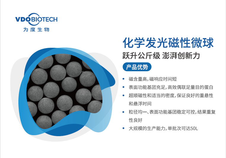 化学发光磁性微球风头正劲 化学发光作为目前IVD的“顶流赛道”,是行业竞争的焦点。此次展会上,为度生物化学发光磁性微球成为了备受瞩目的产品。为度生物在产品性能与产能方面双管齐下,全面赋能客户的化学发光试剂产品开发。全新升级的化学发光磁性微球,具有超顺磁性、磁含量适中、优异的重悬性和较快的磁响应速度等特点。同时单批次公斤级产能,实现了规模化供应且性能稳定;并可根据客户需求提供微球的个性化解决方案,为广大客户开发不同的技术路线提供了更为丰富的选择。