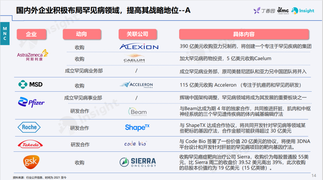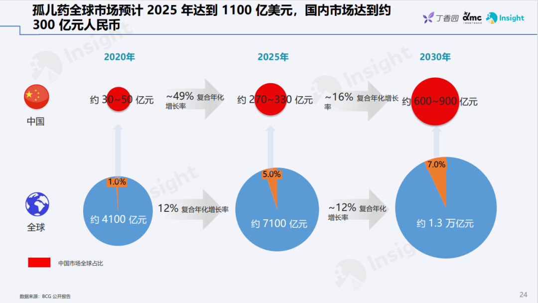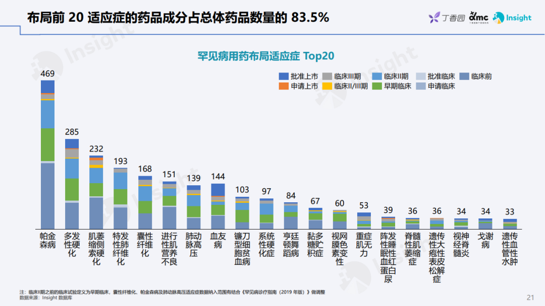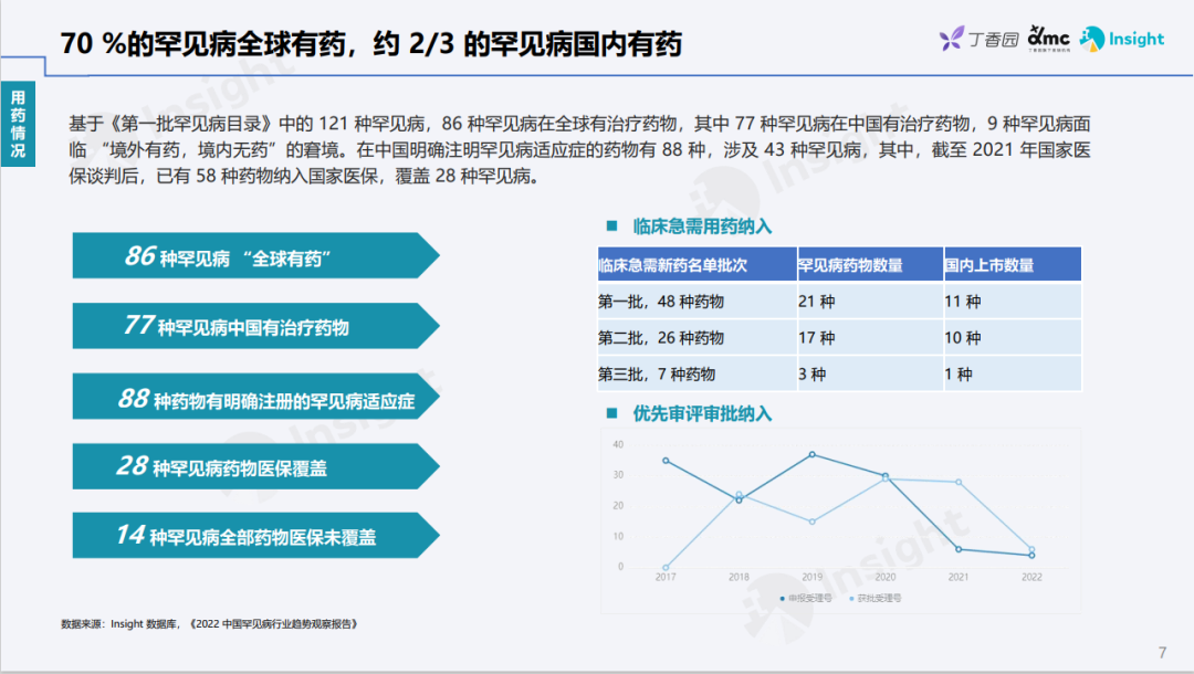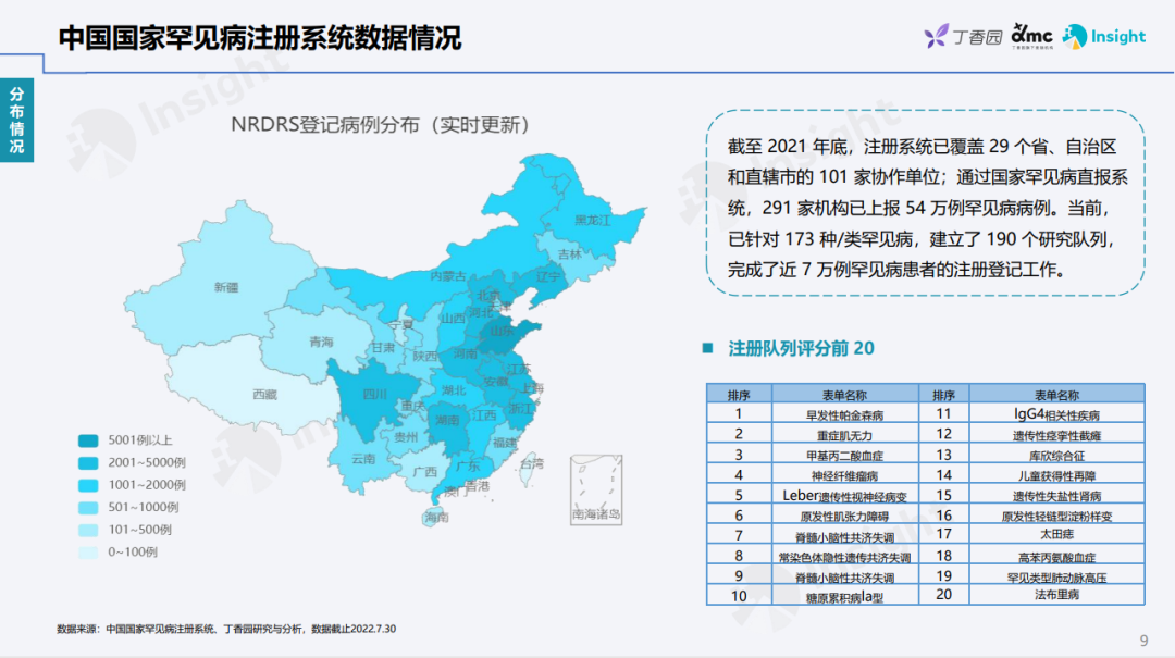 为了助力业内人士全面了解罕见病现状及其药物的研发情况,丁香园 Insight 数据库推出「罕见病领域报告」 罕见病防控正在得到加强 世卫组织统计显示,2017年全球发现的罕见病介于5000~8000种,受累患者约有2.5亿,其中50%以上是儿童。中国由于人口基数巨大,仅粗略统计,受罕见病影响的患者便有上千万之多。鉴于此,加强罕见病基础与临床研究,不但有利于相关药物的研发转化,同时也具有体现社会公平原则的重大社会意义。 2019 年,由中国罕见病联盟牵头,联合北京协和医院、北京病痛挑战公益基金会、香港中文大学开展,对33种罕见病共20,804份患者数据展开分析,从年龄、性别、病种、区域等多个分布维度,展现了中国罕见病患者的整体状况 此外,中国国家罕见病注册系统(NRDRS)的顺利上线和平稳运行也为罕见病精准分型、诊断、治疗和预防提供了更好的决策依据。截至2021年底,注册系统已覆盖29个省、自治区和直辖市的 101家协作单位;通过国家罕见病直报系统,291家机构已上报 54万例罕见病病例。当前,已针对173 种/类罕见病,建立了190个研究队列,完成了近 7万例罕见病患者的注册登记工作。 政策助力罕见病药物加速上市 早在2017年,国家药品监督管理局在《关于深化审评审批制度改革鼓励药品医疗器械创新的意见》中就提到,罕见病药物研发可酌情减免临床试验,可附条件批准,而且此后还推出多项政策措施,令罕见病药物的研发转化得到明显加强。 在药品注册方面,政策面的鼓励措施进一步简化了新药上市流程。2018年5月,《关于优化药品注册审评审批有关事宜的公告》指出,对于不存在人种差异的,企业可以提交境外取得的临床试验数据直接申报药品上市注册申请。2018至2020年,国家共发布了三批临床急需用药,包含81种新药,其中41种与罕见病相关。《十四五规划》还着重提出,要加快临床急需和罕见病治疗药品审评审批,促进临床急需境外已上市新药和医疗器械尽快在境内上市。 截至目前,《第一批罕见病目录》中的121种罕见病中,已有86种罕见病在全球有治疗药物,其中77种罕见病在中国有治疗药物,9 种罕见病面临「境外有药,境内无药」的窘境。在中国明确注明罕见病适应症的药物有88种,涉及43种罕见病,其中,截至2021年国家医保谈判后,已有58种药物纳入国家医保,覆盖28种罕见病,包括诺西那生钠、阿加糖酶 α 注射用浓溶液等高值药物,部分药品国内获批当年便纳入医保。 布局罕见病,赢取市场先机 在我国,曙方医药、北海康成、君实生物、葵花药业和上海医药等企业纷纷对外公布了在罕见病药物领域的布局,涵盖研发合作、License in、战略推广合作、成立子公司等多种形式。这一领域的投融资活动也非常火热,其中北海康成已在2021年12月成功登陆香港交易所主板,还有多家企业完成了多轮融资。 从罕见病药物的全球研发状况看,总计共有2595个药品成分在研,1058个尚处于临床前,国内在研药品成分为 331个,占比相对较小。共有303个药品成分布局多个罕见病适应症,布局3个及以上适应症的有77个药品成分。其中涉及适应症最多的药品成分依次为利妥昔单抗,吗替麦考酚酯和爱塔乐伦。药物布局最多的适应症分别为帕金森病、多发性硬化和肌萎缩侧索硬化。 预计到2025年,罕见病药物全球市场有望达到1100亿美元,国内市场则将达到300亿人民币。随着罕见病相关「意见」、「公告」及「目录」的陆续出台以及监管政策更加科学开放,药物上市路径也更加多元化,企业可积极布局,在提高罕见病药物可及性的同时,更好把握其中的市场机会。 |
