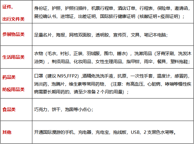 声明:展商名单中文版通过MEDICA官网发布的英文信息转译过来,若有遗漏,欢迎IVD同仁下方留言补充,感谢您的理解与支持。 01 出行事宜 1 德国自备物品清单(仅供参考) 2 德国常识 ●货币: 德国货币为欧元,现汇率约为1欧元=7.3元人民币。物价水平在欧洲欧元区内属于中等偏上,常用物品供应充足,价格相对稳定。 *德国多数商店周日和假日不营业。 ●时差与气候: 时差:冬令时7小时时差。 气候:11 月德国杜塞尔多夫的天气温度是5—12度;法兰克福天气温度约为2—8度,请各位客户准备好足够的衣物。 *建议携带衣物类型:由于酒店和展馆都有暖气,可以穿衬衫+背心或薄羊毛衫。室外时可穿着秋季厚外套,怕冷可携带冬季棉服或羽绒服。 *注意疫情期间飞机上不提供毛毯,请自备衣物。 ●电: 德国电力同为 220 伏50Hz,但插座使用三相插头,插头为两孔圆插,建议自备或在商场买转换插头。 ●酒店: 德国酒店房间一般没有拖鞋和牙膏、牙刷、水壶,需自备。请妥善保管随身携带的护照、文件和其他贵重物品。外出时,须将贵重物品存放在饭店总台的保险柜中,切勿留在房间内。酒店通常免费为客人提供存放贵重物品的服务。 02 重要事项 1 核酸检测 ●出发须知: 参考各机场官网的防疫要求,提前准备核酸证明、疫苗接种信息,并在“防疫健康码国际版”小程序中通过”出国人员入口”查看及出示国际旅行健康证明保存证明图片用以登机、入境查验。 ●回国须知: 须在登机前48小时内进行“双核酸PCR检测”,两次采样间隔24小时以上,检测方式要求为RT-PCR(鼻咽拭子采样)。 检测时间示例 获得检测报告后,中国公民通过“防疫健康码国际版”微信小程序申请,申报时须上传签证扫描页、 包含姓名的航班行程单、两次核酸阴性报告、疫苗接种证明(如有)、其他系统要求的文件:如邀请函,国内临时出差人员请提供公司出差证明(中文),酒店发票等。 *申请健康码只能在回国当天完成 *至少提前半天申请 有关回国核酸检测和绿码申请的更多详情:https://mp.weixin.qq.com/s/mDraHsY44W08m8BwCcv0Gg 2 使馆重要信息 驻杜塞尔多夫总领事馆 驻法兰克福总领事馆 ●中国驻杜塞尔多夫总领馆 1. 领区范围:Nordrhein-Westfalen 2. 总领馆办公地点:Schanzenstraße 131,40549 Düsseldorf 3. 网址: http://dusseldorf.china-consulate.gov.cn/chn/ 4. 联系电话: 经商事务:0049 - 211 - 9099 6385 护照、旅行证咨询专线:0049 - 211 - 9099 6394 领事保护电话:0049 - 211 - 55080446 5. 联系邮箱: 总领馆:chinaconsul_dus@mfa.gov.cn 领事业务:dus@csm.mfa.gov.cn ●中国驻法兰克福总领馆 1. 办公地点:Stresemannallee 19-23, 60596 Frankfurt am Main 2. 网址: http://frankfurt.china-consulate.gov.cn/chn/ 3. 联系电话:0049-69-69538633 4. 联系邮箱: 领事证件:frankfurt@csm.mfa.gov.cn 健康码业务:frankfurt_hr@csm.mfa.gov.cn |