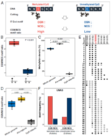 图1. 裂解比例取决于CpG甲基化状态,来源:PNAS cfDNA相对于CpG位点的0和1位置的差异裂解取决于甲基化状态,最终将导至末端基序的差异。甲基化的CpG位点趋于在0位点有更多的端点,富集50个CGN基序(N表示A、C、G或T的任意核苷酸),但在位置1处较少;相比之下,未甲基化的CpG位点减弱了这种裂解偏好。事实上,对于健康对照组的血浆DNA样本,高甲基化CpG位点的CGN与NCG端基序的比例(即CGN/NCG基序比)显著高于低甲基化位点。因此,来自基因组区域cfDNA分子的CGN/NCG基序比可以用来揭示该区域的甲基化水平。为了进一步研究基于CGN/NCG基序比的甲基化分析可以达到的分辨率,研究团队分析了来自一个涉及基因组印迹的等离子体DNA分子,该印迹根据亲本起源赋予不同的DNA甲基化,这些测序数据来自于之前研究中妊娠早期的样本。分析结果表明,单核苷酸多态性(SNP)位点上携带A或G等位基因的DNA片段从不同亲本继承;携带G等位基因的DNA片段未甲基化。有趣的是,与携带G等位基因(未甲基化)的cfDNA片段相比,携带A等位基因(甲基化)的cfDNA片段显示出更高的50-CGN端基序频率,但50-NCG端基序的频率较低。综上所述,以上结果表明,除了反映区域甲基化水平外,CGN/NCG基序比还可以反映等位基因特异性甲基化模式。