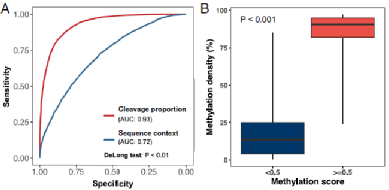 图3. 甲基化的裂解模式显示组织cfDNA分子的起源,来源:PNAS 利用裂解概况训练的深度学习模型预测单CpG分辨率下的甲基化状态 在确定使用cfDNA裂解模式及其CGN/NCG基序可以推断cfDNA在不同区域的甲基化状态之后,另一重要科学问题是如何利用CpG位点周围的cfDNA裂解模式准确地识别个体的单个CpG位点的甲基化状态。为此,研究团队探索了一种深度学习算法(FRAGMA),旨在通过分析CpG位点周围的cfDNA裂解模式来预测CpG甲基化指数高于70%或低于30%。为了获得足够的测序深度来分析裂解比例,研究团队收集了来自8名健康对照组和13名HBV携带者的亚硫酸氢盐测序数据。随后,将基于训练数据集的模型参数用于分析测试数据集,以输出一个概率得分(在该研究中称为甲基化得分),用来表明CpG位点被高甲基化的可能性。数据显示,用来区分CpG位点是高甲基化还是低甲基化的该深度学习模型AUC高达0.93。与甲基化评分≥0.5的CpG位点相比,甲基化评分< 0.5的CpG位点的甲基化指数显著降低。值得注意的是,如果只使用CpG位点周围的序列,不使用cfDNA裂解模式,该模型性能显著下降,AUC为0.72,进一步突出裂解模式对甲基化分析的准确性有显著贡献。以上结果证明了利用cfDNA片段模式推断单个甲基化CpG状态的可行性。