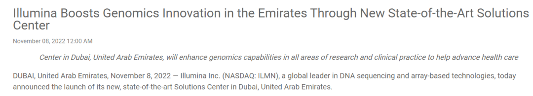 Illumina和华大又在中东杠上了。 2022年11月8日,Illumina发布了一个不大不小的新闻(注1):在阿拉伯联合酋长国新开一个解决方案中心(Illumina Solution Center,ISC)。这个ISC主要将面向人类健康领域的基因组应用,大概9100平方英尺(约850平方米),将配备最新测测序和芯片设备(没说是不是NovaSeq X)。迪拜,咱们都是知道的,那就是一个豪车停着吃灰、土豪多如羊毛的国家。老牌old money如英国搞个100K project就能嗨好久了,他倒好,2018年就宣布了要对全民约300万人进行全基因组测序。没过1年,华大就借着MEDLAB展会的机会高调宣布进军中东市场(注2),谁会跟300万人的基因组过不去呢?彼时,华大智造的MGISEQ-T7(不用怀疑,当时还不叫DNBSEQ-T7)也就刚发布不久(注3),正好用上不是?(图片来源: http://www.brlsea.org/article/16)而华大在中东的布局还远远不止这一个项目,且不说新冠疫情期间华大基团的火眼实验室在迪拜投入了使用。借助华大基团的渠道(注5),在2021年还在际盐碱农业研究中心(International Center for Biosaline Agriculture,ICBA)的迪拜总部投入了MGI的测序仪-(DNBSEQ-G400)。咱也不知道这Illumina CEO说自己是Dubai-based(注6),也没看出来多有base啊。甚至在2022年Q3财报中EMEA还出现了同比下滑。也许受欧洲拖累吧,没有看到拆分到中东地区的增长情况。总而言之,中东作为亚非欧大陆的“连接器”,那地位可是非常重要的。Illumina在迪拜的ISC开张,似乎是对中东市场重视了起来。 |