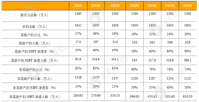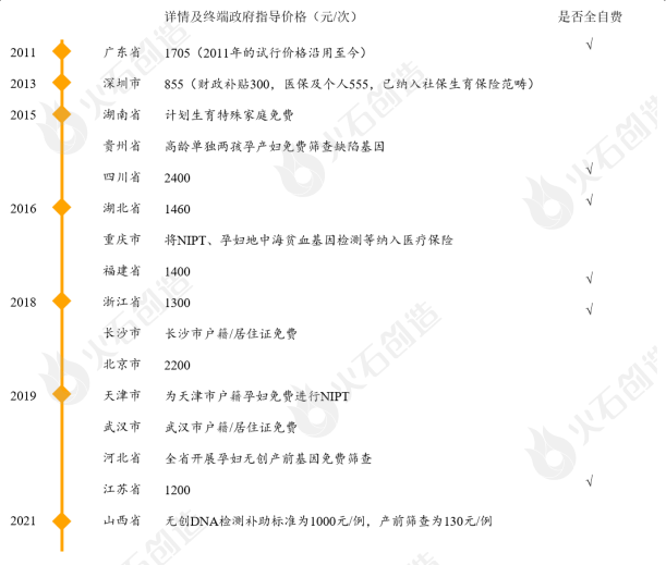前言 随着三胎政策的推出,高龄产妇比例的增加,未来新生儿的数量将持续攀升,这对出生缺陷防控提出了新的挑战。目前基因检测技术已应用于孕前、产前和出生后各阶段,形成了以无创产前检测(No-Invasive-Prenatal-Testing,NIPT)为代表的相关产品和服务。随着检测技术的成熟,成本降低,监管环境的严格以及龙头企业的先发优势,NIPT行业红海格局已定。本文认为,提高市场渗透率,加快技术突破是未来扩大NIPT市场规模的主要途径。 无创产前检测(No-Invasive-Prenatal-Testing,NIPT)是一种利用高通量测序技术对母体血液中游离的胎儿DNA片段(cffDNA)进行测序,并解读胎儿遗传信息以进行相关疾病筛查的产前检测手段。通常用于鉴定胎儿是否存在21(唐氏综合征)、18(爱德华氏综合征)和13(帕陶氏综合征)三体异常。相较于传统检测技术如穿刺、超声、血清学唐氏筛查等,NIPT具有无创、检出率高、流产风险低等诸多优势,不仅扩大了检测时间窗口,安全性、特异性、敏感性也得到了大幅度提升。 来源:火石创造根据公开资料 1 无创产前检测发展现状 作为中国高通量测序(Next-generation sequencing technology,NGS)临床应用的第一站,NIPT的诞生和发展离不开NGS技术的不断成熟。NGS技术又称二代测序技术,可实现边合成边测序,适合大规模DNA样本。 自2005年以来NGS技术发展迅速,凭借高通量、低成本、测序时间短等优势成为了市场商用主流测序手段。目前NGS技术已应用于多个领域包括传染病诊断、孕产前检查及遗传病检测、肿瘤早筛和伴随诊断等。随着技术的持续更新和迭代,测序成本不断下降,远超摩尔定律速度。预计2022年成本将降低至300美金/每人,2024年有望实现100美金/每人全基因组目标。加上NIPT产品具有特殊性,涉及伦理、隐私和人类遗传资源保护、价格、质量等问题,整体监管环境跨越了自由发展、监管严格、试点准入、分业监管等阶段。 2014年2月,国家食品药品监管总局(CFDA)和国家卫生计生委联合发布《关于加强临床使用基因测序相关产品和技术管理的通知》叫停基因测序相关产品的临床应用,行业暂时进入了停滞期。而同年7月CFDA批准了BGISEQ-1000基因测序仪、BGISEQ-100基因测序仪和胎儿染色体非整倍体(T21、T18、T13)检测试剂盒(联合探针锚定连接测序法)、胎儿染色体非整倍体(T21、T18、T13)检测试剂盒(半导体测序法)的医疗器械注册,NIPT正式成为二代基因测序产品的新领地。 随着CFDA批准华大基因、贝瑞基因、达安基因、博奥生物等多家公司的NIPT产品,积极开展临床试点,行业监管逐步规范化。目前部分省份已经发文明确NIPT检测价格并积极将其纳入医保报销范畴,价格约在800-2400元之间,NIPT已进入大众价时代。 来源:美国国家卫生院 来源:国家卫生计生委、国家食品药品监管总局 来源:火石创造根据公开资料整理 NIPT产业链上游涉及测序设备和相关配套试剂,壁垒极高。尤其是测序设备,国内目前只有华大智造一家具备独立自主研发并实现量产的能力,其他企业主要通过贴牌或与国际巨头如Illumina合作开发。另外药监局要求NIPT产品上市后仍需提交至少10家临床机构、总数不少于10万例临床使用数据作为临床补充资料在产品下一次延续注册时提交。 截至2019年底,华大基因和贝瑞基因NIPT累计检测样本量分别达到600万例和350+万例,领先于其他厂商。同时贝瑞基因也成为了国内首例通过NMPA延续注册申请的厂家。设备的垄断加上临床数据的限制使得我国NIPT市场呈现寡头竞争。目前提供NIPT检测服务的企业主要有华大基因、贝瑞基因、博奥生物、安诺优达、达安基因等9家。其中华大基因和贝瑞基因凭借先发优势、丰富的临床数据积累以及自身技术和平台优势占据了绝大部分市场份额,市占率合计约为68%。这对有意布局该领域的企业而言进入难度较大,行业两强竞争格局已形成。 来源:火石创造根据公开资料整理 2 无创产前检测发展趋势 随着测序成本的降低,国内监管环境趋严,竞争格局逐渐稳定,我国NIPT市场已走向成熟。加之我国每年新生儿数量的持续下跌,市场增量空间较小。预计未来NIPT市场规模增长不明显,但渗透率仍有较大提升空间。根据智研智库和观研天下调查结果显示,2015年我国NIPT渗透率只有4.75%,2021年则上升至约50%,据国元证券测算2025年高龄产妇NIPT渗透率有望达到90%,非高龄产妇NIPT渗透率达至50%。因此市场未来的发力点在于存量的渗透率提升和增量的技术突破。 来源:火石创造根据公开资料整理 在渗透率方面,增加检测需求,扩大应用领域是主要驱动因素。我国已逐步放开二胎政策,鼓励三胎政策,这直接引起高龄产妇占比上升,预计2025年我国高龄产妇占比将达到26%,高龄产妇NIPT市场规模将扩大至38.61亿元。另外随着大众健康意识和风险意识的增强,非高龄孕妇NIPT渗透率进一步增加,预计2025年我国非高龄产妇市场规模将达到61.05亿元。因此未来NIPT应用领域呈现由高风险人群向普筛发展的趋势,非高龄产妇群体将成为NIPT市场增长的主要着力点。同时自2013年深圳率先将NIPT检测纳入医保后,2021年9月NIPT检测也正式纳入北京医保,医保支付政策的进一步鼓励和支持使得NIPT的医保覆盖将深入更多地区,未来三四五线城市将成为各家竞争的焦点。 在技术突破上,部分企业积极布局上游测序设备的开发,有望打破上游市场的垄断局面。博奥生物、安诺优达和达安基因生产的测