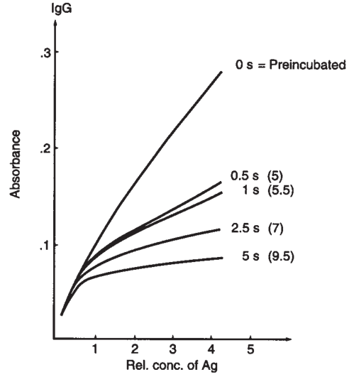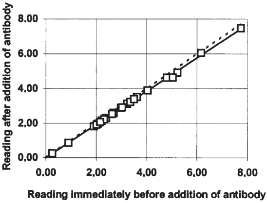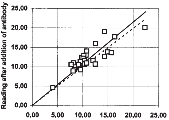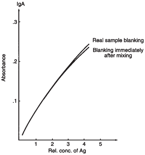 蛋白质标准化 免疫散射比浊和/或免疫透射比浊检测方法的最佳化 冯仁丰 读数原理 现代自动仪器按照关于试剂的混匀和信号的阅读的三个不同原理之一操作。其中两个原理展现在以下离心分析仪上,于340nm得到免疫透射比浊的结果。 a)真实样品空白 理想方式得到最适信号展现在图6和图7. 首先,加入反应缓冲液到反应比色杯。然后,加入样品,与缓冲液混合,在预温阶段最后,读取第一个读数。这是真实的样品空白(图6和图7中标记为“1st reading”),被储存在仪器记忆中。 图6、作为时间函数形成的信号。使用人IgG作为“真实样品空白”示例。 图7、作为时间函数形成的信号。使用人IgG作为“真实样品空白”示例。 下一步,加入专一的抗体,与被预温样品混合。因抗原与抗体间的反应,在很短的时间里形成了浊度。 在信号变得接近恒定,说明反应已经接近终点 — 通常在4-6分钟后 — 读取第二个读数(在图6和图7中标记为“2nd reading”),储存在仪器的记忆中。这个读数是代表样品空白、试剂空白、和抗原-抗体反应的信号之和。 在相同时间间隔,试剂空白在单独的比色杯中以相同的时间间隔平行检测。终点信号代表了,在反应缓冲液和空白样品(如水或盐水)和抗体本身混合引起的浊度。这个值,仅在一个比色杯中获取,被用于纠正来自样品比色杯所有信号。理想地,试剂空白值应非常低。 用于计算的信号可参见表1。 样品比色杯和试剂比色杯的值之差,从第二个读数中减去各个第一个读数(最后一栏)。 在减去试剂空白读数后得到了最后信号。在抗体过剩区带得到了提供的样品读数,最后结果随样品中抗原浓度升高而升高。 在抗体加入前即刻阅读的读数的原理,经常被提及为:真实样品空白或使用样品预温的两个试剂原理。 这个原理展现在图6和图7的两个不同血清蛋白质,IgA和IgG。 b)混合所有试剂后即刻的空白读数 一些自动仪器按照另一个原理操作,混合试剂和阅读信号,如图8和图9所示。 图8、作为时间函数形成的信号。“混合所有试剂后即刻的空白读数”,使用人血清IgA为示例。Ag:抗原,Ab:抗体。 图9、作为时间函数形成的信号。“混合所有试剂后即刻的空白读数”,使用人血清IgG为示例。Ag:抗原,Ab:抗体。 开始,反应缓冲液、样品、和抗体混合。然后,尽快,通常混合后的5-10秒,取第一个读数,并储存在仪器的记忆中,作为空白值。 4-6分钟后,反应已经达到它的终点,取第二个读数,并储存在仪器记忆中。该信号用于如表2所示的计算中。 最后得到的结果简单地从第二个读数中减去第一个读数。 这个原理的优点是,当然,它节约了时间,因为没有了预温,它有些简单。由于没有要求检测试剂空白,经常被作为简单的试剂系统。 但是,这个原理有很严重的缺点。 首先,5-10秒对所有样品稳定和达到一个恒定的信号不总是足够的。这会要求到2分钟。所以,第一个读数会不包括总的样品空白,但仅仅是一部分。 第二,免疫反应已经开始,早期的反应信号被丢失。作为一个“缓慢”的反应系统,如IgA,在与抗体混合后的第一个读数在5秒钟,不是非常严格的(图8)。 但是,作为“快速”反应系统,如IgG,已经反应了一半才取第一个读数(图9)。事实上,许多蛋白质与相应抗体的反应非常快,延误5秒钟变得很关键。在抗原和抗体间的反应是这个时间运行处于最大的速度,所以,很难确定得到第一个读数的点。 “混匀所有试剂后的即刻空白”的实际含义,可容易地通过比较由IgA和IgG的6个标准的信号形成曲线上予以展现(分别为图10和图11)。 图10、以人IgA为例,6个标准以时间为函数的信号发展。Std,标准;R,试剂。 图11、以人IgG为例,6个标准以时间为函数的信号发展。Std,标准;R,试剂。 对于缓慢反应的IgA系统,5-秒钟的延缓不显著。 对于快速反应的IgG系统,在第一个5秒钟期间,有相当多的信号发展。这使得(第一个读数的)秒时间和第一个吸光度读数间有显著差异,看来丢失的信号随标准中IgG浓度增加而增加。 IgA的标准曲线实际上没有被两个空白方式间的差异所影响(图12),但在IgG的标准曲线绘制中有着很大的影响(图13)。这里丢失的信号对较高标准越来越明显,造成要低得多的“较低”的标准曲线。 在图14中,为离心分析仪上第一次读数的时间对标准曲线数据的影响。在离心分析仪达到了它最后速度后的0.5秒时,取第一个读数。由于这个仪器要求4.5秒钟达到完全的速度,图中括号内是抗原和抗体混合后过去的实际时间。 图15为两个不同的空白原理得到的、在IgG标准曲线上的插入。“较低”和“平坦”的曲线,是“混合所有试剂后即刻的空白”得到的,造成分析不精密度有明显增加,因为读数是在反应曲线的陡峭部分进行的,此处在动态和读数时间下的很小变异,会影响检测的不精密度。由于反应是在最大速度下运行的,特别重要的是,所有样品和标准必须确实是在相同时间下读数! 图12、以“真实样品空白”和“所有试剂混合后的即刻空白”得到的IgA标准曲线。 图13、以“真实样品空白”和“所有试剂混合后的即刻空白”得到的IgG标准曲线。 图14、IgG标准曲线。第一次读数时间标准曲线上的插入。 图15、IgG标准曲线。以“真实样品空白”和“混合所有试剂后即刻空白”得到的两个标准曲线上插入的影响。 而且,很重要的要强调,如果病人样品中实际蛋白质的反应速度,与校准品中该蛋白质的不一