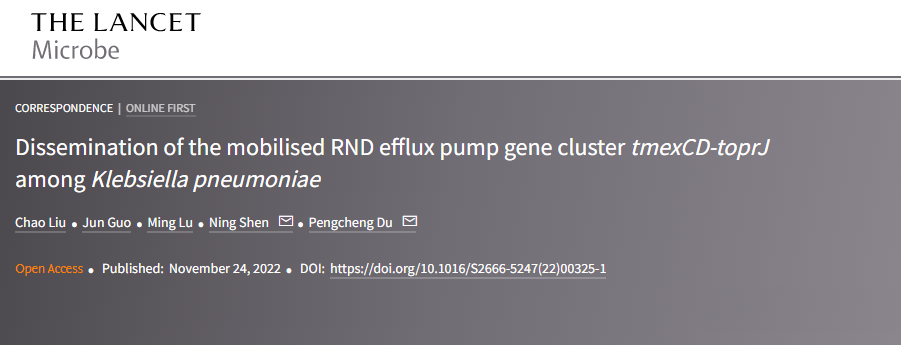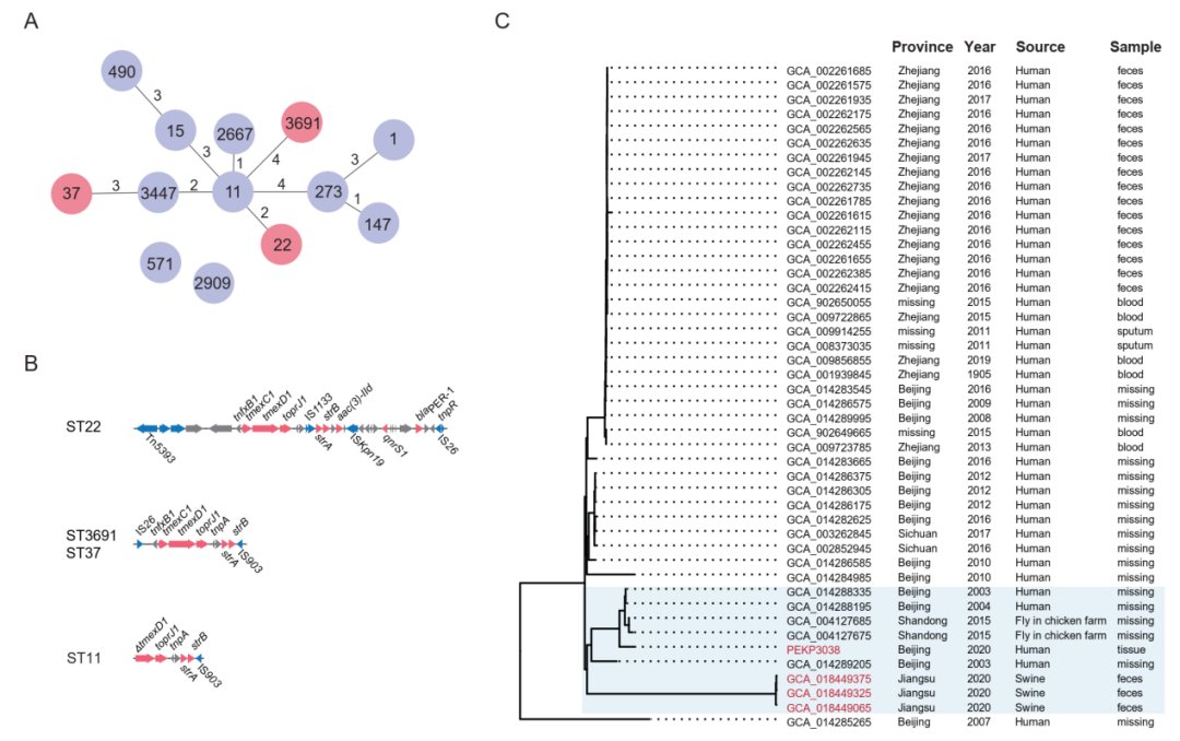 近日,北京大学第三医院沈宁教授团队、清华大学附属北京清华长庚医院郭军教授团队联合齐碳科技共同合作,在全球顶尖微生物学期刊The Lancet Microbe(《柳叶刀-微生物》)(IF=86)在线发表题为“Dissemination of the mobilised RND efflux pump gene cluster tmexCD-toprJ among Klebsiella pneumoniae”的研究成果。该论文基于齐碳纳米孔基因测序平台对临床新出现的携带tmexCD-toprJ的肺炎克雷伯菌进行了广泛研究,是对其流行病学研究的有效补充。 细菌耐药性问题已成为一个世界性的难题。质粒等可移动元件介导的耐药基因水平传播所致革兰阴性菌耐药性的快速出现和散播,引起全球高度关注。外排泵(efflux pumps)是细菌将胞内的药物或毒性物质排出胞外的蛋白转运系统,也是临床上细菌对抗菌药物耐药的主要机制之一。近年来,携带可移动的多重耐药外排泵基因簇(tmexCD-toprJ)的肺炎克雷伯菌在我国临床患者、动物和零售肉类样本中不断发现,其介导了对包括替加环素这一人类面临多重耐药肠杆菌科细菌感染的“最后一道防线”在内的多重耐药性。2022年10月,浙江大学医学院附属第二医院张嵘教授等[1]通过在我国的临床监测研究和对公共数据的深度挖掘,首次发现编码可移动RND型多耐药外排泵的tmexCD-toprJ基因簇已经在多种临床重要致病菌中播散,包括假单胞菌属、克雷伯菌属、气单胞菌属和变形杆菌属等。并在研究中发现发现多种肺炎克雷伯菌序列型(ST)携带tmexCD-toprJ基因簇,包括ST1、ST11、ST147、ST15、ST2667、ST273、ST2909、ST3447、ST490和ST571。 此次北医三院、清华长庚医院团队基于齐碳纳米孔基因测序平台的研究,历经2017年1月至2022年4月的长期监测,从1484株临床分离的肺炎克雷伯菌中首次发现了上述10种ST型外的3种携带tmexCD1-toprJ1的全新ST型菌株,总体阳性率为0.88%(13/1484),包括1个同时携带编码碳青霉烯酶的blaKPC-2和blaNDM-1基因的泛耐药ST22克隆(11株菌株)、1株多耐药ST3691菌株和1株多耐药ST37菌株。这些菌株菌均呈现替加环素耐药,最低抑菌浓度为4-24mg/L。同时,研究团队还发现1株替加环素敏感的ST11型菌株携带了5‘端发生缺失的tmexD1基因和toprJ基因,而tmexC1基因完全缺失。这表明只有完整的tmexCD1-toprJ1基因簇才能介导替加环素耐药,与张嵘教授等[1]在其研究中发现通过敲低tmexD基因表达可降低菌株替加环素耐药性的结果一致。此外,这株ST11型菌株与其他研究已发表的两株分离自中国养鸡场苍蝇样本的菌株、三株猪源菌株和其他三株人源菌株聚集在一个分支中;这株菌中,编码5‘端缺失tmexD1基因和完整toprJ基因的质粒与1株分离自零售猪肉的ST147型菌株中的编码完整tmexCD1-toprJ1基因簇的质粒高度相似。克隆群258(CC258)主要由ST258和ST11型构成,其中ST11型在我国临床、社区和畜牧业中均为主要流行的肺炎克雷伯菌亚型,而携带tmexCD1-toprJ1的ST11型菌株在屠宰场中也有发现。这些结果表明,临床中发现的携带tmexCD1-toprJ1肺炎克雷伯菌可能与养殖动物及相关环境中的耐药菌株具有密切关联。 附图:该研究中发现的携带tmexCD1-toprJ1基因簇的ST型。(A)已发现的携带tmexCD1-toprJ1基因簇的肺炎克雷伯菌ST型的最小生成树,其中红色圆圈代表该研究中发现的ST型,蓝色圆圈代表在此前研究中已发现的其他ST型。(B)该研究中发现的3种ST型中tmexCD1-toprJ1基因簇、1株ST11菌株中5‘端发生缺失的tmexD1基因和完整toprJ基因所在的基因环境。其中红色箭头代表耐药基因,蓝色箭头代表整合酶、重组酶和转座酶基因,灰色箭头代表其他功能基因。(C)携带5‘端缺失tmexD1基因的ST11菌株与已发表基因组序列的ST11菌株的系统发生树。该研究从GenBank数据库中收集了1675株ST11型菌株的基因组序列共同进行分析,本图中展示了和该研究获得的ST11菌株PEKP3038聚集在同一分支的45个基因组。蓝色框中包含了PEKP3038和另外三株携带tmexCD1-toprJ1基因簇的猪源菌株(红色字体)。