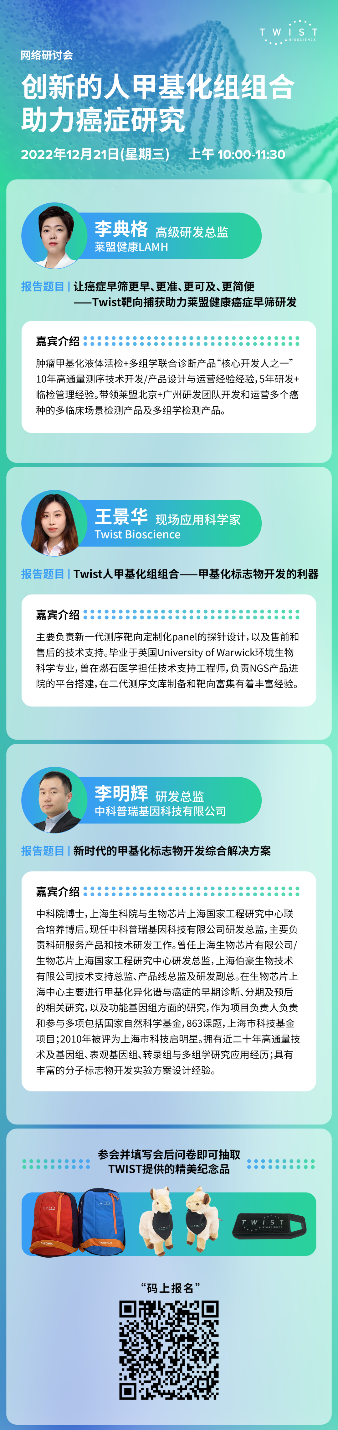 会议背景 DNA甲基化作为表型修饰的一种,与疾病的发生密切相关。随着越来越多的甲基化标志物被发现以及对癌症甲基化图谱的研究,更多癌症患者可以在早期被发现和治疗。而靶向甲基化测序技术的进展则有利于更高效地发掘潜在的甲基化标志物。Twist人甲基化组组合具有高度靶向性,经过精心设计和实验室优化,可带来准确、灵敏且高性能的杂交捕获效率,使得该组合成为研究人员在各种应用中探索甲基化水平的理想选择。 “创新的人甲基化组组合助力癌症研究”网络研讨会将于2022年12月21日(周三)10:00-11:30举办。本次会议特邀请莱盟健康高级研发总监李典格、中科普瑞研发总监李明辉以及Twist Bioscience现场应用科学家王景华进行主题分享和交流,欢迎参与! 扫描下方海报中的二维码 或打开文末阅读原文,即可预约参会。 |