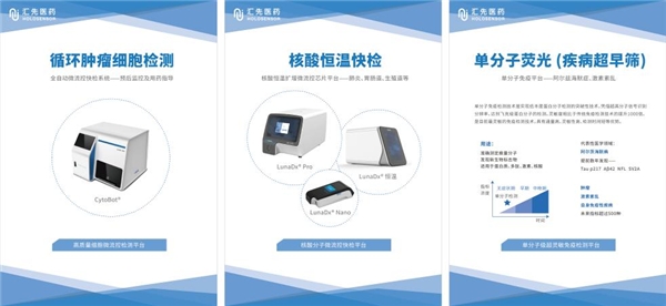 图|LunaDx® Nano 分析仪在国际医疗器械展览会参展(来源:受访者) 据了解,LunaDx® Nano 便携式全自动恒温核酸扩增分析仪已经取得欧盟 CE 认证并在欧洲上市销售。“我们目前已经切入欧洲市场,主要是针对一些常见传染性疾病的检验。”颜菁介绍说。值得一提的是,这台仪器也于前不久在德国的杜塞尔多夫的MEDICA 国际医疗器械展览会参展。 同时布局分子、细胞和蛋白管线,三款产品覆盖智慧检验全场景 现阶段,汇先医药基于微流控布局了分子管线、细胞管线和蛋白管线。 “对于分子管线,除了大家都比较熟悉的新冠核酸检测之外,围绕小儿脑膜炎、腹泻,以及肺结核、呼吸道感染、宫颈癌筛查等,我们也在不断进行推广。与此同时,我们也正在与大型医院联合开发能够在现场实时出检验结果的产品,比如针对血流感染、急性肺炎等。”颜菁介绍说。 据了解,汇先医药围绕分子管线已经开发出三款产品。包括上述提到的LunaDx® Nano 便携式全自动恒温核酸扩增分析仪,体积小巧,操作便捷,可现场打印检测结果,满足多种场景的快速核酸检测需求等特点;以及 LunaDx® 全自动恒温核酸扩增分析仪,集成全流程检验过程,可实现新冠病毒、乙型流感病毒、呼吸道合胞病毒和肺支气管炎病毒三项等检测;还有LunaDx® Pro 全自动核酸检测分析仪能够进行核酸提取、纯化,以及 PCR 扩增、检验等全套流程,样品无需前处理操作可直接上机,能够同时对单个样品多达 36-72 种病原体进行定性检测和鉴定,适用于复杂感染患者的鉴别诊断。 “这三款产品其实是一个产品系列。”颜菁指出,“LunaDx® Nano、LunaDx® 和 LunaDx® Pro 三条产品线能够全面覆盖智慧检验多元化的应用场景,我们希望未来量产并投入市场后能够进一步提高检测灵敏度,实现检验过程的集成化和自动化。”