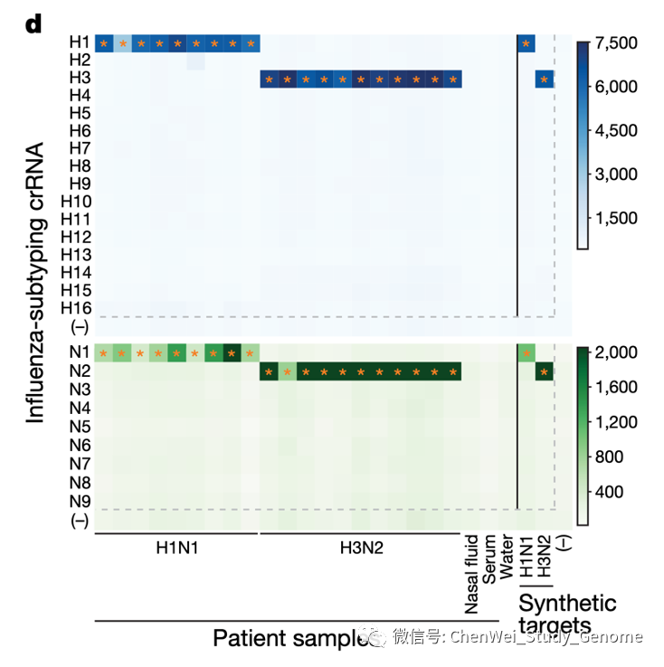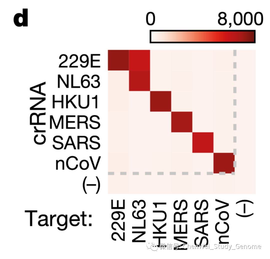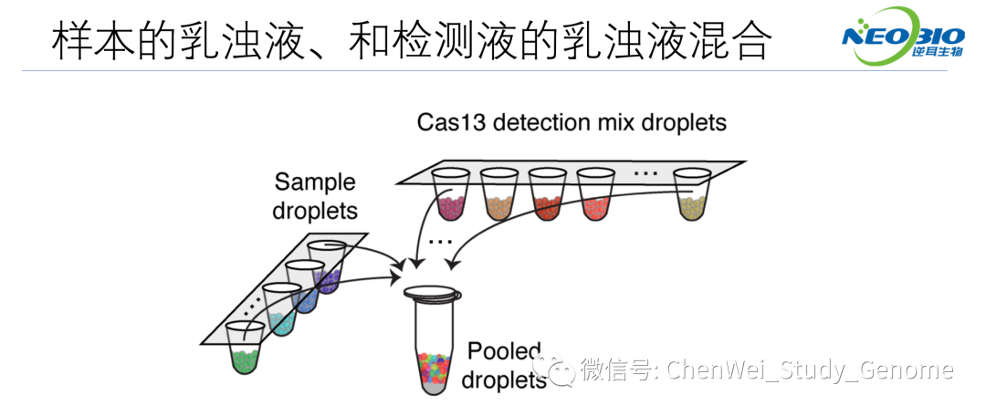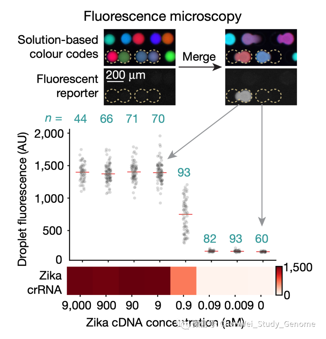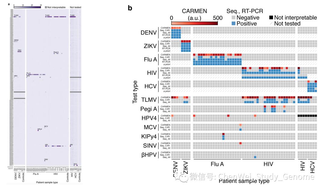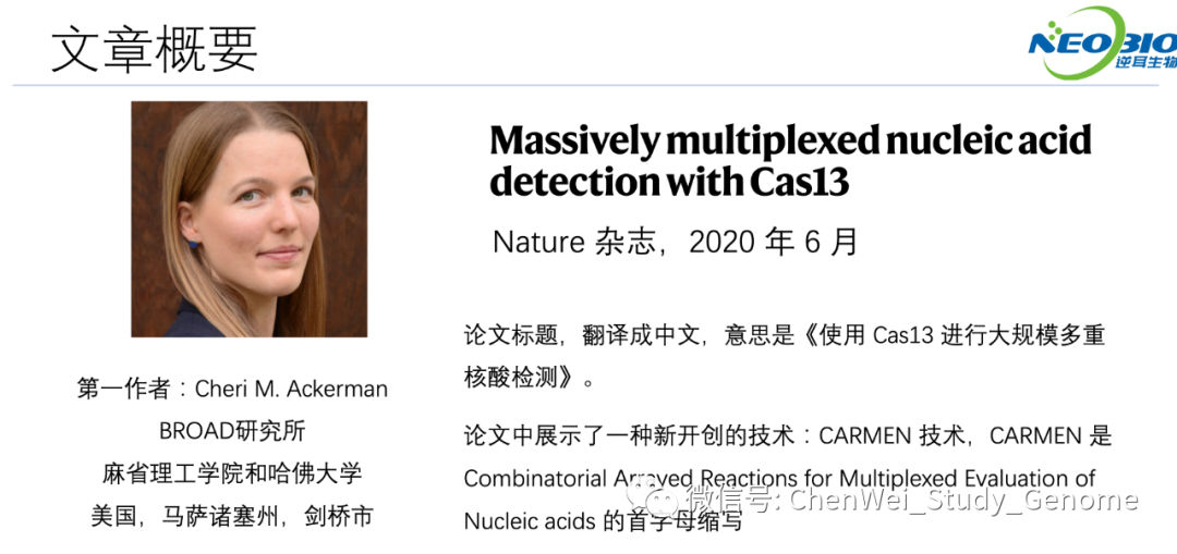 视频内容简介 1、CARMEN 是一种创新的快速、高通量、多病原体广谱检测的方法; 2、CARMEN 方法有较高的特异性和灵敏度; 3、CARMEN方法通过微流控乳浊液化、和彩色码两项技术,结合显微荧光扫描,极大地降低了广谱病原体检测的成本。作者自己的说法是把成本降低了 300 倍。 视频字幕内容 大家好!欢迎来到【陈巍学基因】。今天我给大家讲《高通量广谱检测病原体新技术:CARMEN》 今天,我们要讲的内容,分4个部分:1、文章概要;2、实验原理;3、实验结果;4、分析小结 我们先说第一部分,文章概要 文章的题目,是《Massively multiplexed nucleic acid detection with Cas13》。这篇论文发表在 Nature 杂志的 2020 年的 6 月刊上。 论文题目,翻译成中文,意思是《使用 Cas13 进行大规模多重核酸检测》。 论文中展示了一种新开创的技术:CARMEN 技术。CARMEN 是“Combinatorial Arrayed Reactions for Multiplexed Evaluation of Nucleic acids”的首字母缩写。 第二部分,我们来说实验原理 我们先要说一下 Cas13 这个酶和 SHERLOCK 检测。 先说 Cas13 这个酶。Cas13 酶和 CRISPR 反应中的 Cas9 酶是类似的,可以在 guide RNA 的引导下,识别目标核酸链,并切割目标核酸链。 但 Cas13 这个酶与 Cas9 酶不同的点在于,它切割的目标是 RNA 链,而不是象 Cas9 酶那样是切割目标 DNA 链。 并且,Cas13 还有一个特点,当 Cas13 酶结合到 guide RNA 和目标 RNA 结合的 它不仅可以切割目标 RNA 链,它还会切割附近的 RNA 链。 那么利用这种特性,就可以设计一类似 Taqman 的 RNA 探针。这个 RNA 探针一端连着一个荧光基团,另一端连着一个淬灭基团。 当这个 RNA 链是完整的时候,淬灭基团会熄灭荧光基团,那么这个 RNA 探针就不会发出荧光。 而当 RNA 被切断后,淬灭基团和荧光基团分开,荧光基团就会发出荧光。 那么当这个体系中的 guide RNA 有发生与目标 RNA 结合的时候,Cas13 就会切断这个荧光探针,被切断的探针就会发出荧光。 在了解了 Cas13 酶切割探针,发出荧光的原理之后,我们再来看 SHERLOCK 检测。 SHERLOCK 是“specific high-sensitivity enzymatic reporter unlocking”的首字母缩写。翻成中文,意思是:“特异性高灵敏度酶报告基因解锁”。 大侦探“福尔摩斯”的全名是: Sherlock Holmes。可见这里给这个检测方法起“SHERLOCK”这个缩写名,有借用福尔摩斯的侦探能力的意思。 SHERLOCK 的实验原理,先是把抽提得到核酸做扩增。对其中的 DNA 做 RPA 扩增,RPA 扩增是一个类似 PCR 扩增的反应,但它不需要做热循环,只要温度保持在 37-42°C 之间,就可以进行反应。 对 RNA,则是做 RT-RPA,也就是“逆转录 RPA”,结果会是得到扩增了的 cDNA。接下来,扩增出来的 DNA 和 cDNA,都经过 T7 转录酶的转录,转录出许多的 RNA 链。然后,加入 Cas13 酶、guide RNA 和荧光探针,进行反应。如果被检测的样本中存在与 guide RNA 相对应的目标 RNA,则荧光探针会被 Cas13 酶所切割,并发出荧光。 检测样本是否发出荧光,就可以判断样本中是否存在目标核酸链。进而可以推断样本中是否有特定的病原体。 在了解了 SHERLOCK 检测的方法原理之后,接下来我们来说 CARMEN 的实验设计。这是 CARMEN 实验设计的原理图。 实验中用到“Color code”。“color code”的意思是,几种颜色荧光,比例不同,组成一组排列组合。我把它翻译成“彩色码”。 以“红、绿、蓝”三种荧光组成的彩色码为例,每一种荧光颜色都随着加入的相应的荧光染料的增多,而荧光强度增强。比如,红色可以取 0,1,2,4,……,一直到 64,一共 8 种荧光强度。 同样,绿色和蓝色也可以同样取 8 种荧光强度,那么把三种颜色的荧光组合起来,有 8 的 3 次方种组合,也就是可以得到 512(8*8*8 = 512)种颜色组合。 用这些颜色组合对特定的溶液做标记,就叫“彩色码”。 作者,先把几种样本,分别完成前面的核酸抽提、扩增、和转录的工作。接着,每个样本分别用荧光染料标上彩色码。 注意一下,这里用的荧光染料的颜色是偏蓝绿色的。 然后,把这些用彩色码标记了的 RNA 溶液,分别通过微流控系统,制成油包水的乳浊液。 同样原理,把分别针对若干种病毒 RNA 的探针,做成检测混合液。然后把每种混合液也加入彩色码做好标记。但请注意,标记检测液的彩色码的颜色是偏红橙色的,是和之前标记样本的蓝绿色的色系是分开的。然后,把每种检测混合液分别做成乳浊液。 接下来,把这若干个样本的乳浊液、和若干种检测液的乳浊液混合在一起。 然后,把这个混合液加载到特制的微孔板上。 这个特制的微孔板,需要特别介绍一下。这个板,是用聚二甲硅氧烷(PDMS, polydimethylsiloxane) 制成的。这是一种软的、且透明的胶质的材料。 它的大小约是手机的大小。 板的上面,布满了小孔。我们把这些小孔放大来看,每一个小孔的样子象一个空心的“8”字。一个小孔正好能放下乳浊液中的两个微滴。 一块板子,有 4.24 万个这样的小孔。 在使用的时候,在微孔板上还会加盖一个盖板。盖板和这个微孔板之间可以用螺丝锁紧。盖板的作用是把微滴锁定在小孔中,让不同小孔之间的微滴在锁定之后不会交叉污染。 在把乳浊液加入到这个微孔板之后,乳浊液中的微滴进入微孔。一个微孔中,正好容纳两个微滴。 这时候,先对微孔板进行一次荧光显微扫描成像。 然后,进行电击。电击会使一个小孔中的两个微滴融合。 如果样本微滴中的 RNA,正好能被检测微滴中的 guide RNA 识别,就会激活检测微滴中的 Cas13 的酶