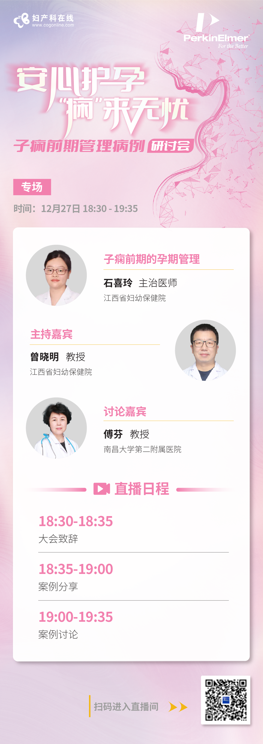 随着国家相继出台了一系列的鼓励生育措施,包括全面开放三胎、多胎家庭给予补贴等等政策。孕妇群体年龄结构及基础疾病结构变化显著,高龄、肥胖、高血压、糖尿病以及妊娠合并症及并发症发生人群呈“井喷式”增长。作为产科常见并发症,妊娠期高血压疾病是导至孕产妇和围产儿死亡的重要原因之一,尤其是子痫前期更是严重威胁母婴健康与安全。在国家及地方政策支持生育的大背景下,预防疾病和保障母婴健康,降低子痫前期发生率势在必行! 本次研讨会珀金埃尔默很荣幸地邀请到了来自江西省妇幼保健院的石喜玲医师分享病例--子痫前期的孕期管理,同时我们邀请到江西省妇幼保健院曾晓明教授和南昌大学第二附属医院傅芬教授就该案例进一步进行讨论,诚邀您共同探讨这个话题。 2022年12月27日 晚19:00直播 与您不见不散! |