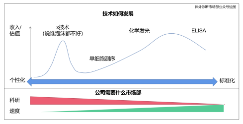 四个能力: 终身学习,积累能量; 聚焦,有深度再求广度,先易后难; 认清天花板,量力而行,选好平台; 长期主义,市场部需要投入时间。 在职场跃迁(大部分情况下指升职)是打工人增加收入最直接的手段,要做到成功跃迁,机会来了猪都能上天,也可能一辈子没有跨过主管的门槛。打工者是与公司平台相互成就,但是打工者处于相对弱势,是不争的事实。就像花盆和土共同培育种子,有花盆在,土少点也能长花,土离开花盆久了,就变成沙子,没营养。也像上一辈父母,退休了,如果在家带娃,平时聊的就是过去和抖音,如果兼职干活还能发光发热,就心态阳光,话题更多。如何塑造自己的能力与公司高端职位更切合,是打工人跃迁的底层逻辑。IVD行业根据服务的标准化程度不同,也是技术发展的阶段不同,市场部工作有着巨大差异。 市场部工作重心与产品发展阶段的关系 有些产品和服务基于一种孵育期的技术,更多的服务于有技术共鸣的客户。类似于手机第一批用户,技术尝鲜者。这时客户有很多想法,不限于按照sop使用产品,希望依托新技术得到自己的创新成果。好像时空转录组,单细胞测序等产品主要卖给高校老师。能与客户共同解决创新问题,甚至与客户有同样敏锐的嗅觉,在申报课题、论文撰写、实验设计、结果解释、创新方向上帮到客户。我虽然不在这种公司,但遇到过很多学术型市场部人才与上述公司非常契合。我所在公司的产品是依托成熟技术平台,服务于重复使用产品的客户。类似于手机的最高频使用人群-销售,每天打多个电话,还要刷视频打游戏,出差难免摔了、碰了。这类客户希望产品和服务标准化,简单、便捷、稳定、节省成本、提高效率。区域市场,面对多家客户的问题能够迅速分清优先级,并一一化解。上游市场,得到新机会输入后,迅速按照工具或经验完成调研立项。下游市场,多产品线上市在即,迅速收集发现竞争优势进行宣传,没有优势则快速组织资源创造优势,如KOL优势,区域占有率优势。学术市场,能迅速筛选适合的KOL契合手中产品进行科研,形成证据,教育市场。品牌市场,能够追热点或快速组织资源宣传产品和品牌。可以发现,这时市场部一切工作围绕如何快人一步,如何效率更高。做到高效需要,公司流程精简完善,个人能快速复制成功经验。一旦落后则面临恶性循环,缺钱,流失客户,规模效应丧失,成本增加,人员流失等问题。标准化做得好多数是大厂,大厂市场部总是在奔跑中进步。