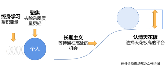 打工者跃迁到更好职位,就好像图中小球弹去更高位置。个人跃迁代表能力上一个台阶,做了原来做不到的事,但是没有人天生就会做所有事,跃迁就需要提前学习,做好准备。持续跃迁就需要终身学习。有了终身学习的空杯心态,下一个问题就是学什么,聚焦在什么目标上?如果目标能用钱衡量就很简单,举个例子,想赚年薪几十万,努力工作有可能达到;想赚一百万可能自己要业内顶尖(IVD);想赚几百万打工就很难了要入伙创业;想赚一个小目标不仅选择都要对,关键还看命。有了目标会发现自身很多差距,这时聚焦能力发挥作用。深度还是广度?一定要先深度再广度,有了专业领域的立身之本,才能向上发展。广度在做高管一层不可缺失,不仅要会管理,还最好会研发、生产、质量、供应链、销售。做什么不做什么?刚跃迁别又滑坡回去,做什么不做什么很重要。多数情况是企业雇我们来处理前任搞不定的烂摊子。上任一定先做减法,先做简单出成绩的事,难啃的骨头留在后面。自身天花板:人自古以来都有能力上限,随着不断衰老再想学习新知识和改变自身路径依赖越来越难。越早设好目标,越早开始努力,自身天花板越高。企业上升通道:企业是打工者发展的平台,认准好平台对上升非常重要。可以在大厂储备资源,在小厂释放能量。但关键还看自己这一单元是否有机会,快速发展代表要扩张,机会更多,如果部门一堆头头,那跃迁基本就没戏了。前面三项可能适用于各种岗位的人才,最后一点长期主义IVD市场部从业者一定要具备。市场部的工作没有一天就出成绩的。难做的事,多数都有巨大价值。可以分享一个情景,不知道是否有共鸣,遇到一个互相推诿的重大公司问题,甩来甩去。最后总有个点拉上市场部。选对了路就要等机会,打工按全程40年(20岁-60岁),假设干满全程退休,在一个行业,前10年学习积累,后10年稳定输出、培养接班人,中间20年每三年一次机会,最多也就6-7次机会。如何选择固然重要,但首先要先在一个行业干上十几年。