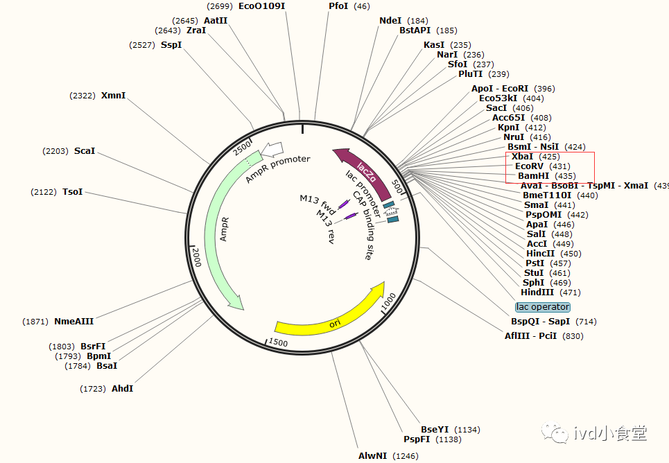 pUC57质粒图谱 高压灭菌。灭菌完成后冷却至室温待用。取一支含有液体 LB 培养基的试管置于超净工作台,先向试管中加入 千分之一培养基体积的抗生素母液(母液浓度100mg/mL Amp或者50mg/mL Kan,具体以质粒合成单为准),然后再加入 10μL 甘油菌,置于摇床中,37℃、220prm 的条件下过夜培养。次日取出用于质粒提取。 培养 6h 的菌体。置于-70℃冰箱保藏。 大瓶液体LB培养基 (1)-70℃保存的大肠杆菌克隆菌株(DH5α,TOP10等)划线于无抗性LB平板,37℃培养过夜。次日挑单克隆于5mL液体LB培养基,37℃震荡培养过夜。 (2)按1%接种量,接种于50mL液体LB培养基,37℃震荡培养至OD600=0.2~0.5。 (3)将培养好的菌液转移至灭菌离心管,4℃,4000prm,离心20min。 (4)用20mL冰浴的Cacl2(0.1M)轻轻重悬菌体,然后冰上放置30min。 (5)4℃,4000prm,离心20min,弃上清。 (6)用3mL冰浴的含30%甘油的Cacl2(0.1M)重悬菌体,在冰上放置1~2h,期间每隔30~40min轻摇离心管避免菌体沉淀。 (7)每管200μL分装于1.5mL离心管(灭菌、预冷),液氮速冻后转入-70℃冰箱保存或者直接放入-70℃低温冰箱保存。 (2) 从-70℃ 冰箱中取出分装好的感受态细胞悬液,立即置冰上解冻。 (3) 加入质粒 DNA(一般不超过 50ng,体积不超过 10μl),轻轻摇匀,冰上放置 30 分钟。 (3)42℃ 水浴中热击 90s,热击后迅速置于冰上冷却 3-5 分钟。 (4)向管中加入 1 ml无抗LB 液体培养基或者SOC培养基,混匀后 37℃ 振荡培养 1 小时,使细菌恢复正常生长状态。 (5)将上述菌液摇匀后取 100μl 涂布于含 Amp 的筛选平板上,正面向上放置半小时,待菌液完全被培养基吸收后倒置培养皿,37℃ 培养 16-20小时。 |