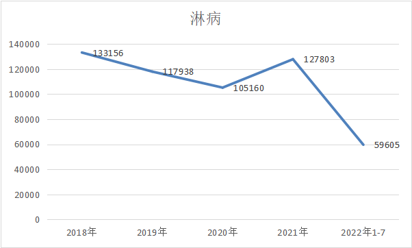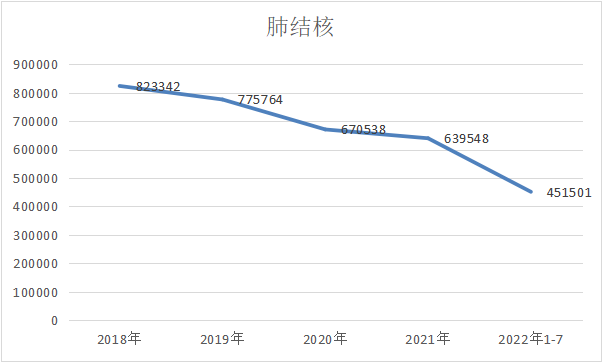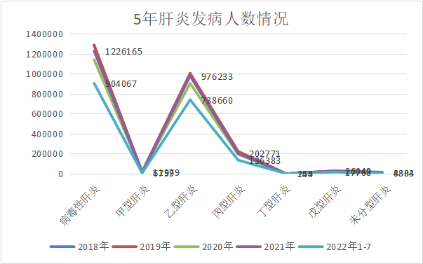 肝炎的发病人数在2020年由128万跌至113万,而后在2021年又反弹至122万,由此可见其主要受到疫情封控带来的检测下降导至的新发人数减少,从2022年1-7月的数据走势来看,也将再次回到120万+的水平。