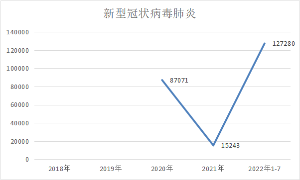 我们再来看看大家非常熟悉的新冠肺炎的发病情况,2020年全国的新冠确诊人数是8.7万,这个数字在2021年降为1.5万,但随着奥米克戎毒株的出现,2022年新冠确诊人数出现了大幅度的上升,达到了12.7万。