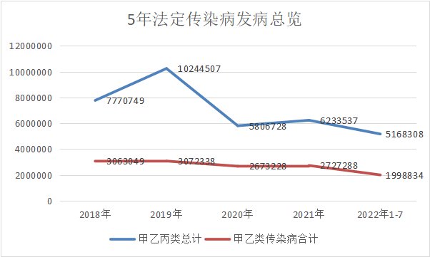 从甲乙丙三类传染病总发病人数来看,新冠3年我们法定传染病的总数呈现出下降的趋势。其中2021年有轻微反弹,2022年因为数据统计只到7月数据,预测可与2018年持平。