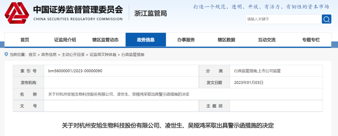 中国证监会网站1月3日公布浙江监管局下发的关于对杭州安旭生物科技股份有限公司、凌世生、吴娅鸿采取出具警示函措施的决定。 据了解,浙江证监局在现场检查中,发现安旭生物存在两项问题。一是公司2022年上半年存在部分设备未及时结转固定资产,存货跌价准备、固定资产减值、研发费用、销售费用和管理费用核算不准确的问题。二是公司存在未建立内幕信息知情人登记管理制度且未登记、用印管理不规范、付款审批不规范等公司治理问题。 浙江证监局表示,上述行为违反了《上市公司信息披露管理办法》(证监会令第182号)第三条、第四条、第三十条,《上市公司治理准则》第二条,《上市公司监管指引第5号——上市公司内幕信息知情人登记管理制度》第五条、第六条、第七条规定,公司董事长兼总经理凌世生、财务总监兼董事会秘书吴娅鸿对上述违规行为负有主要责任。 根据《上市公司信息披露管理办法》(证监会令第182号)第五十一条、第五十二条,和《上市公司监管指引第5号——上市公司内幕信息知情人登记管理制度》第十六条规定,浙江证监局决定对安旭生物及凌世生、吴娅鸿分别采取出具警示函的监督管理措施,并记入证券期货市场诚信档案。 浙江证监局要求安旭生物及相关人员应充分吸取教训,加强证券法律法规学习,提高规范运作意识,严格执行财务和会计管理制度,提高公司规范运作水平和信息披露质量,并于收到决定书之日起10个工作日内提交书面整改报告。 安旭生物于2021年11月18日在上交所科创板上市,首次公开发行股票募集资金总额为12.00亿元,扣除发行费用后,募集资金净额为10.56亿元。安旭生物最终募集资金净额比原计划多5.97亿元。该公司于2021年11月12日披露的招股书显示,其拟募集资金4.59亿元,分别用于年产3亿件第二、三类医疗器械、体外诊断试剂、仪器和配套产品建设项目、体外诊断试剂及POCT仪器生产智能化技术改造项目、技术研发中心升级建设项目、营销与服务网络体系建设项目和补充营运资金。 |