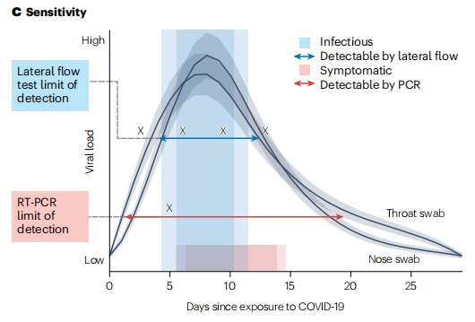 LFT的准确度,尤其是敏感性低于参考RT-PCR方法,SARS-CoV-2抗原LFT的灵敏度在34.1%至88.1%之间,总体特异性为99.6%。在分析上,快速抗原测试可以检测到病毒,其水平相当于每毫升约100000至1000000个SARS-CoV-2病毒基因组拷贝。这种敏感性和简单性之间的权衡长期以来限制了对某些病原体使用LFT。新冠肺炎抗原LFT的成功部分归因于SARS-CoV-2的病理生理学(如下图),即其潜伏期短、传播率高、病毒载量高,非常适合快速、频繁的检测。但假阴性新冠肺炎LFT检测结果仍然是一个问题,因此,LFT检测的时间和频率对于早期症状感染和筛查个体(在旅行或大规模集会之前)非常重要,因为感染者可能在前24 小时的LFT检测中呈阴性。