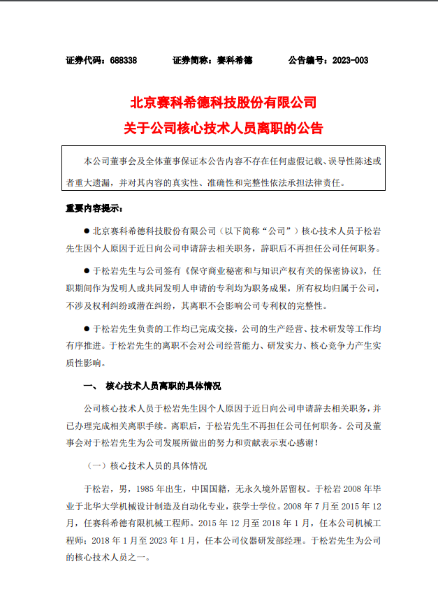 2月8日晚间,赛科希德(SH688338,股价46.79元,总市值38.13亿元)公告称,公司核心技术人员于松岩因个人原因于近日向公司申请辞去相关职务,辞职后不再担任公司任何职务。 据公告介绍,于松岩,男,1985年出生,中国国籍,无永久境外居留权。于松岩2008年毕业于北华大学机械设计制造及自动化专业,获学士学位。2008年7月至2015年12月,任赛科希德有限机械工程师。2015年12月至2018年1月,任本公司机械工程师;2018年1月至2023年1月,任本公司仪器研发部经理。于松岩为公司的核心技术人员之一。 截至公告披露日,于松岩直接持有公司股份122,461股,占公司股份总数的比例为0.15%。另据赛科希德2021年财报显示,于松岩当年从公司获得的税前报酬总额为24.44万元。 公告透露,于松岩在职期间,主要负责仪器外观及结构设计,承担了SF系列部分型号凝血测试仪的机械设计工作,相关研发项目均已结题。目前已完成与公司研发团队的工作交接,其离职不会对现有研发项目进程造成不利影响。截至本公告披露日,公司已获授权专利38项,其中于松岩在任职期间参与研究并已获得授权的发明专利3项。上述专利均为于松岩作为发明人或共同发明人的职务成果,所有权均属于公司,不涉及权利纠纷或潜在纠纷,其离职不会影响上述专利的完整性。 公告强调,于松岩负责的工作均已完成交接,公司的生产经营、技术研发等工作均有序推进。于松岩的离职不会对公司经营能力、研发实力、核心竞争力产生实质性影响。 截至2020年末、2021年末、2022年末公司研发人员数量为45人、40人、48人,占员工总人数比例分别为15.96%、15.04%、17.58%,研发人员数量保持稳定。本次变动前后,公司核心技术人员具体情况如下: 据公司官网介绍,北京赛科希德科技股份有限公司位于北京市中关村科技园区,是一家血液学体外诊断领域的制造商。自成立以来一直致力于血栓与止血体外诊断领域的检测仪器及试剂的研发、生产和销售,为医疗机构提供凝血、血液流变、血沉压积、血小板聚集等自动化检测仪器及配套的试剂和耗材,是血栓与止血体外诊断领域较为领先的国内生产商。 图片来源:公司官网截图值得一提的是,公司2020年8月6日登陆上交所科创板,股价当天创下185.35元新高。随后股价一路下跌,曾一度跌至28.34元。截至发稿,赛科希德暂报47.05元,自上市以来不到三年,已跌近80%。 更要注意,近年来科创板频现核心技术人员离职现象,有的公司甚至出现上市不到一年,技术大拿辞职走人。实际上,上市公司的核心竞争力是科技人才,对于科创板而言更是如此。在IPO中,核心技术人员往往成为上交所问询的关键点之一。 据业内人士表示,对于一些技术密集型企业而言,一个核心技术人员对公司的意义可能会十分重大。如果刚上市不久就出现核心技术人员离职的情况,市场不免会对公司的持续研发能力产生质疑。公开信息来看,不少核心技术人员并未持有上市公司股份,这可能成为他们辞职的原因之一。如何深度捆绑核心技术人员的利益,考验着上市公司管理层的智慧。 “上市公司核心技术人员离职是一个正常现象。”盘古智库高级研究员江瀚曾表示,上市公司核心技术人员离职,尤其是科创板上市公司核心技术人员离职,主要原因还是行业竞争性强,对于核心技术人员的人才争夺,导至行业流动性大。 “核心技术人员对于高新技术产业相关企业而言很重要,但具体影响多大,还要看该技术人员具体负责的工作内容。”有高新技术企业的相关负责人告诉记者,企业技术线高管可能在研发团队中起到把控全局决定方向的作用,未必会对整个研发团队的研发进展起到绝对性的打击。 “从过往许多案例来看,核心技术人员离职之后知识产权、专利纠纷时有发生,上海正策律师事务所律师董毅智告诉记者,”除技术方面的问题外,核心技术人员离职还会涉及竞业禁止协议、知识产权专利方面的问题。除此之外,公司方面还可能面临核心技术人员出走丧失部分市场份额及客户的风险。 有上市公司负责人表示,虽然员工签署了竞业协议,但也可以以幕后咨询的方式从事相关工作。对于核心技术人员离职以后,是否会造成公司技术泄密,在况玉清看来,竞业协议基本可以解决这一方面的问题,不过虽然有协议限制,但公司并不能百分百把控离职人员是否违反竞业协议,因此建议公司还是尽力留住人才。 “如果企业没有足够的事业留人机制,那么很难将真正核心技术人员留下。”江瀚认为,“公司要留住技术人员,尤其是核心技术人员,不能仅仅只靠金钱或者股权激励来留人,而是要靠事业留人。” |