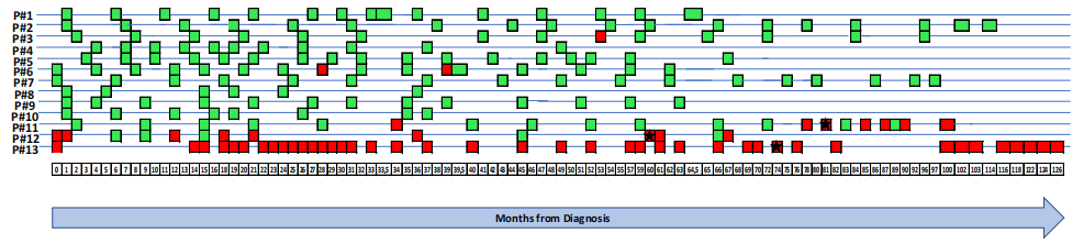 在随访期间的不同时间点,评估了所有患者样本中CK-19转录物的存在(如下图)。在十年的随访中,十名患者未出现疾病进展,其中八名(8/10,80%)患者在所有时间点均未检测到CK-19转录物。另外两名患者(Pt#3、Pt#6)在1或2个时间点被发现CK-19转录物阳性。随访期间未出现疾病进展的所有10名患者中,仅在3/135(2.2%)个测试时间点检测到CK-19转录物。