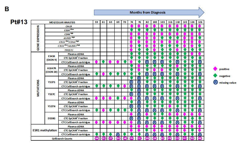 研究团队对13例早期可手术乳腺癌症患者的外周血进行了为期十年的多个时间点的全面液体活检分析,包括:(a)使用CellSearch系统进行CTC计数,(b)使用免疫荧光对CTC进行表型分析,(c)基因表达分析,在EpCAM(+)CTC中检测CK-19、CD24、CD44、ALDH1和TWIST1,(d)EpCAM(+)CTC和相应血浆ctDNA中PIK3CA和ESR1突变的分析,以及(e)CTC中ESR1的DNA甲基化。在整个随访期间,10/13(77%)患者发现外周血中的LB标记物呈阴性,这些患者在随访期间没有复发。然而,3/13(18%)的至少一种LB标志物阳性患者在随访期内复发。即使同一患者在不同的时间点,CTC的分子特征也有很大的差异,并且在临床复发之前总是增加。结果表明,液体活检可以在临床上可检测到的转移性疾病出现之前至少4年发现MRD的存在,这表明全面的液体活检分析为乳腺癌症患者的治疗管理提供了非常重要的信息。